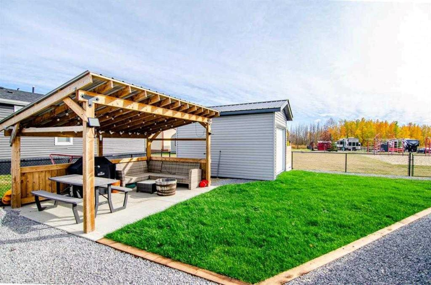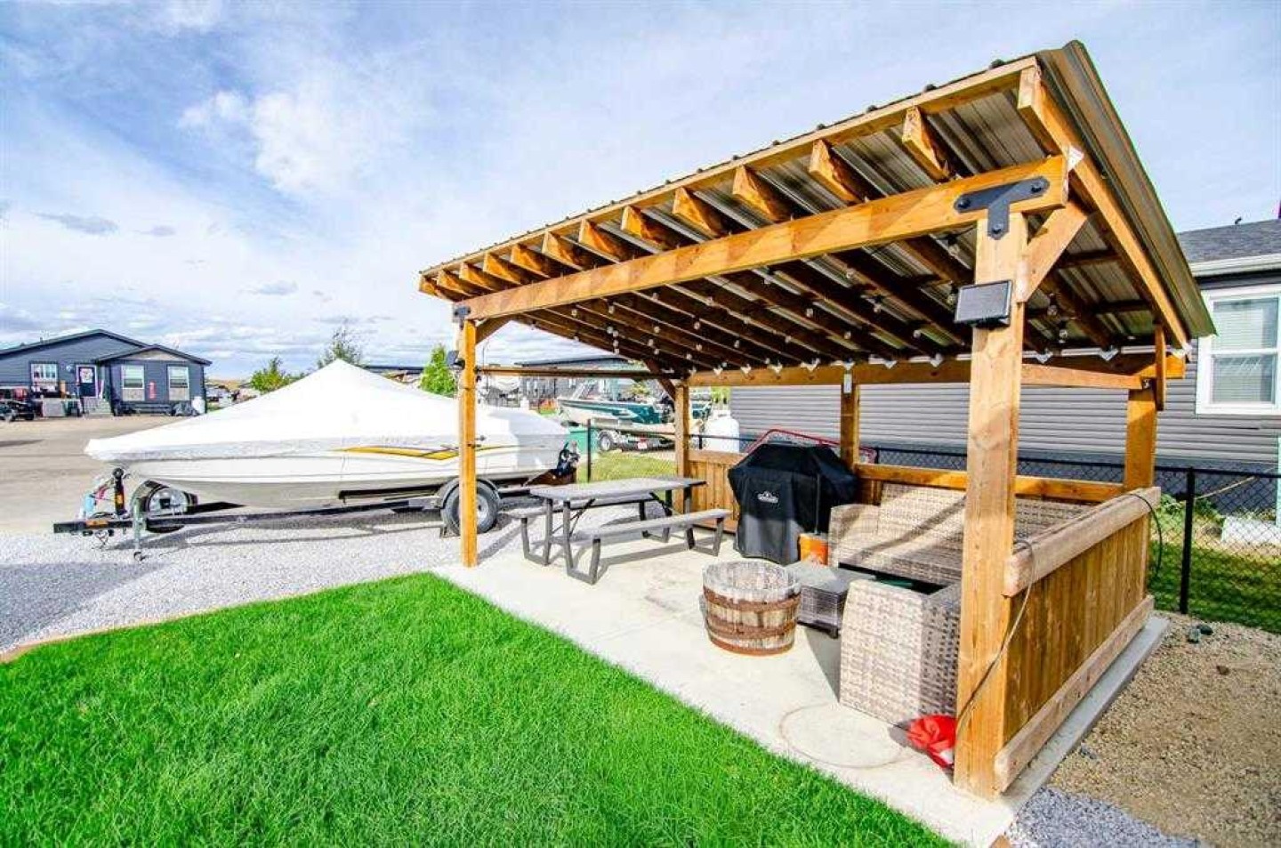 One and only piece of paradise! It comes with it all - you will not find anywhere else! Life at the Lake is relaxing and fun at the same time! This gated community has everything you need and more! Enjoy all the outdoor activities that come along with Winter and Summer! Life at Gull Lake is great and fun: Go boating, fishing, (golfing in the future), walking, swimming, ice fishing, skating, snowshoeing or country skiing with the kids on the lake or pond and enjoy the great outdoors! This lot is in Phase 3, which means you are within walking distance to most of the amenities that the resort has to offer and in the centre of attention. Resort includes: Community gazebo with fire pit, changing rooms, showers and bathrooms, golf course (coming soon), driving range, playground. Marina is available for rent at additional cost plus (depends where) for a season May to September. All of this is just a 35 minute drive from Red Deer, 20 minutes to Lacombe and 5 minutes to Bentley! This immaculate lot is pie shaped - has already set up, a shed, and small deck and A BRAND NEW GAZEBO! Easy to park a large trailer which can stay here all winter. This recreational property is one of the best and priced reasonably considering that after golf course if ready to go they may increase!! Perfect way to enjoy the way it is or to build your future mini home (park model/mobile). Located close to the games center and the community gazebo. Perfect for relaxing after a long day of work. There is a double graveled parking spot for your vehicles to park. Condo fee includes water, sewer, garbage as well as grass maintenance except for weed control. Pets are welcome with approval; they have to be contained, secured and on the leash when walked. Some restrictions apply regards to building (size) and improvements. All located on the pavement all set up and ready to move in. Beautiful Sandy Beach that is maintained by the county, just outside the gate. Great community to enjoy the summer in! Put this one on your list! Extensive landscaping recently done is on the last 2 photos.