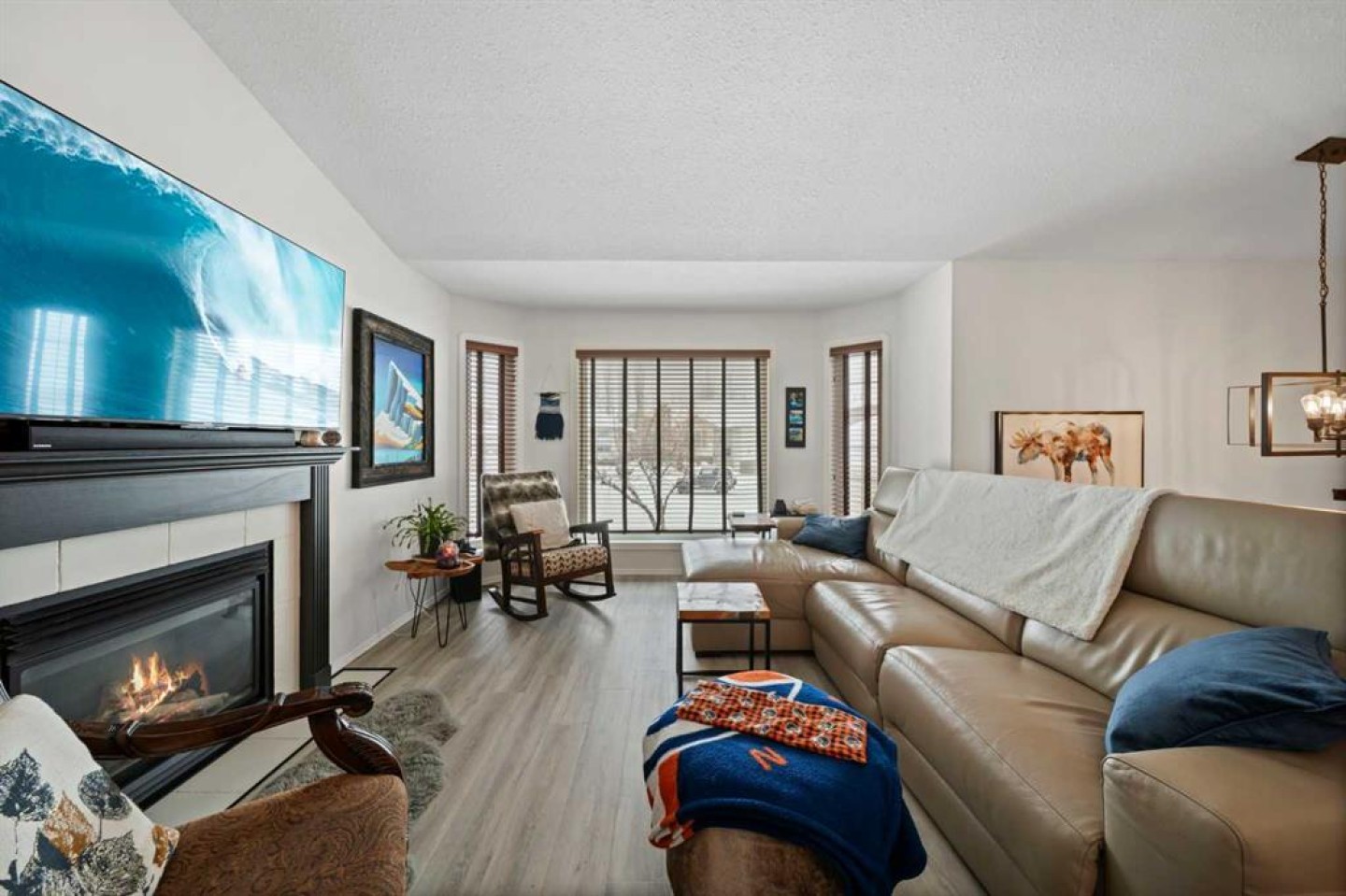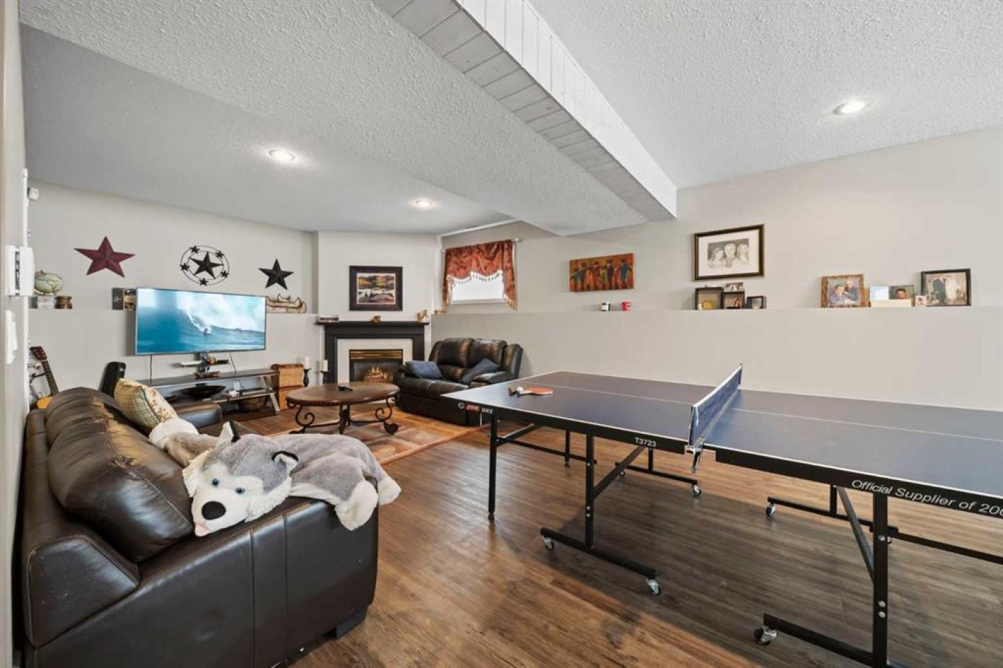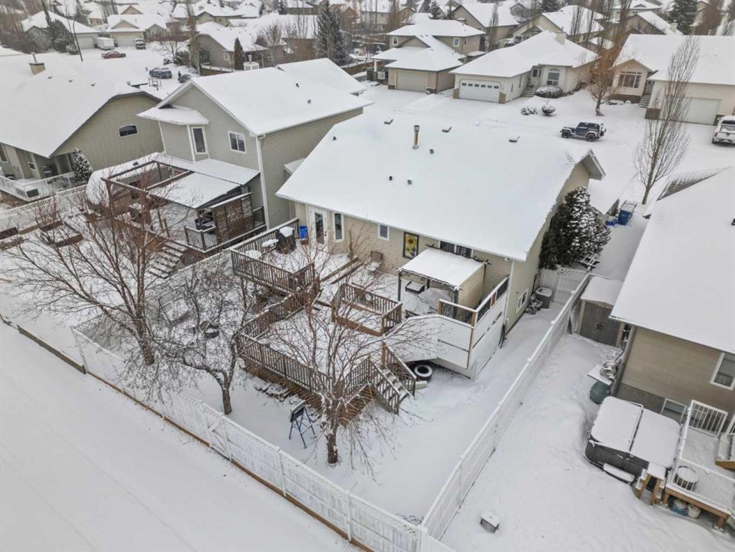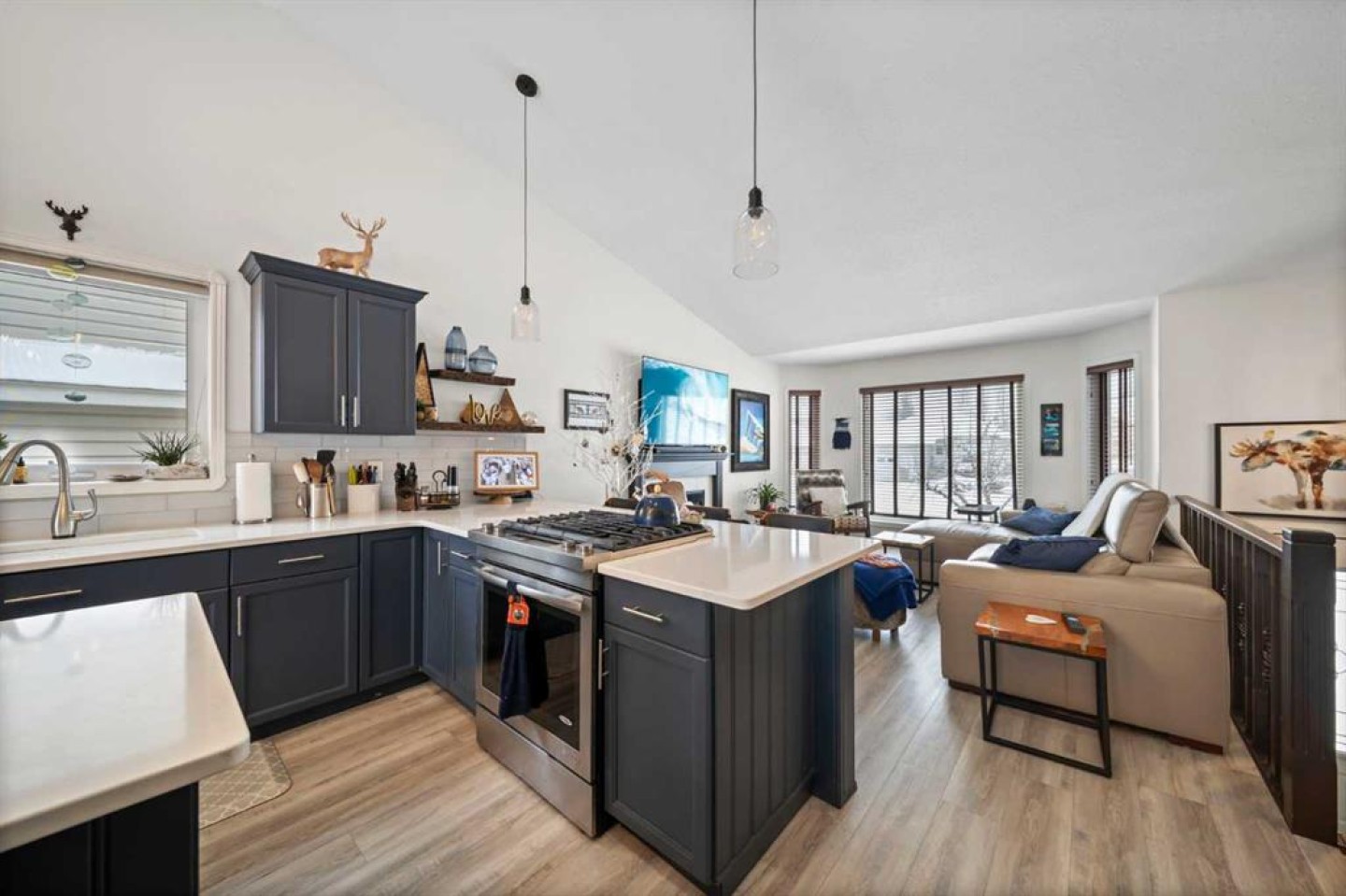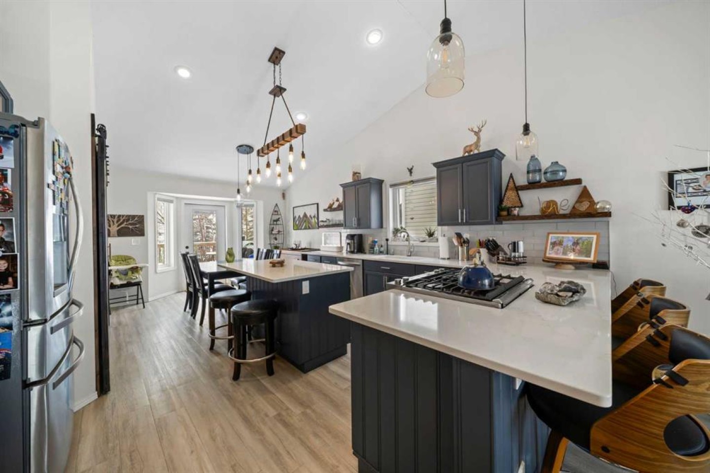 Tucked away in sought after Ander's on the Lake, this spotless 5 bedroom bi level is the total package. Step inside to soaring vaulted ceilings and a bright, open layout that makes everyday living and entertaining effortless. The kitchen and main living area shine with updated hardwood and tile, creating a warm yet modern feel throughout. Off the dining area, garden doors open to a stunning three tier deck overlooking a beautifully landscaped, fully fenced yard with a lower patio and fire pit for unforgettable summer nights. The inviting living room features a cozy gas fireplace, while the primary suite offers a walk in closet and private 3 piece ensuite. Downstairs, you will love the impressive 9 foot ceilings, spacious family room with another gas fireplace, dedicated games area, two additional bedrooms, and a full bath. Space, comfort, and a prime location all come together in one incredible home.