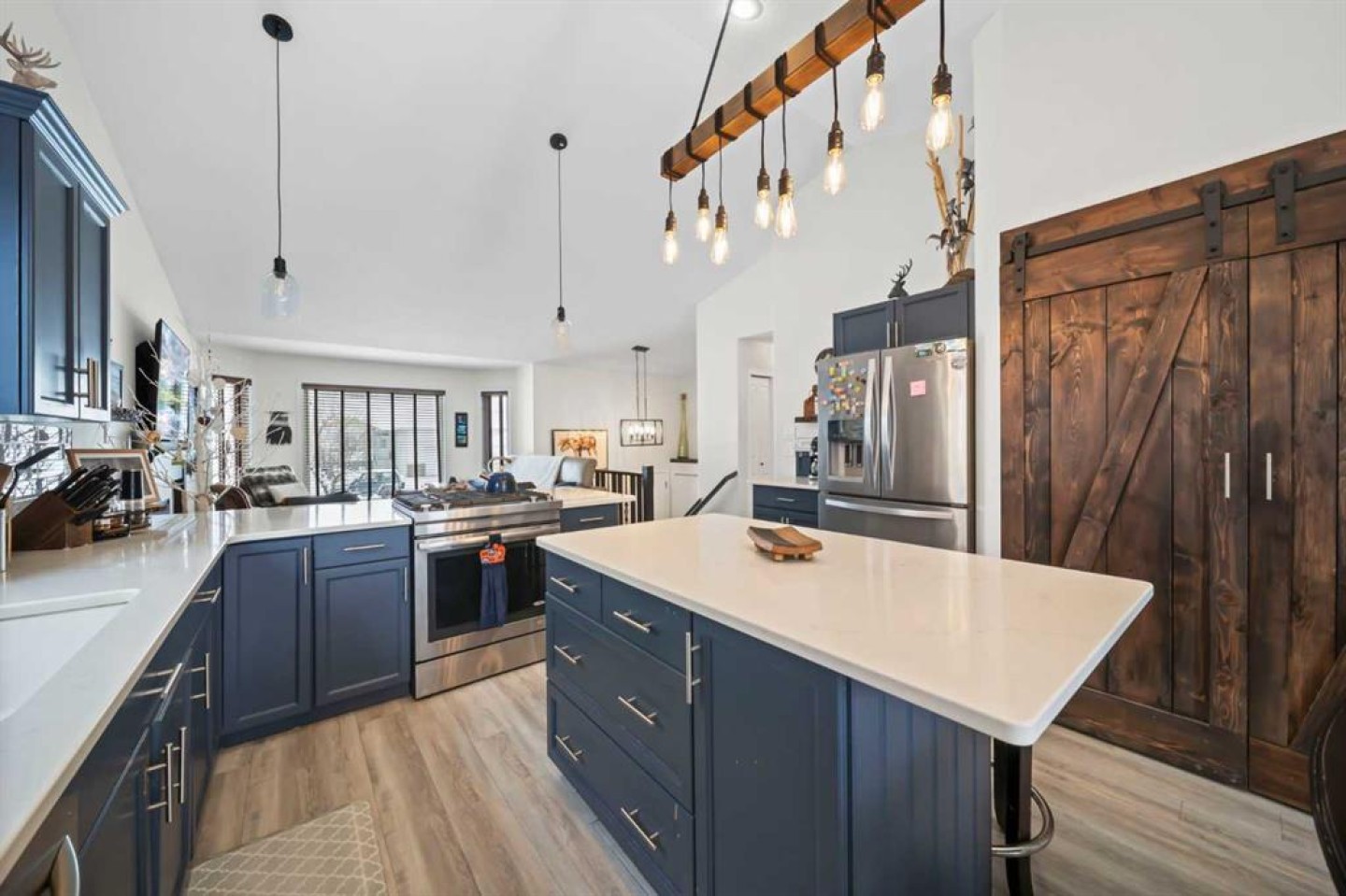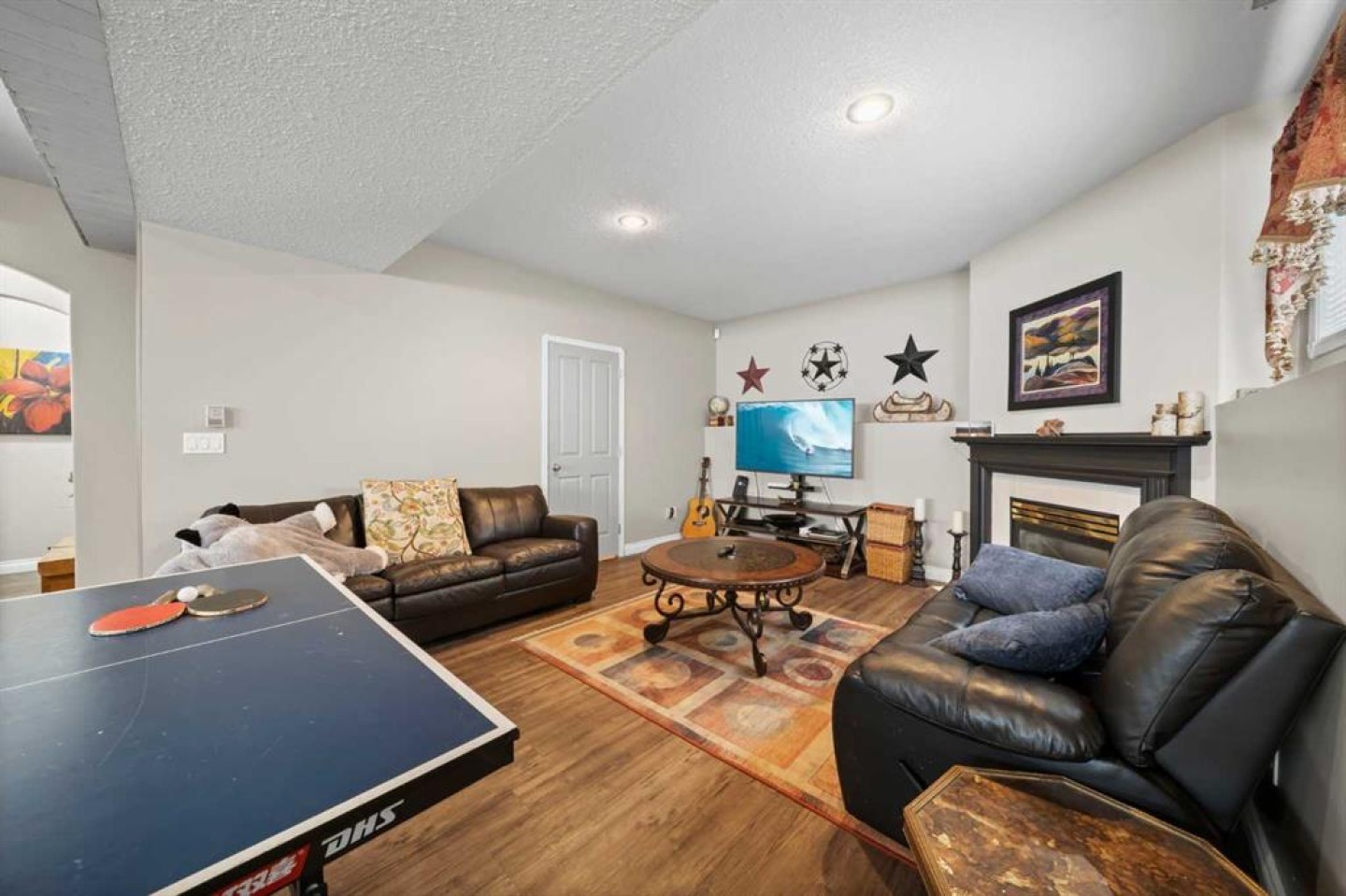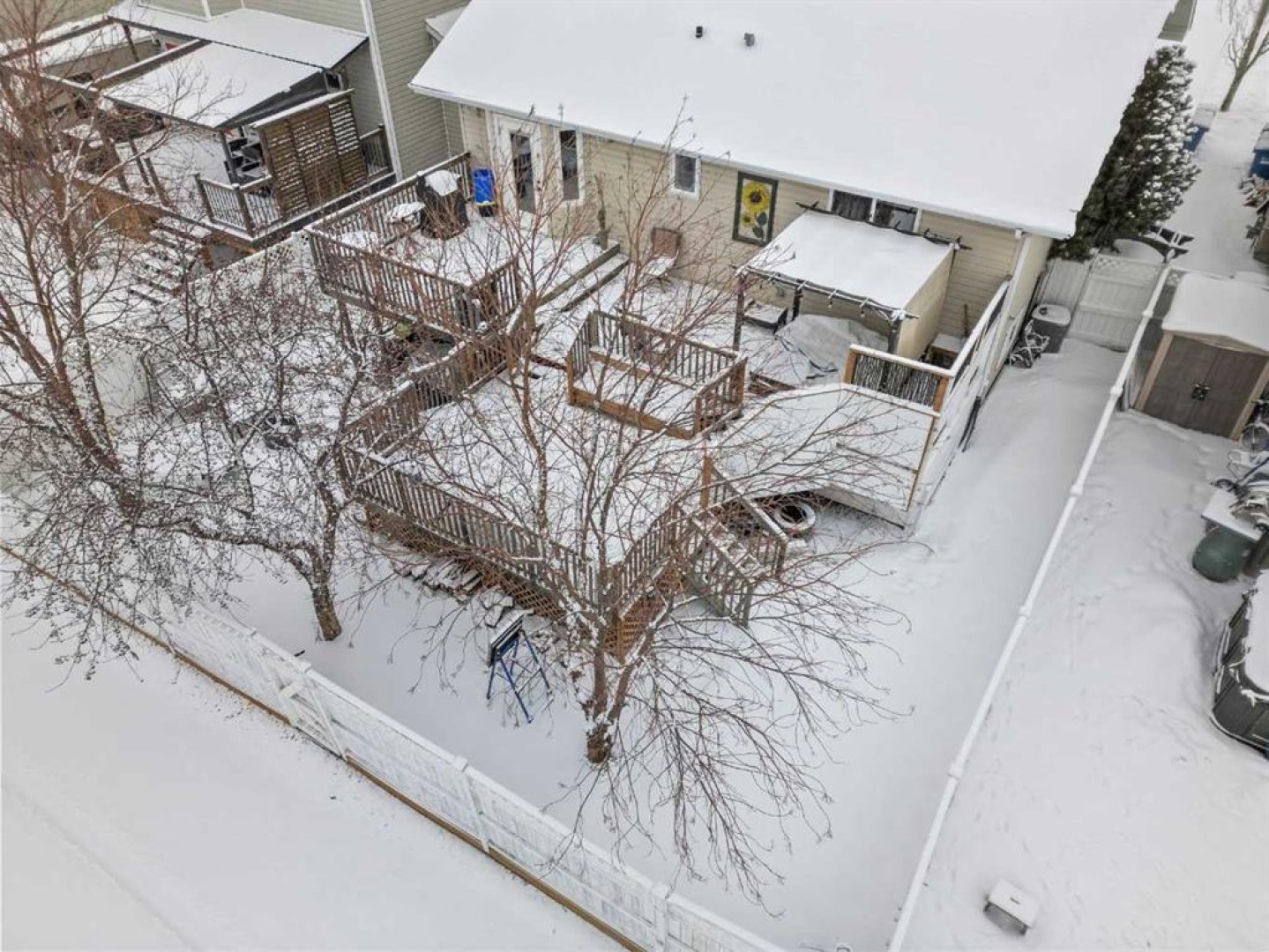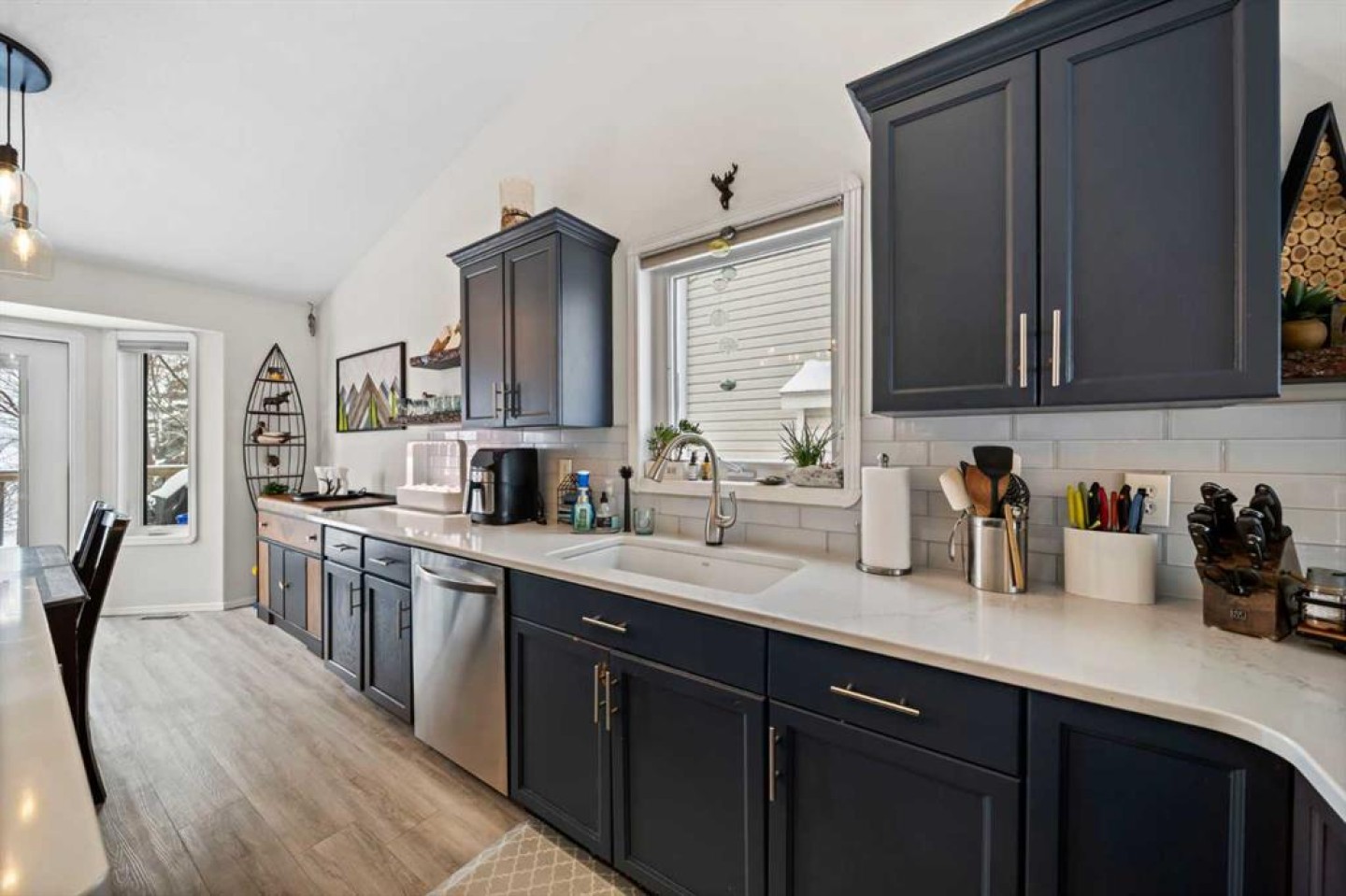 Tucked away in sought after Ander's on the Lake, this spotless 5 bedroom bi level is the total package. Step inside to soaring vaulted ceilings and a bright, open layout that makes everyday living and entertaining effortless. The kitchen and main living area shine with updated hardwood and tile, creating a warm yet modern feel throughout. Off the dining area, garden doors open to a stunning three tier deck overlooking a beautifully landscaped, fully fenced yard with a lower patio and fire pit for unforgettable summer nights. The inviting living room features a cozy gas fireplace, while the primary suite offers a walk in closet and private 3 piece ensuite. Downstairs, you will love the impressive 9 foot ceilings, spacious family room with another gas fireplace, dedicated games area, two additional bedrooms, and a full bath. Space, comfort, and a prime location all come together in one incredible home.