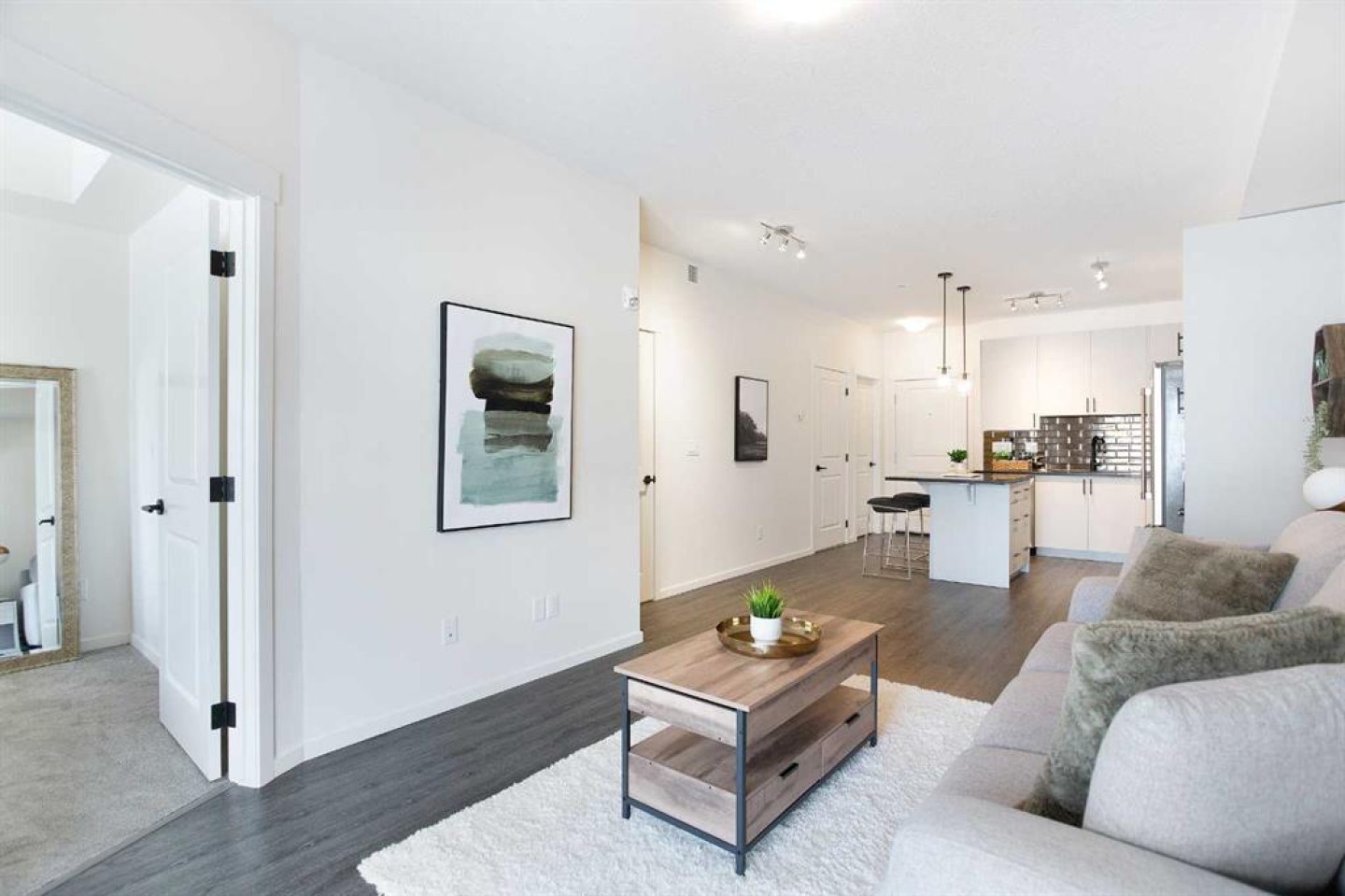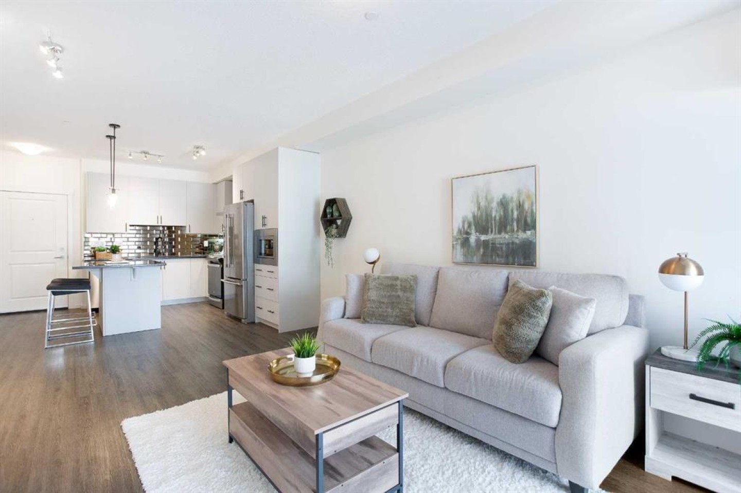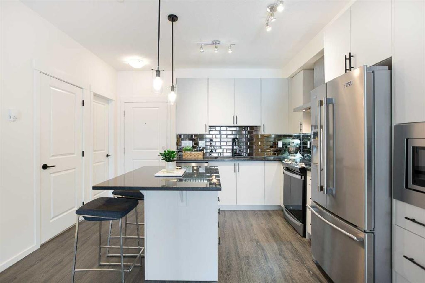 Welcome to this 1 bedroom former showhome unit that truly shows pride of ownership. The open layout features a spacious kitchen with an upgraded island, backsplash, chimney hood fan, built-in microwave, stainless steel appliances, and stone countertops. Black plumbing fixtures and door hardware give it a clean, modern feel throughout. You’ll appreciate the large walk-in entry closet, in-suite laundry, 9-foot ceilings, vinyl plank flooring, upgraded tile, and the added bonus of a Daikin air conditioner for year round comfort. The walk out patio is generously sized and includes a BBQ gas line, perfect for relaxing or entertaining. The building is pet-friendly, and the easy walk-out access makes it especially convenient for dog owners. This home has been exceptionally well maintained and also comes with a titled underground parking stall and assigned storage locker. All of this in a fantastic location within walking distance to shopping, restaurants, and everyday amenities. A great opportunity you won’t want to miss.