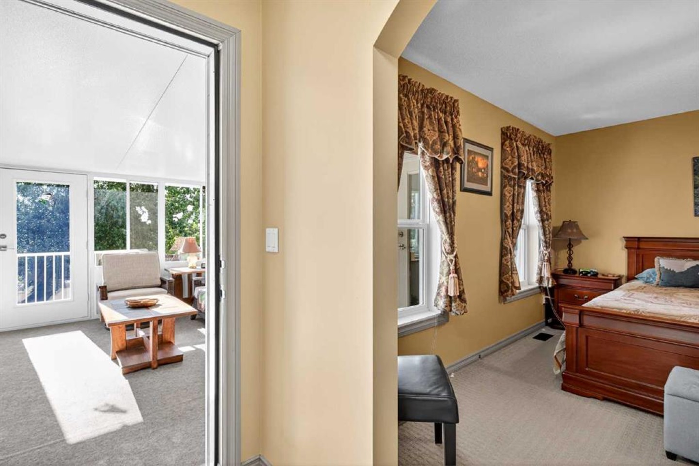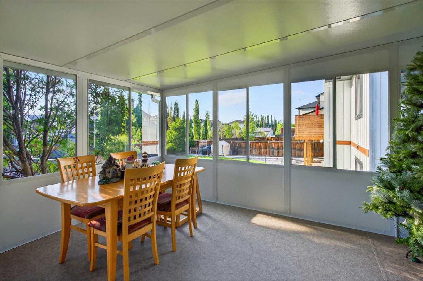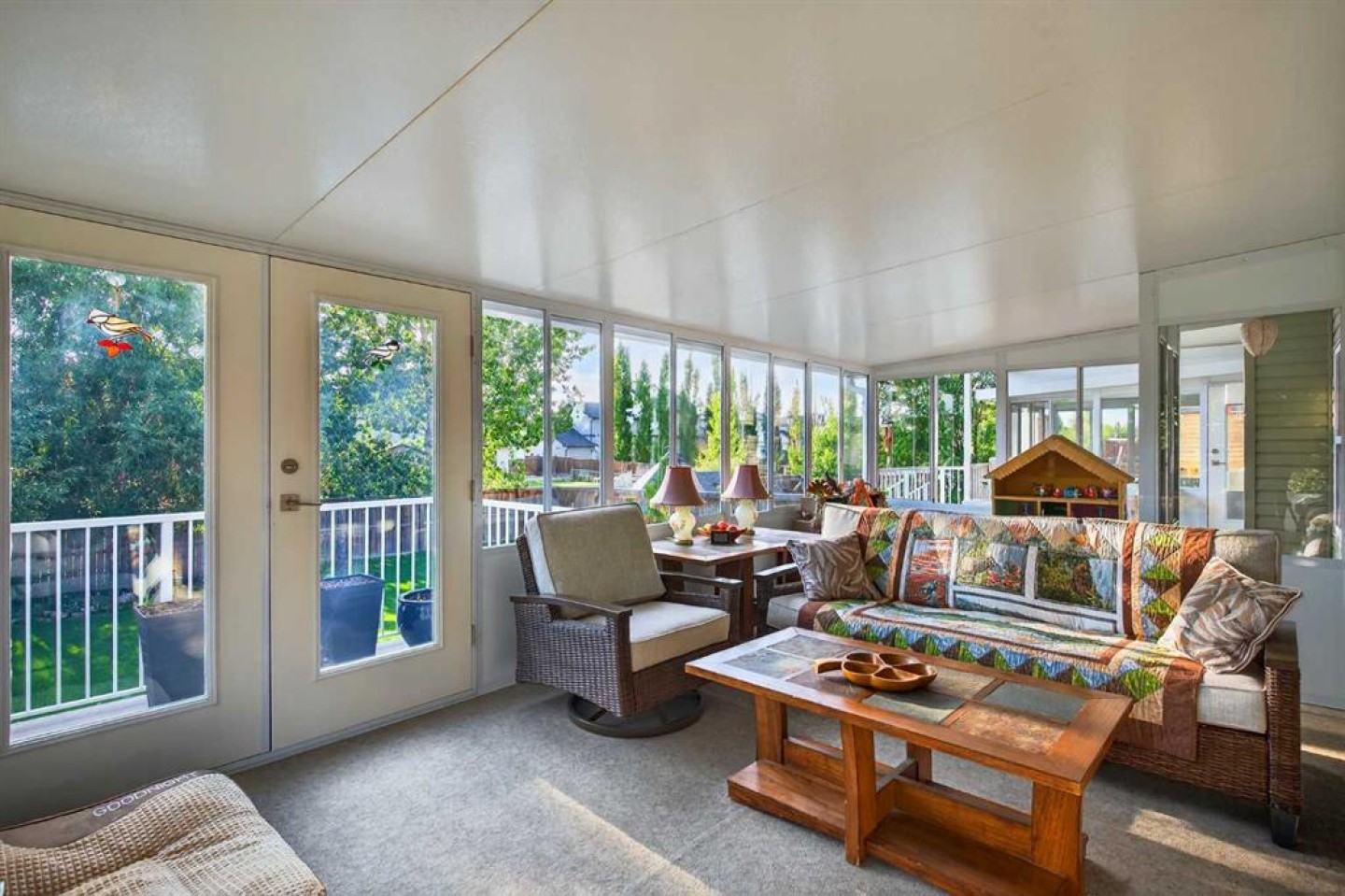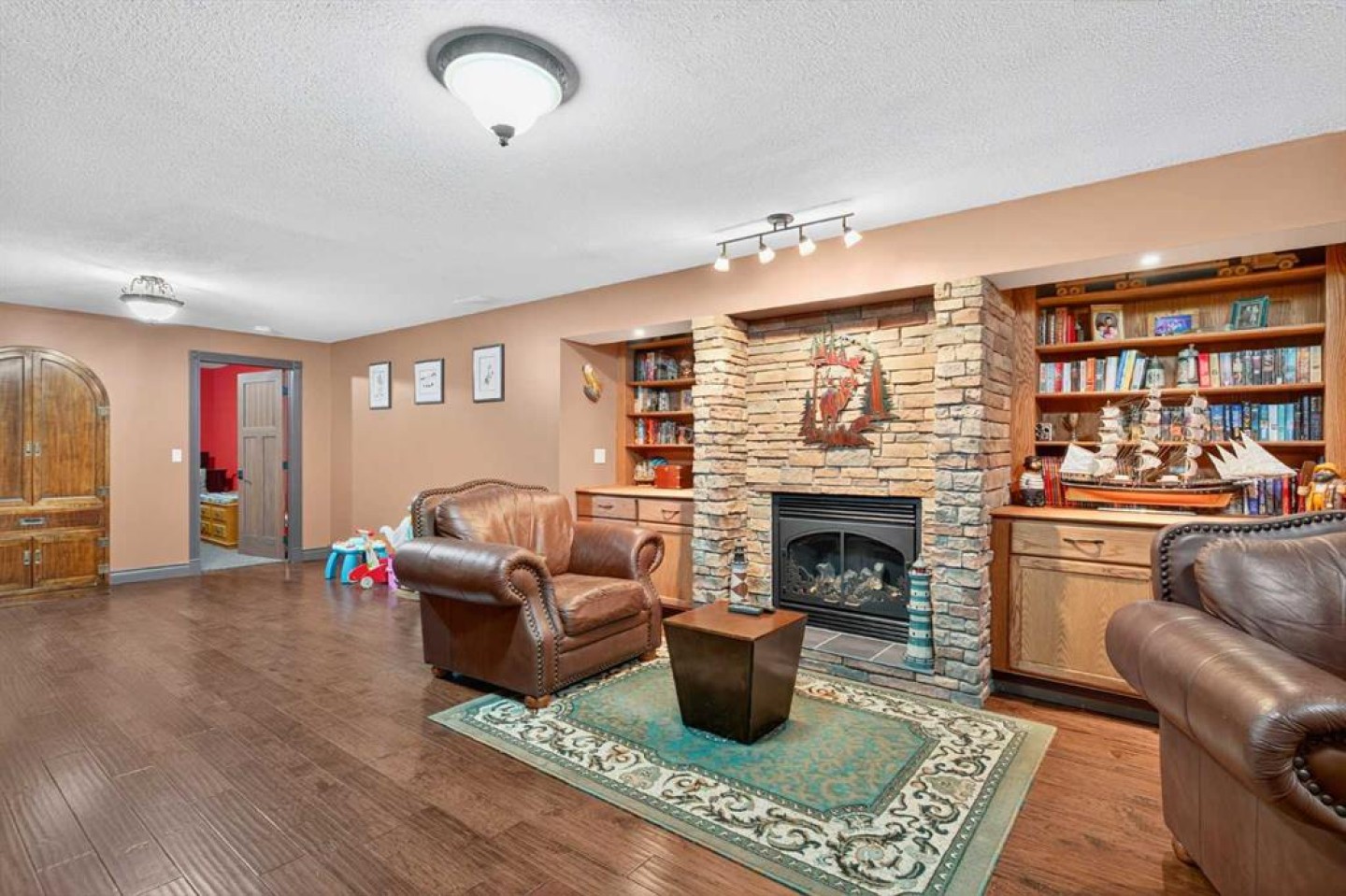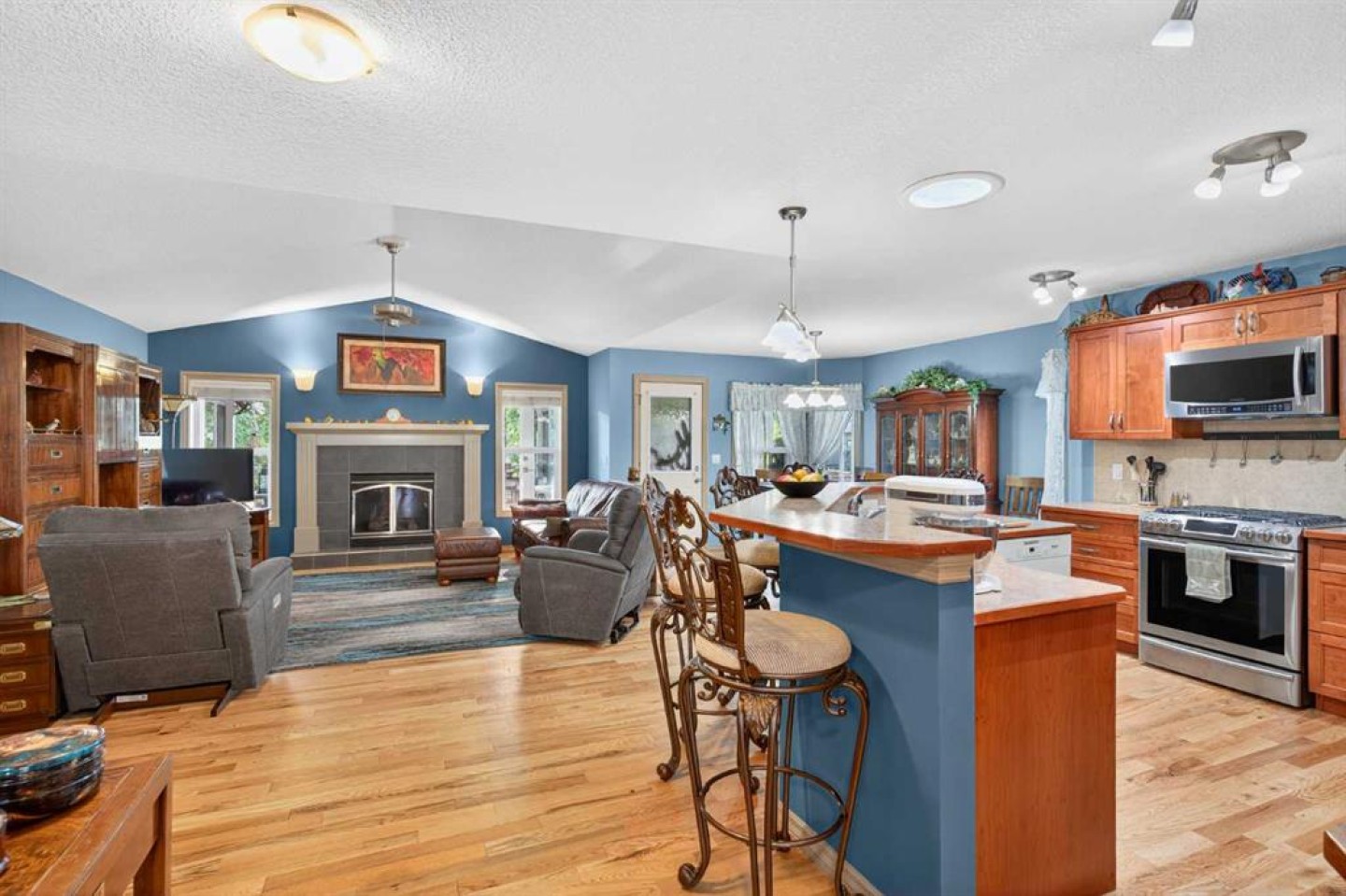 125 Copeland Close, Langdon - where space, sunshine, and small-town charm come to meet. Loved by the same family since they had it built, this 1523 sq ft bungalow is set on a massive, beautifully landscaped, sunshine lot that's ready for year-round gatherings. Imagine morning coffee on a large front porch and relaxing in the evenings in one of two, large, 3 season sun rooms. Enjoy grilling on a natural gas BBQ (included),or gathering round a fire pit on a 23 ft circular cement pad. Two 1,000 litre rain collection tanks under the deck, plus a custom built shed makes gardening easy. Inside the main floor features new hardwood, fresh paint,a bright kitchen with a solar light, and a large walk-in pantry with an upright freezer included. The kitchen boasts a 1 year old fridge/freezer, a gas stove with 220 V power behind and a built in microwave above. The super quiet dishwasher, and trash compactor complete the thoughtful extras. 4 island height bar stools are included. The main floor laundry has a new washer and dryer. The main floor 3 piece bathroom is conveniently located with garage access. The main floor also features a bright, versatile office — perfect for working from home, running a small business, or creating a quiet homework space. With its convenient location near the front entrance, it offers both privacy and easy access for clients or guests, without disturbing the rest of the household. The oversized primary bedroom has a walk-in closet, 4 piece ensuite bath, and access to one of the sunrooms. The basement is completely developed with family comfort and entertainment in mind. There are 2 large bedrooms, each with custom features and a generously sized 4 piece bath. There is a craft room and large family room with wet bar and bar fridge included. One of two natural gas fireplaces complete this well planned space. The oversized attached garage is a handyman's dream with built in cabinets, 220 V wiring, and counter top work space.