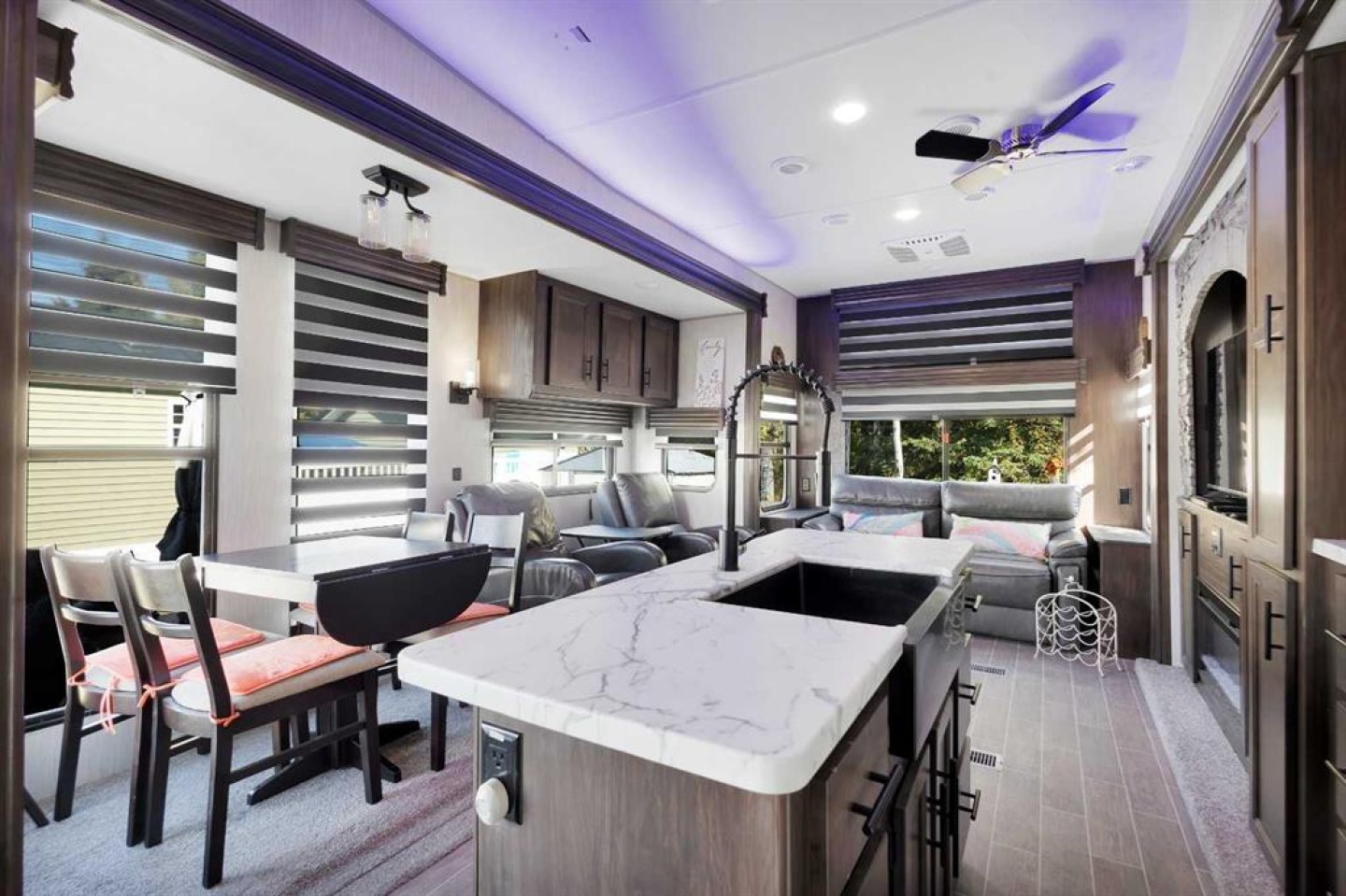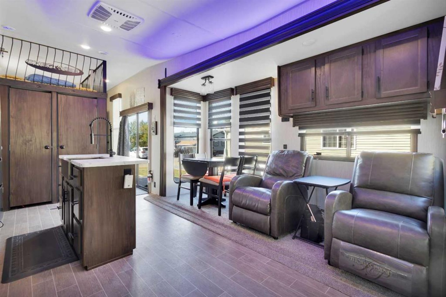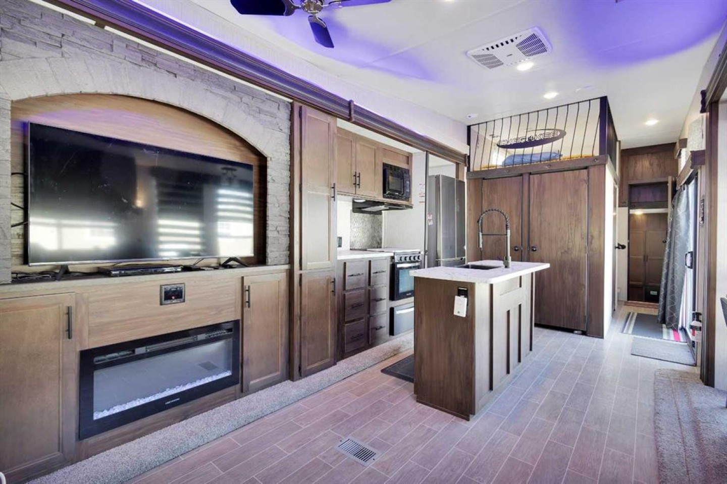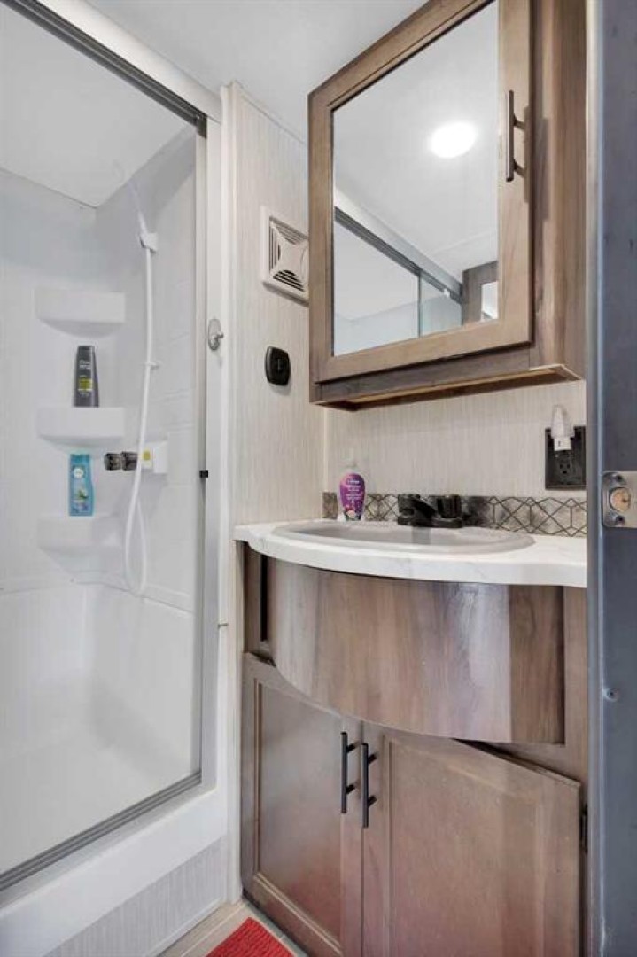 looking for a getaway that’s equal parts cozy retreat and family adventure basecamp? This recreational lot in the gated, family-friendly community of DeGraff’s Resort at Gull Lake has everything you need to make lake life easy and fun. Included is a 2021 Destination Trailer, 42 feet long with 124x42 sq ft of living space, that feels more like a stylish tiny home than a camper. Step inside this and find a private bedroom and two cozy lofts, along with a full three-piece bath for comfort after a day outdoors. The inviting living room features an electric fireplace with a mantle and TV above, perfect for relaxing evenings. A stylish kitchen offers laminate counters, a convenient breakfast bar, and a charming nook for a small dining table framed by large windows that fill the space with natural light.