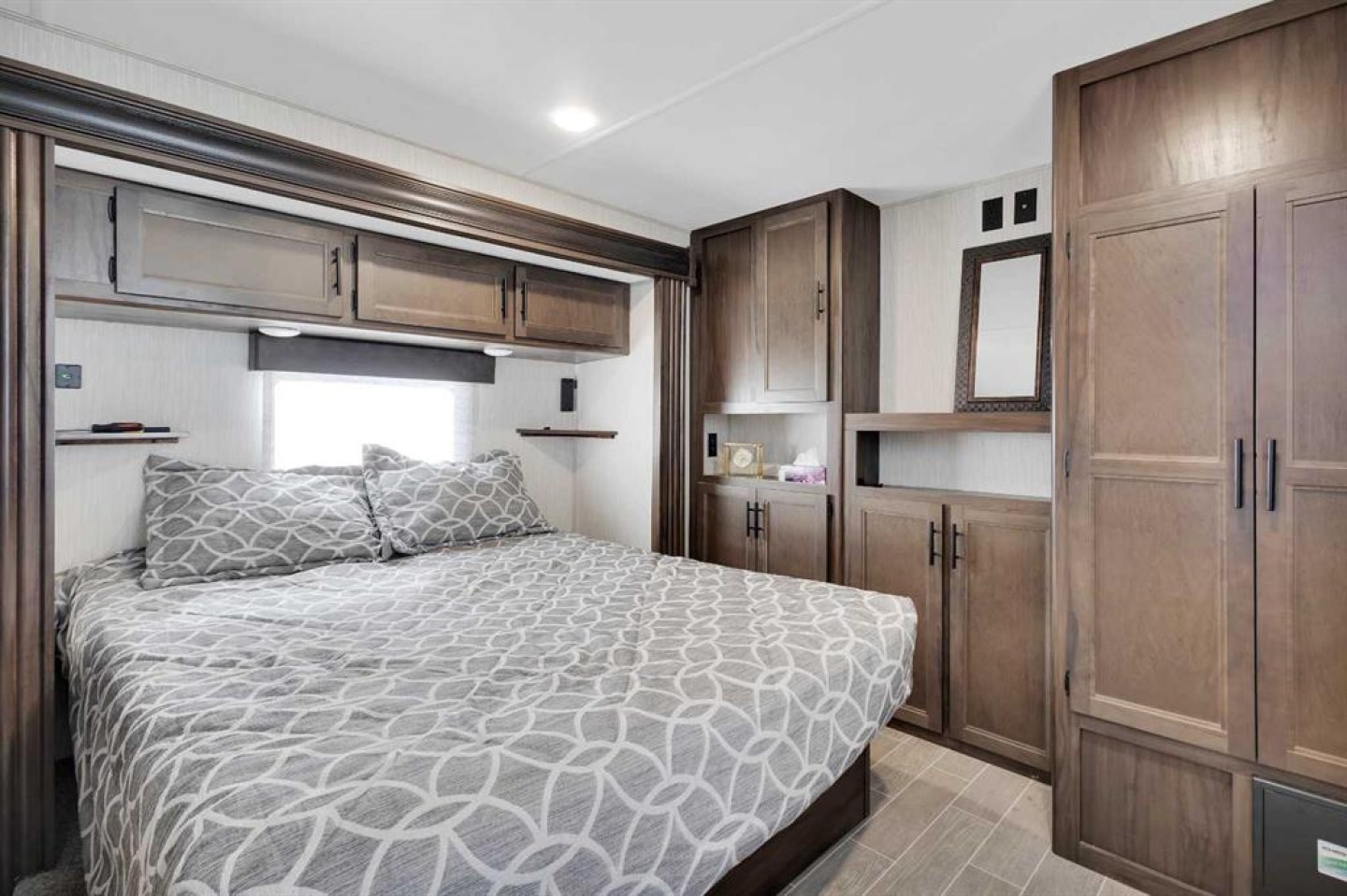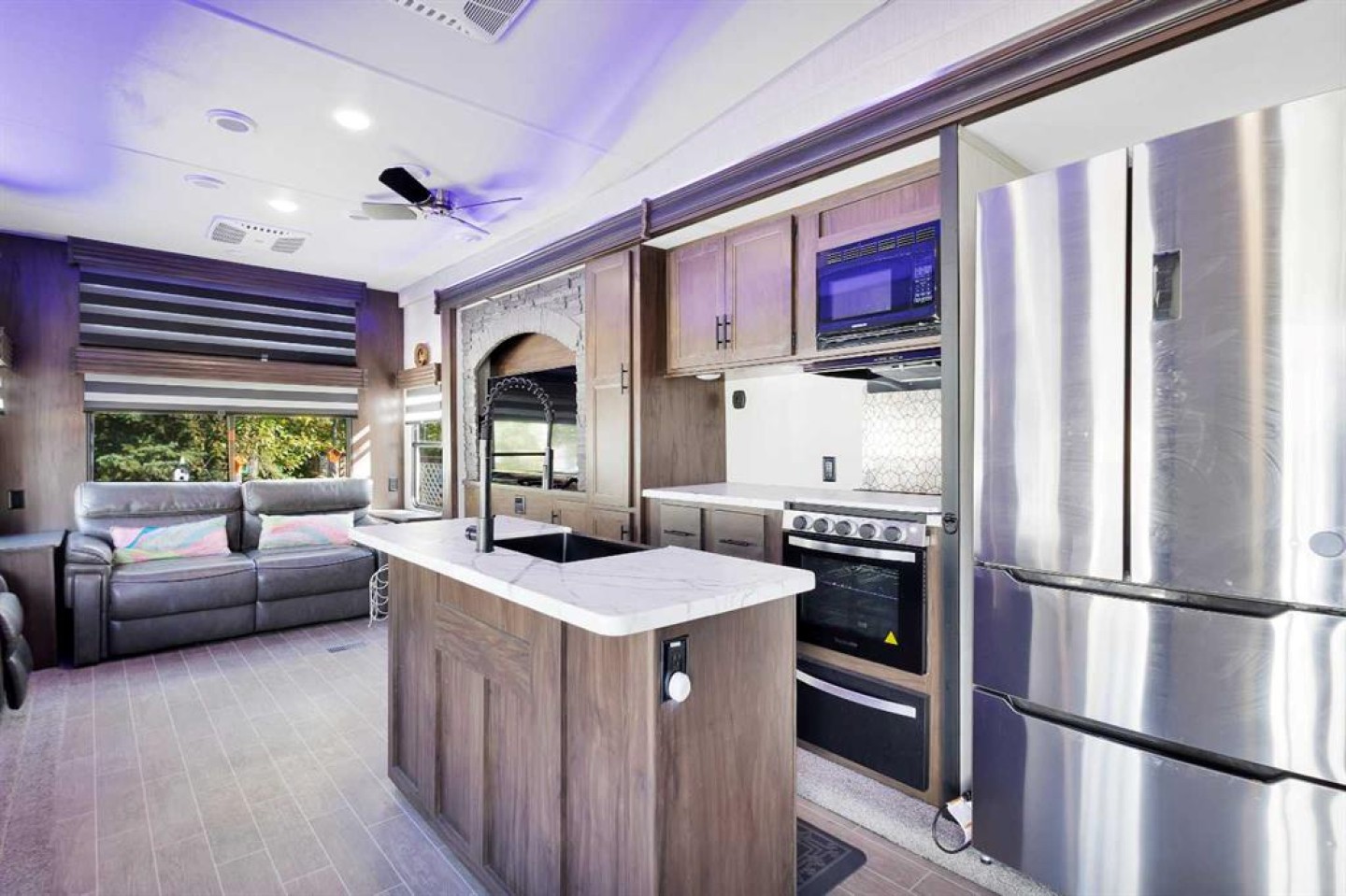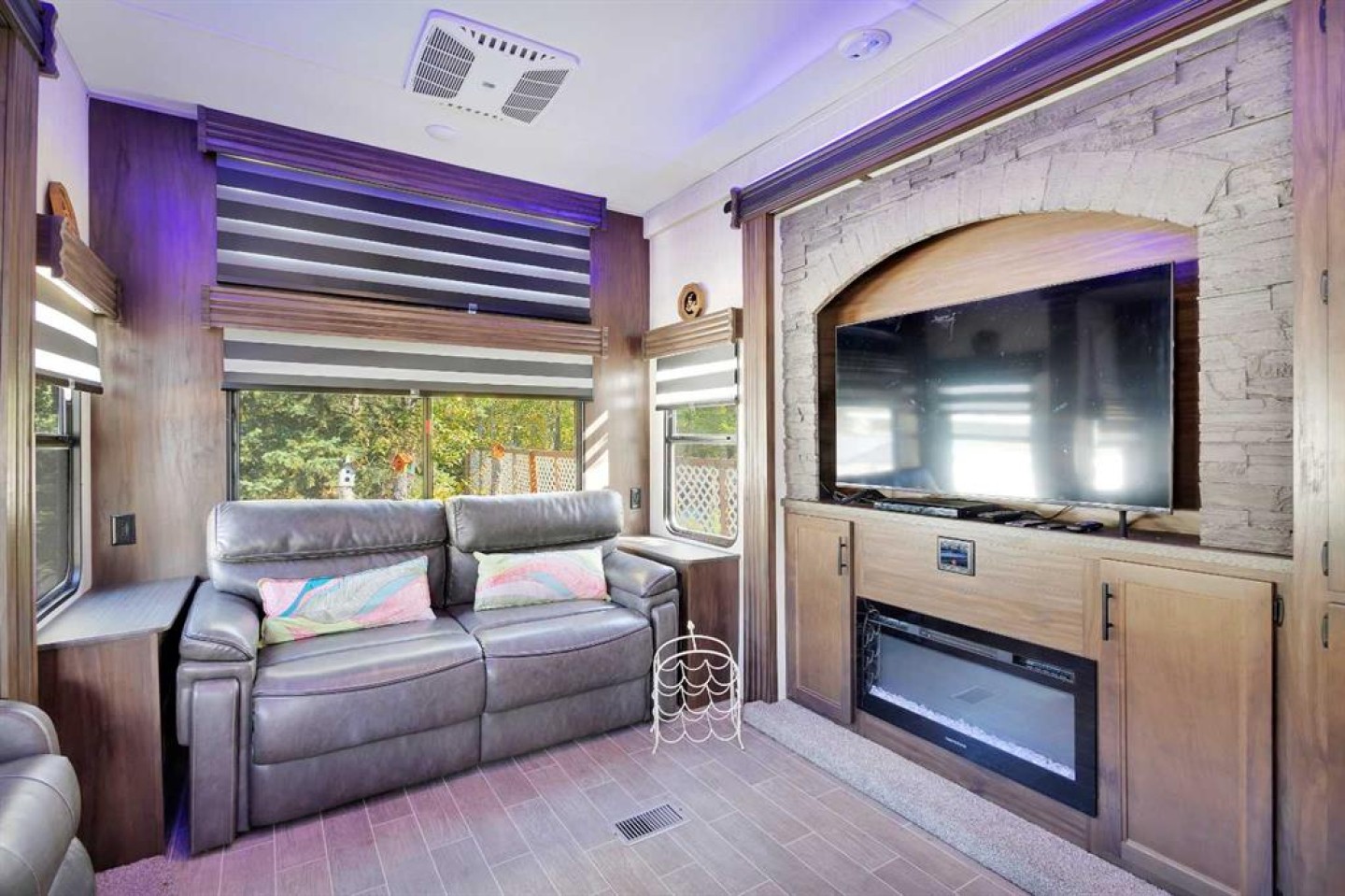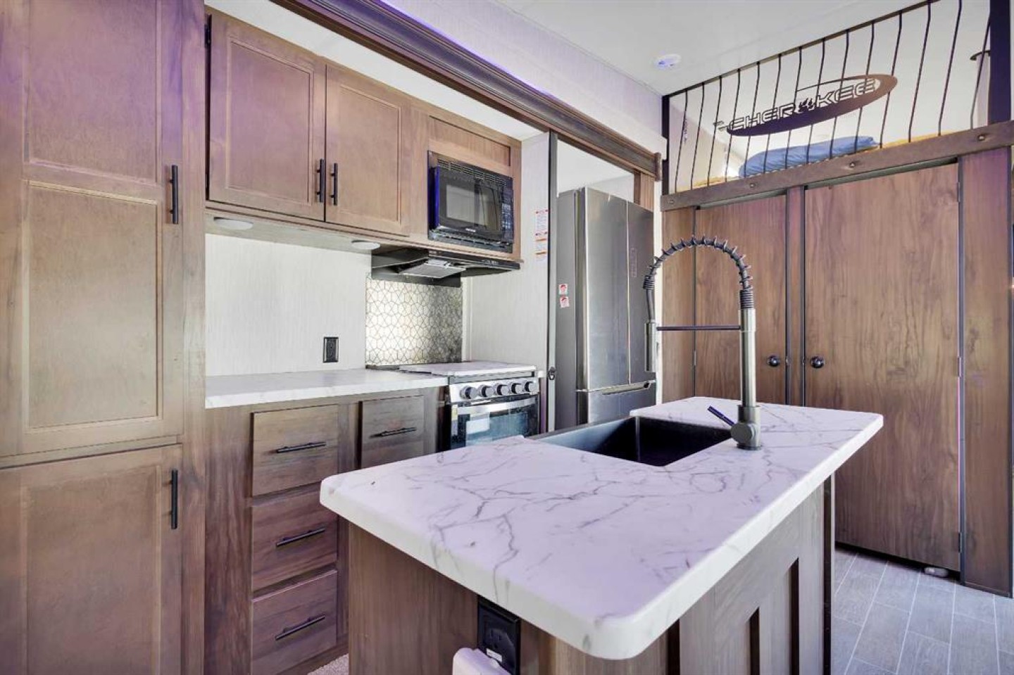 looking for a getaway that’s equal parts cozy retreat and family adventure basecamp? This recreational lot in the gated, family-friendly community of DeGraff’s Resort at Gull Lake has everything you need to make lake life easy and fun. Included is a 2021 Destination Trailer, 42 feet long with 124x42 sq ft of living space, that feels more like a stylish tiny home than a camper. Step inside this and find a private bedroom and two cozy lofts, along with a full three-piece bath for comfort after a day outdoors. The inviting living room features an electric fireplace with a mantle and TV above, perfect for relaxing evenings. A stylish kitchen offers laminate counters, a convenient breakfast bar, and a charming nook for a small dining table framed by large windows that fill the space with natural light.