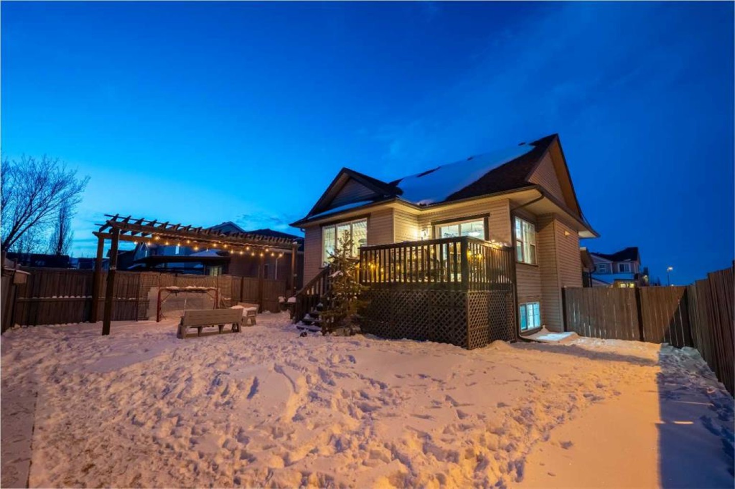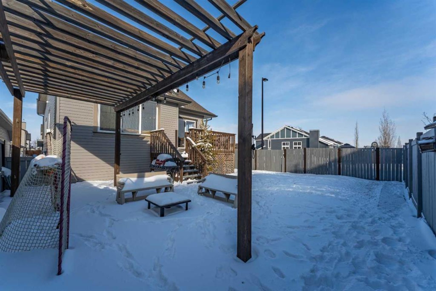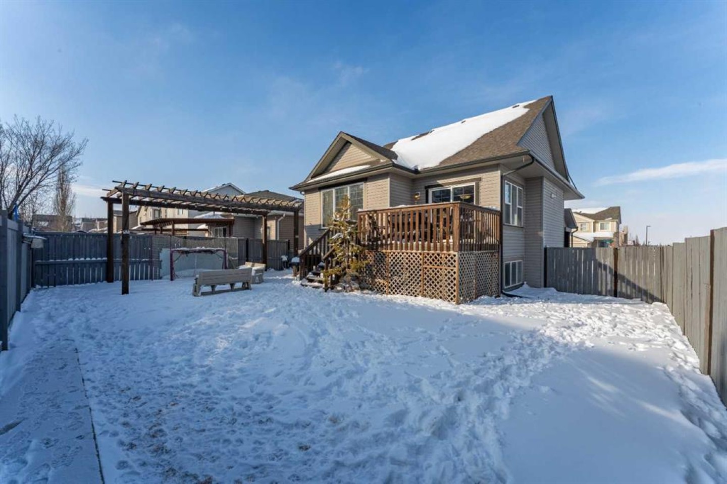 Welcome to this beautiful custom bi-level home located on a desirable corner lot in the family-friendly community of Sagewood in Airdrie. With a sunny south-facing backyard complete with a charming pergola, this home offers the perfect setting for relaxing or entertaining outdoors. The spacious front entrance greets you with soaring ceilings, creating a bright and inviting first impression. The thoughtfully designed main floor features three bedrooms and two full bathrooms, including a generous primary suite that easily accommodates a king-sized bed, along with a walk-in closet and a luxurious 4-piece ensuite showcasing a separate corner soaker tub and standalone shower. Just a few steps down are two well-sized secondary bedrooms and an additional 4-piece bath. The open-concept kitchen, dining, and living areas are ideal for modern family living, highlighted by a large kitchen island with breakfast bar, a corner gas fireplace in the living room, and a dining space spacious enough for everyday meals or hosting guests. Abundant windows throughout the main floor flood the home with natural light. The fully developed basement adds even more functional space with a fourth bedroom, full bathroom, expansive rec room, dedicated games area, laundry room, and ample storage including additional space under the stairs. Completing this exceptional property is a double attached garage. This well-designed home truly offers the right space in all the right places for comfortable family living.
