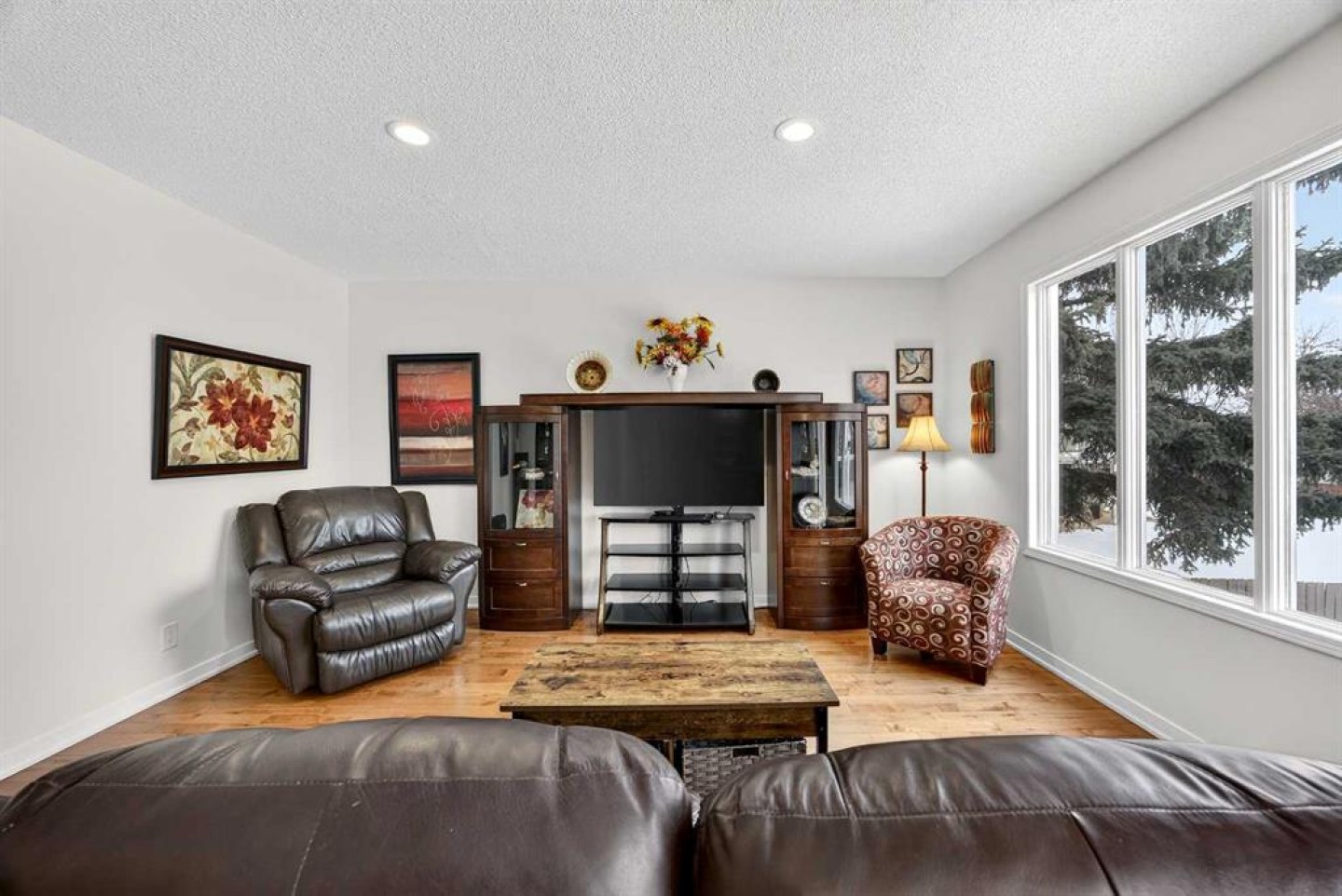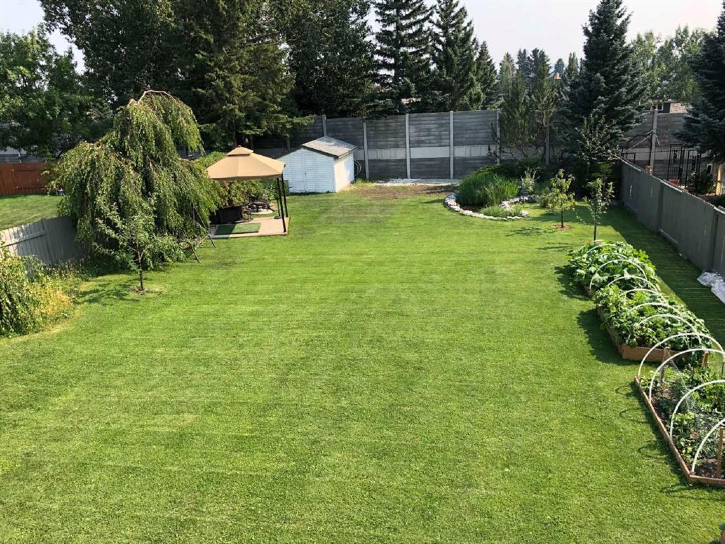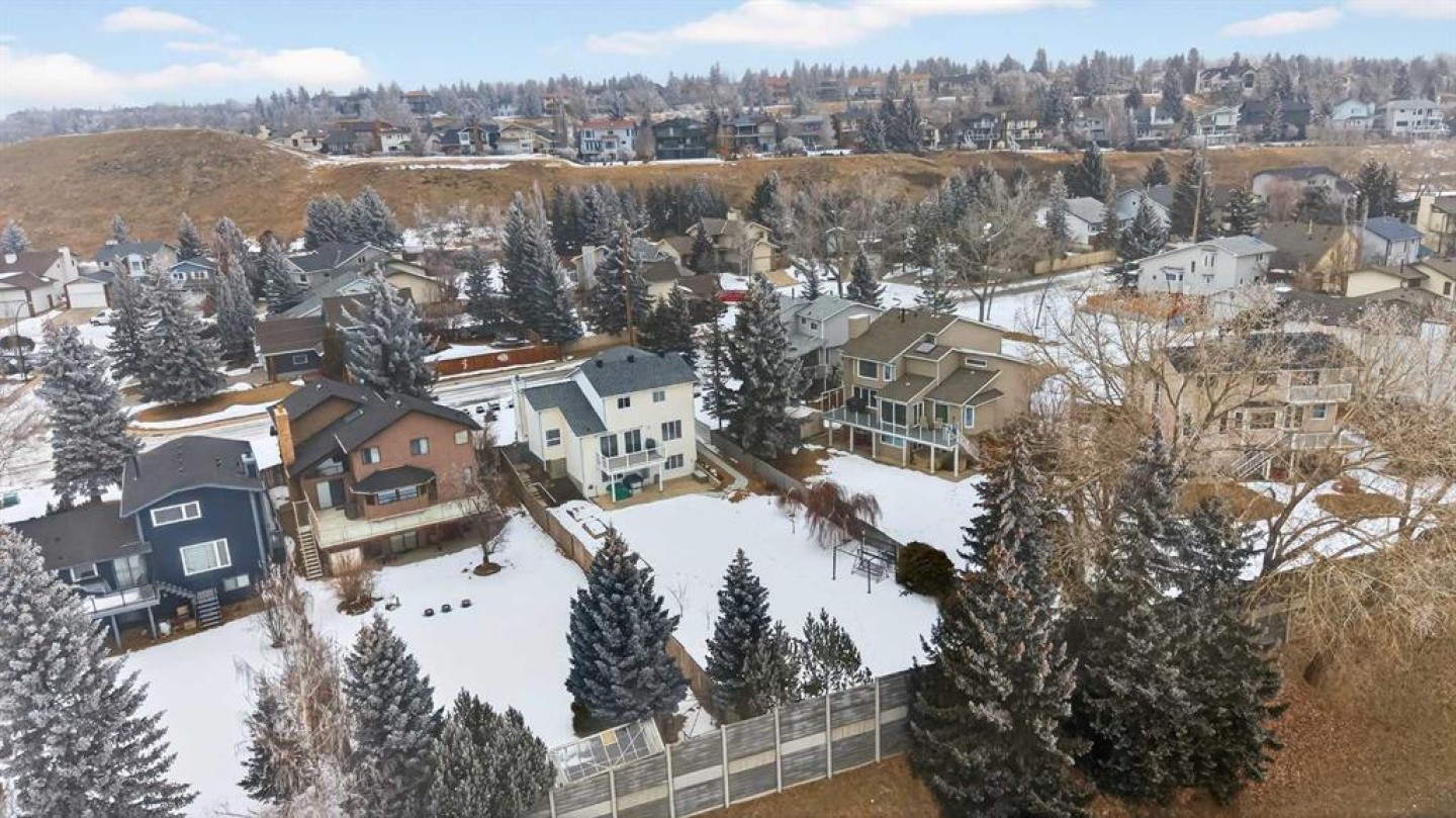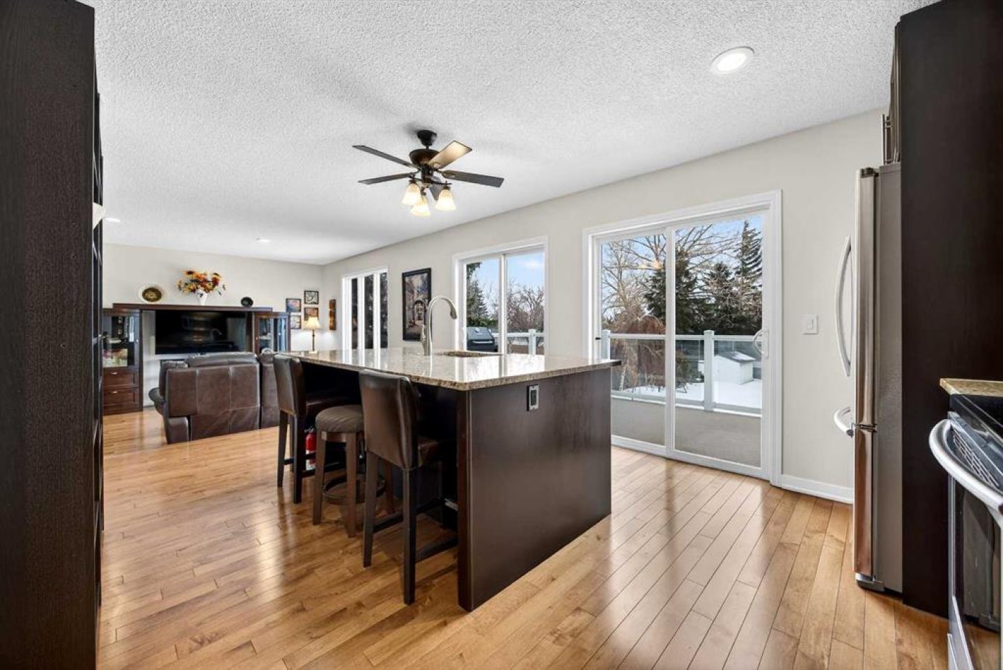 Experience the ultimate live-in, live-out lifestyle with this rare opportunity to own a quarter-acre estate right in the city. This meticulously cared-for two-storey home offers over 3,000 square feet of total developed living space, designed with the elegance of a country vacation home and functional flow perfect for a growing family. Backing onto private green space, the property boasts 180-degree views of the Bow Valley, the Rocky Mountains, and COP. The open and bright main floor features 9-foot ceilings and rich maple hardwood flooring throughout. A true heart of the home, the renovated kitchen is outfitted with custom 42-inch soft-close cabinetry, granite countertops, and a massive 4x8 foot island. Two upgraded patio doors lead directly to the elevated south-facing deck, featuring a manual retractable awning and a natural gas BBQ hookup—ideal for summer entertaining while taking in the mountain views. The main level also includes a spacious living room with a gas-insert fireplace, a formal dining area, and a functional laundry/mudroom with custom storage. Upstairs, the family retreat consists of three generous bedrooms, all wired for high-speed internet. The primary sanctuary features south-facing windows, a full-wall closet organizer, and a 5pc, spa-inspired ensuite, featuring heated ceramic floors, dual sinks, and a double-head walk-in shower. Two additional bedrooms share a well-appointed five-piece main bath that also features tiled floors, as well as in-floor heating. The walkout basement has been completely reimagined as a versatile studio suite (illegal) or massive entertainment hub. Featuring high ceilings, sound-proofing insulation, and durable wood-grain engineered flooring, this level includes a large family room, a second galley-style kitchenette with dishwasher, microwave and fridge, a flex room that can easily convert to a fourth bedroom, and a full bathroom with a second laundry set. With two huge south-facing windows and a separate keypad entrance, it is perfectly suited for multi-generational living or a home business. Outdoor living is truly exceptional on this oversized property. The south-facing backyard is your private orchard and garden paradise, featuring maturing apple trees, blueberry bushes, strawberries, rhubarb, and five raised garden beds. The massive fully fenced yard also includes a water pond feature, a large concrete patio, and an open gazebo with a swing. Practical upgrades include a newer (2024) hail-guard asphalt shingle roof with a 25-year warranty, newer eavestroughs, a built-in central vacuum system, and a double attached garage with a sharp epoxy floor coating and workbench. The large concrete driveway easily accommodates four vehicles. Located in a quiet, mature community with no city sidewalks to clear, you’ll love being just minutes from paved walking and biking trails, off-leash parks, and the Bow River. Enjoy easy access to the C-Train, University of Calgary, SAIT, and premium shopping at Crowfoot Circle.