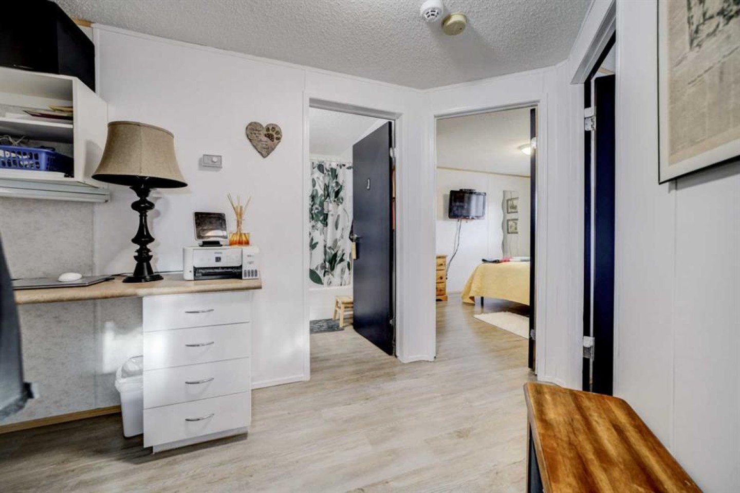 Butchers hutch, white storage shelves x2, spare room mounted TV's x2