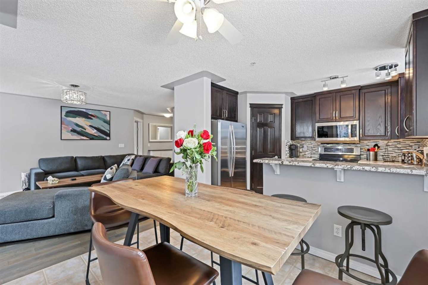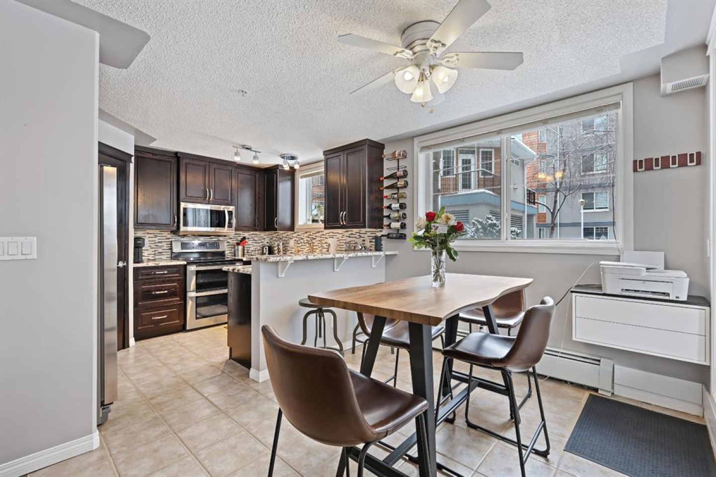Steps from restaurants, boutique shops, and some of Calgary’s best river pathways, this spacious 1,000+ sq. ft. 2-bedroom, 2-bathroom condo offers the perfect balance of vibrant inner-city living and peaceful access to nature. Located just moments from the Elbow River, Lindsay Park, and the shops and restaurants of 4th Street, you’re close to the energy of the city while still enjoying a quiet, walkable setting. Inside, rich espresso hardwood floors run throughout the main living areas. The west-facing living room is filled with natural light from large windows and features a beautiful gas fireplace with a striking mantel, creating the perfect spot to relax with a book or unwind on cooler evenings. The kitchen is both functional and stylish, complete with granite countertops, a breakfast bar, upgraded stainless steel appliances, and generous cabinetry for storage. The adjoining breakfast nook opens onto a private patio with a gas line, overlooking the beautifully landscaped courtyard and gardens. The patio also offers direct private access to the unit, adding extra convenience. The primary bedroom features a spacious walk-in closet and a large ensuite with quartz countertops, while the second bedroom provides flexibility as a guest room, home office, or additional living space. This pet-friendly complex is ideally situated with easy access to the Erlton C-Train station, making commuting simple and providing quick access to downtown, the Stampede Grounds, and the rest of the city.