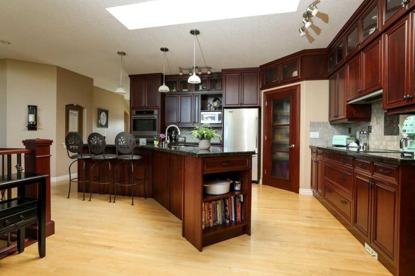 Central Vacuum, Granite Counters, High Ceilings, Jetted Tub, Kitchen Island, Open Floorplan, Skylight(s), Storage, Tray Ceiling(s), Walk-In Closet(s), Wet Bar