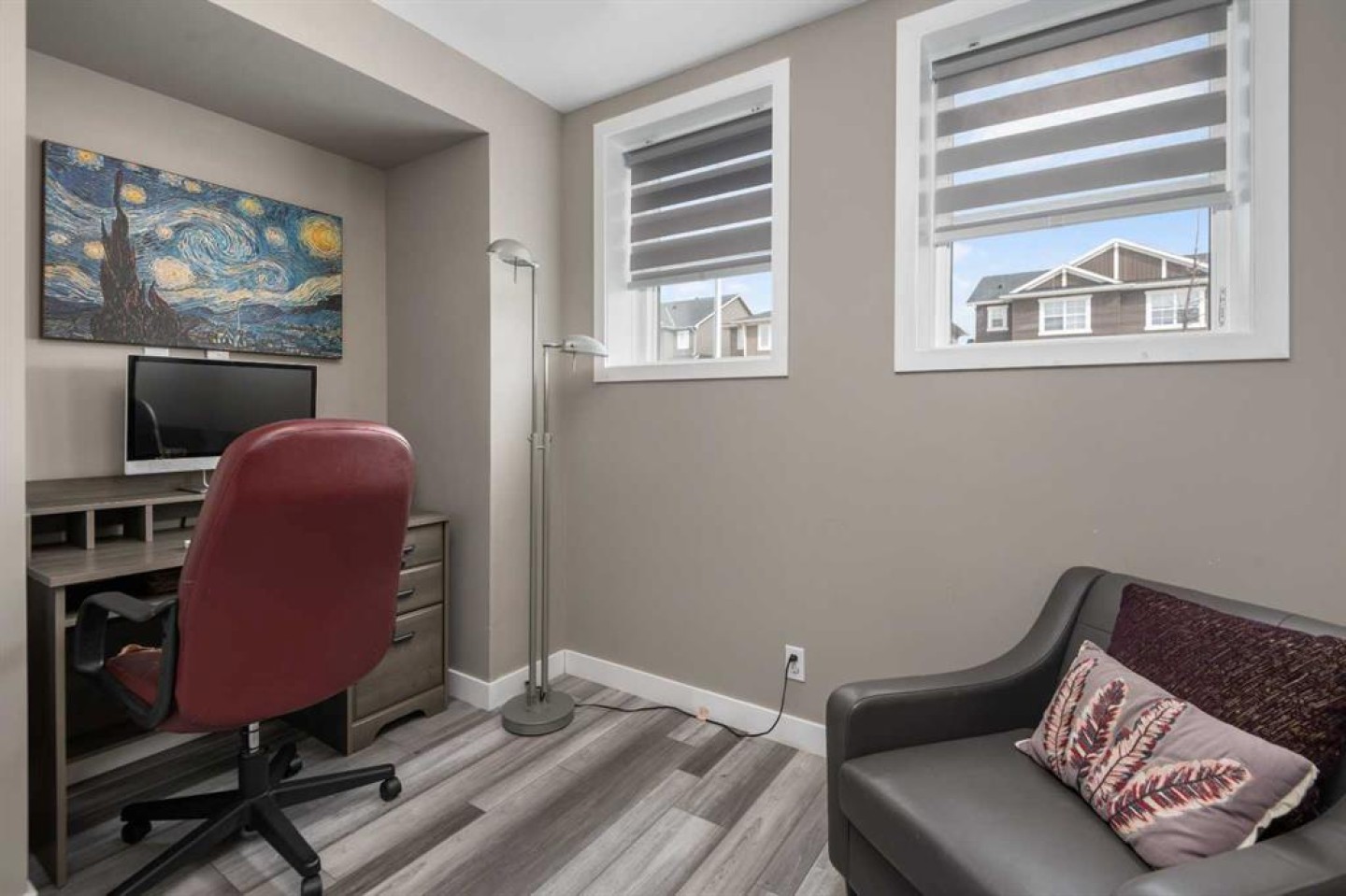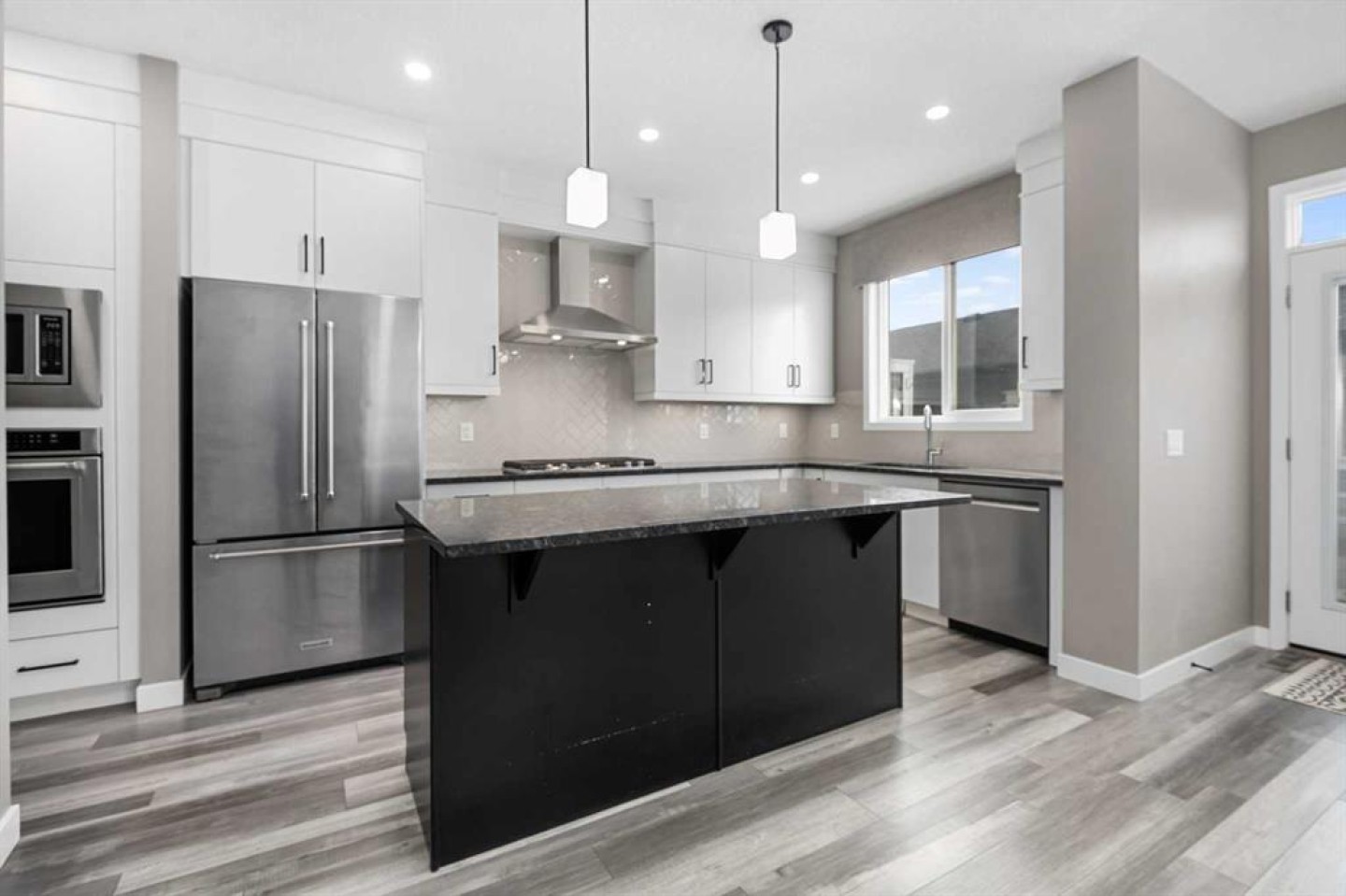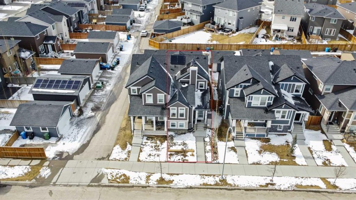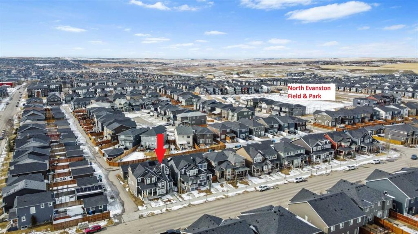 Welcome to this beautifully upgraded home in the desirable community of Evanston, offering the perfect blend of style, functionality, and low-maintenance living. Ideal for young professionals or those working from home, this property features two spacious bedrooms, a dedicated office, and a fully finished basement designed for both productivity and entertaining. The bright main level is filled with natural light thanks to large windows and a lofted ceiling, and includes a built-in HEOS sound system with ceiling speakers. The modern kitchen is designed for everyday living and entertaining, showcasing granite countertops, an impressive 8’ x 4’ island, ceiling height cabinetry, gas stove, and a stylish herringbone tile backsplash. Upstairs you’ll find the primary bedroom, convenient upper level laundry, and a dedicated office with large windows, creating a comfortable work from home space. Bathrooms feature quartz countertops and tiled flooring for a clean, modern finish. The fully finished basement with partially lofted ceiling provides spacious effect and adds excellent additional living space. Generous with extra large windows (can potentially add another bedroom or in-law space), ceiling speakers, and an impressive 9 ft bar with sink, bar fridge, and cabinetry. It's perfect for hosting or relaxing. Energy efficient upgrades include 12 new solar panels (Oct 2025) with a new ECU and rodent guard, along with a new EV charger in the insulated and drywalled garage. A beautiful curb appeal front yard with an established low maintenance showy garden including ornamental bushes and Swedish Aspen Columnar trees. The backyard equipped with a deck, greenhouse, berry bushes, resin shed, wood shed, and rain barrels to enjoy. Located close to parks, pathways, schools, and everyday amenities, this home offers modern comfort and an easy lifestyle in one of NW Calgary’s most popular communities.