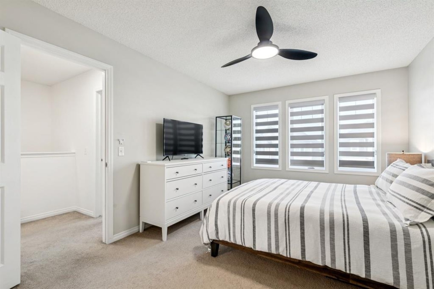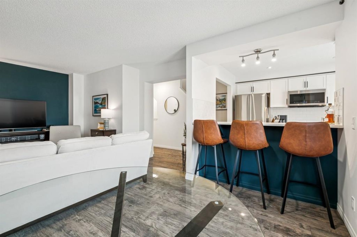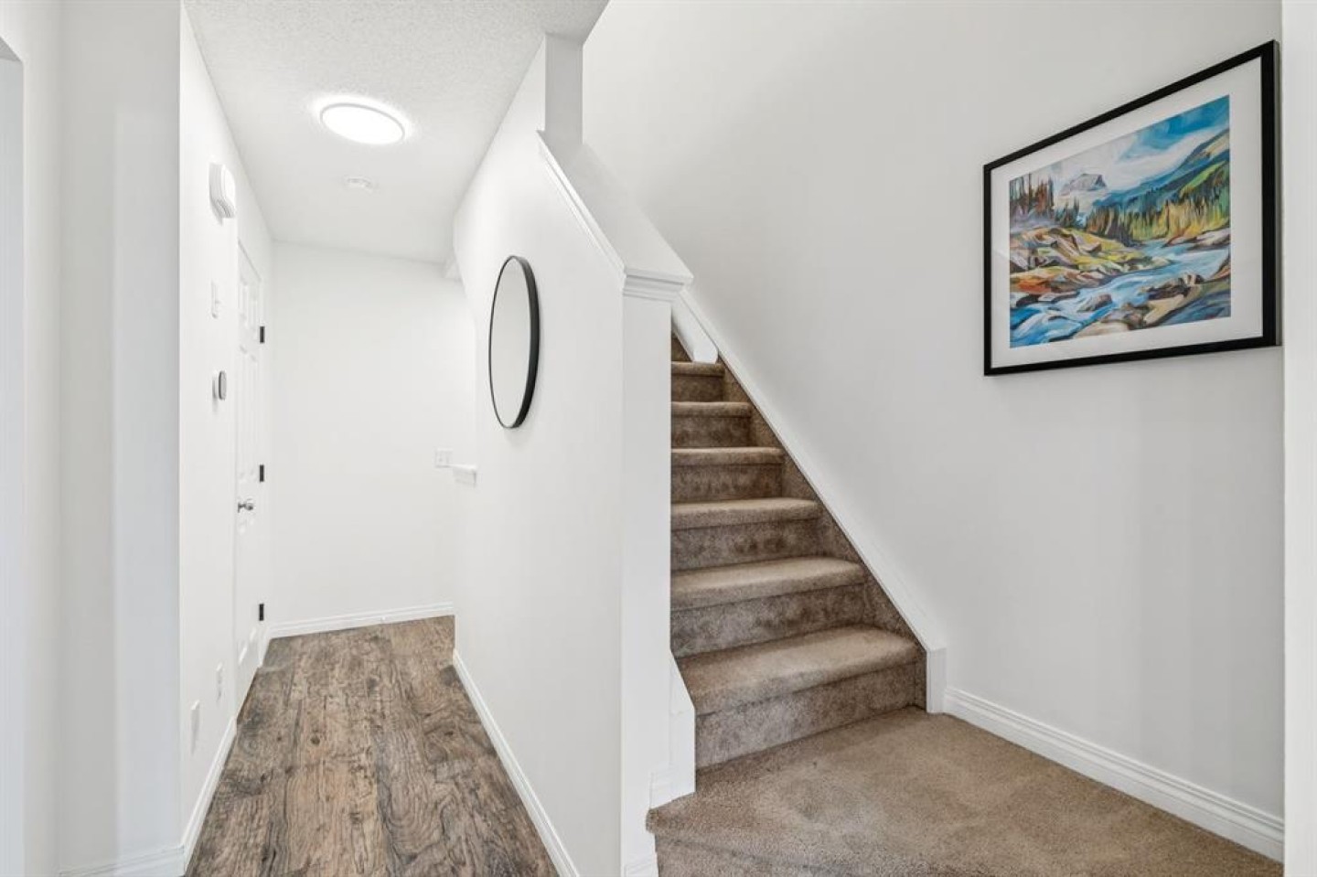 NO CONDO FEES! Discover modern living and exceptional value in this beautifully refreshed three-story townhouse, perfectly positioned for an easy Calgary commute and just steps from Chinook Winds Regional Park, schools, and local amenities. This home has been thoughtfully transformed with a list of premium updates, starting with a crisp, new designer paint palette on all interior walls and exterior doors. The main entrance welcomes you with a spacious tiled foyer, providing direct access to the single attached garage and a reorganized laundry room featuring brand-new custom built-ins and a newly installed hot water tank. The heart of the home on the second level boasts an open-concept layout defined by a stunning kitchen with white shaker cabinetry, sleek quartz countertops, and stainless steel appliances. Bathed in natural light, the living area is highlighted by a vibrant accent wall, and open floorpan that welcomes you to the generous private balcony perfect for entertaining. Every detail has been modernized, from the upgraded LED ceiling lights and designer bathroom fixtures to the contemporary matte black plumbing fixtures and hardware throughout. The top floor serves as a quiet retreat, featuring a large primary suite with a new ceiling fan, a walk-in closet, and four-piece bathroom complete with a quartz vanity and modern tiled tub surround. A bright second bedroom and a convenient linen closet complete this level. Experience peace of mind with a new Ecobee smart thermostat and new smoke alarms installed throughout. With no condo fees, a private parking pad for a second vehicle, this low-maintenance home is a standout choice for any buyer.