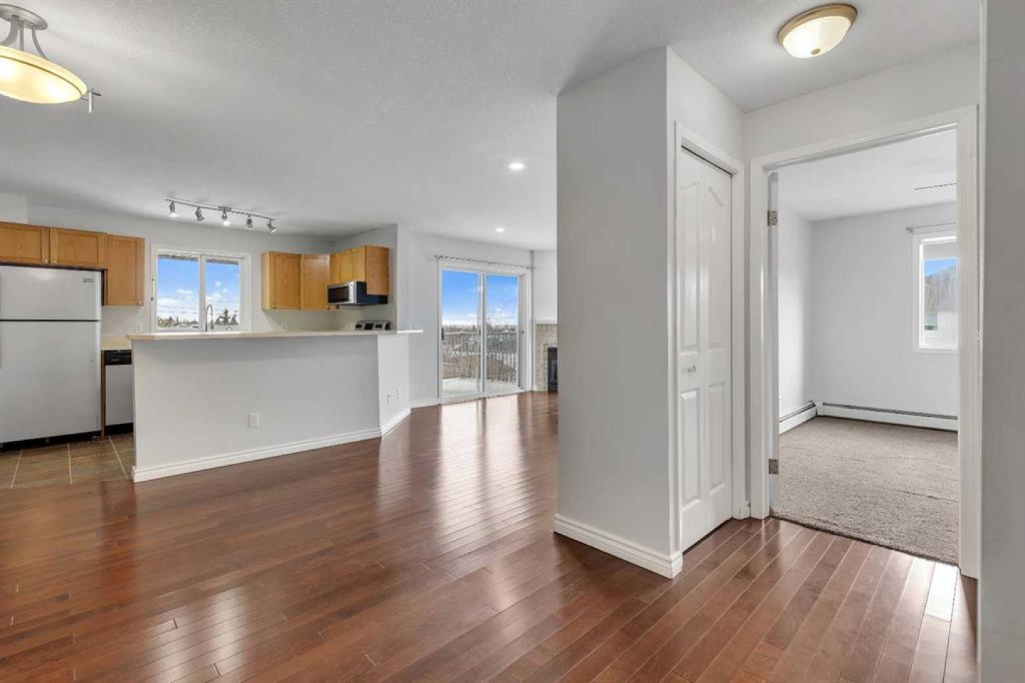 Top Floor Corner Unit with Incredible Natural Light in Prime Location! Welcome to this bright and beautifully maintained 2 bedroom, 2 full bathroom top-floor corner unit featuring large windows and an abundance of natural light throughout. The open-concept layout is highlighted by stunning maple coffee hardwood floors that flow through the living room, dining area, hallway, and foyer. The kitchen offers generous counter space, plenty of cabinetry, stainless steel appliances, and a raised breakfast bar that overlooks the spacious living room—complete with a cozy gas fireplace. Perfect for entertaining or relaxing at the end of the day. The primary bedroom features a walk-through closet leading to a private 4-piece ensuite which includes a jetted tub (new toilet installed in 2022). The second bedroom is ideal for guests, a roommate, or a home office. You’ll also appreciate the in-suite storage room by the front entrance & additional attached storage room on the large balcony. A new washer and dryer was installed (2021) for added convenience. One of the best features? Your parking stall is located directly in front of the unit and is visible from the deck—making winter mornings easier when using a remote car starter. The location is unbeatable—just off 96 Avenue with immediate access to a fantastic shopping plaza including T&T Supermarket, Tim Hortons, Rexall, The Canadian Brewhouse, Harvest Hills Auto, dental services, restaurants, and more. The 300 BRT bus on 96 Avenue provides direct access to the airport in approximately 8–10 minutes, and you’ll enjoy quick connections to Deerfoot Trail and Stoney Trail for easy commuting anywhere in the city. This is an exceptional opportunity for first-time buyers, investors, or downsizers looking for convenience, comfort, and a fantastic location.