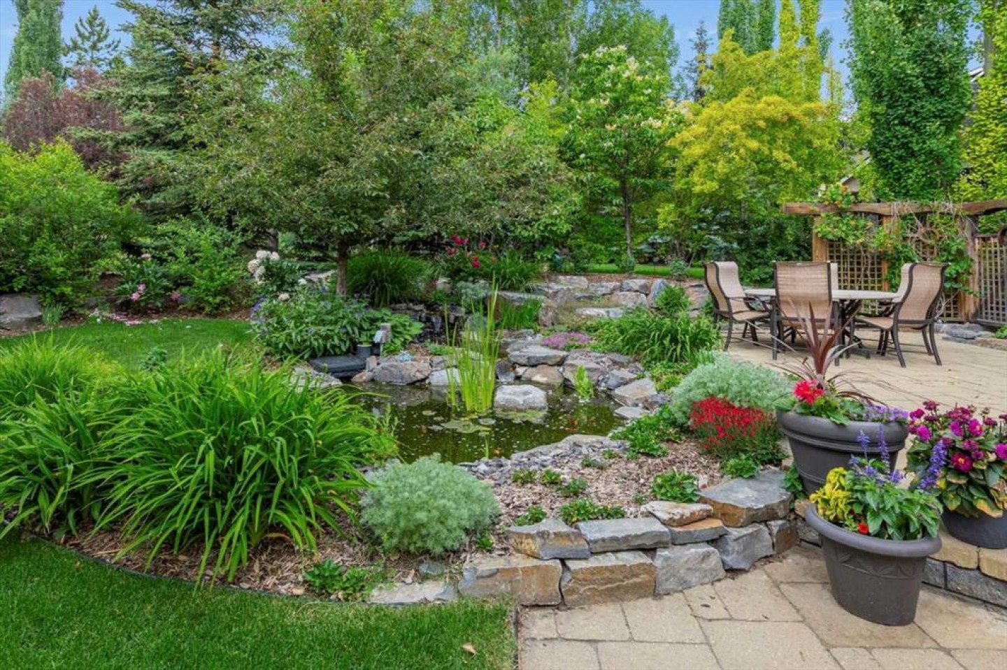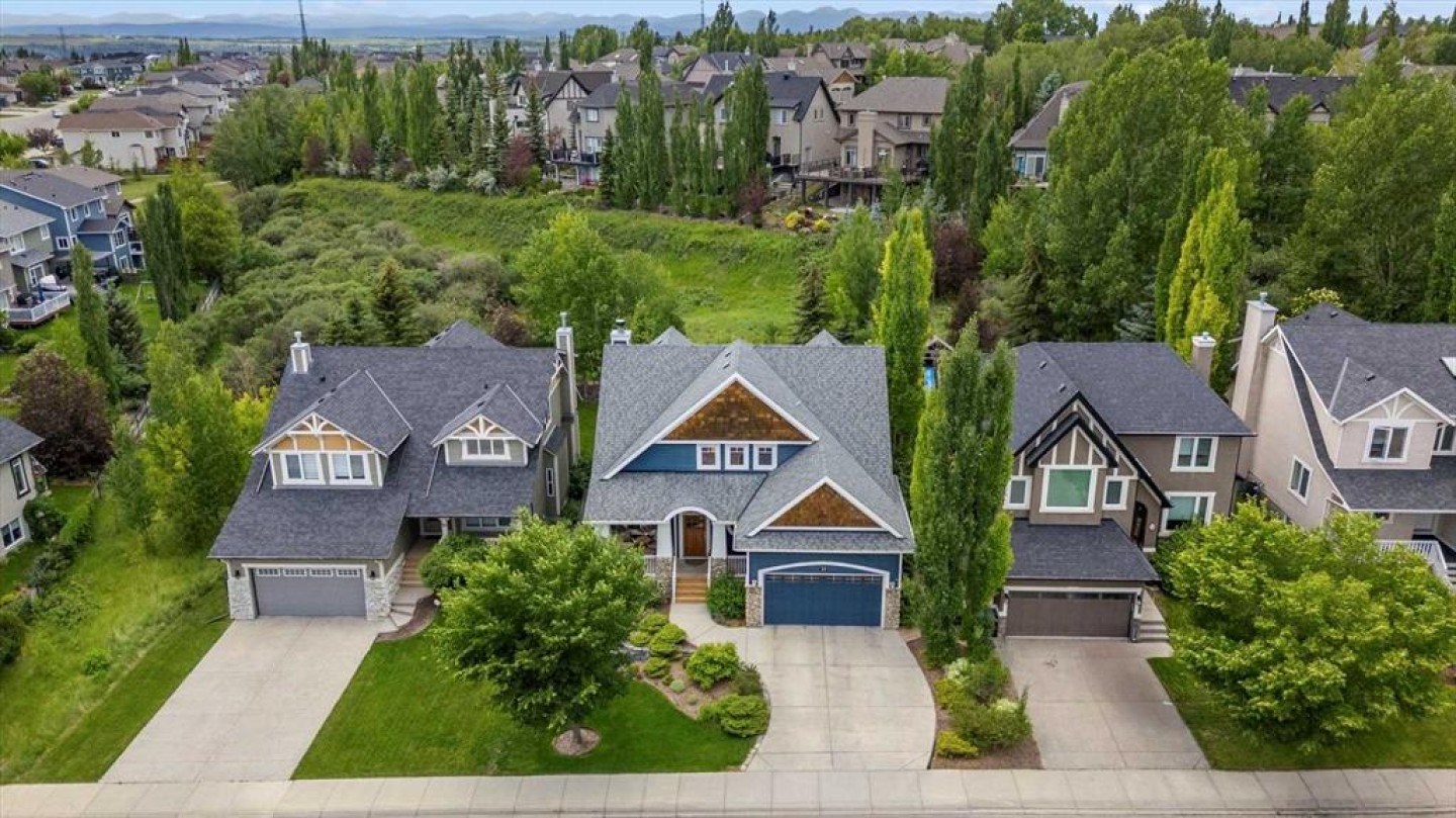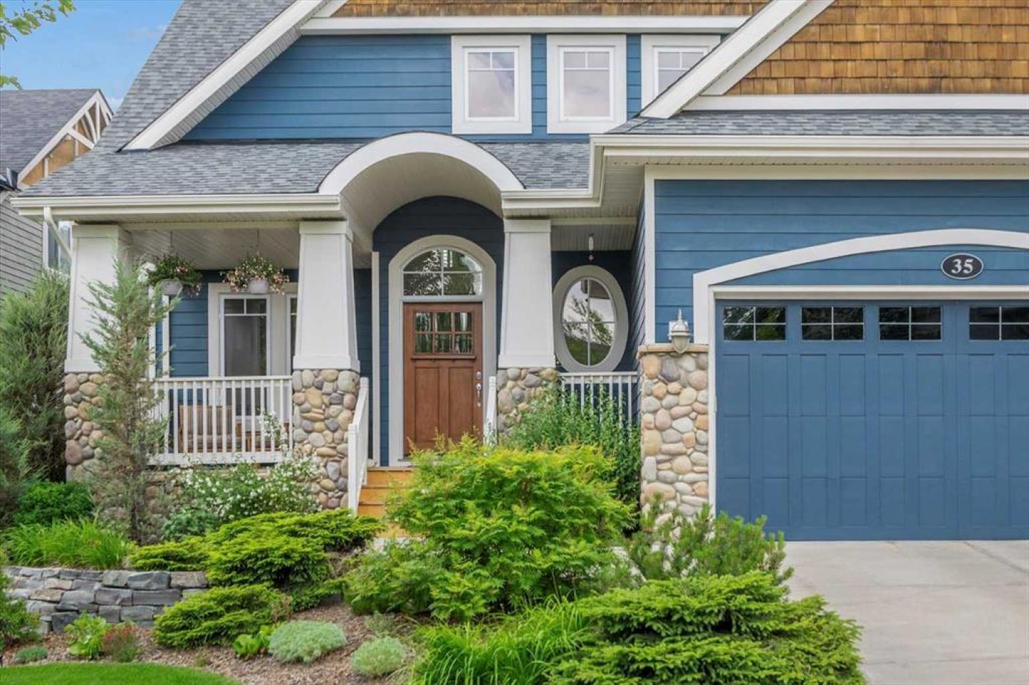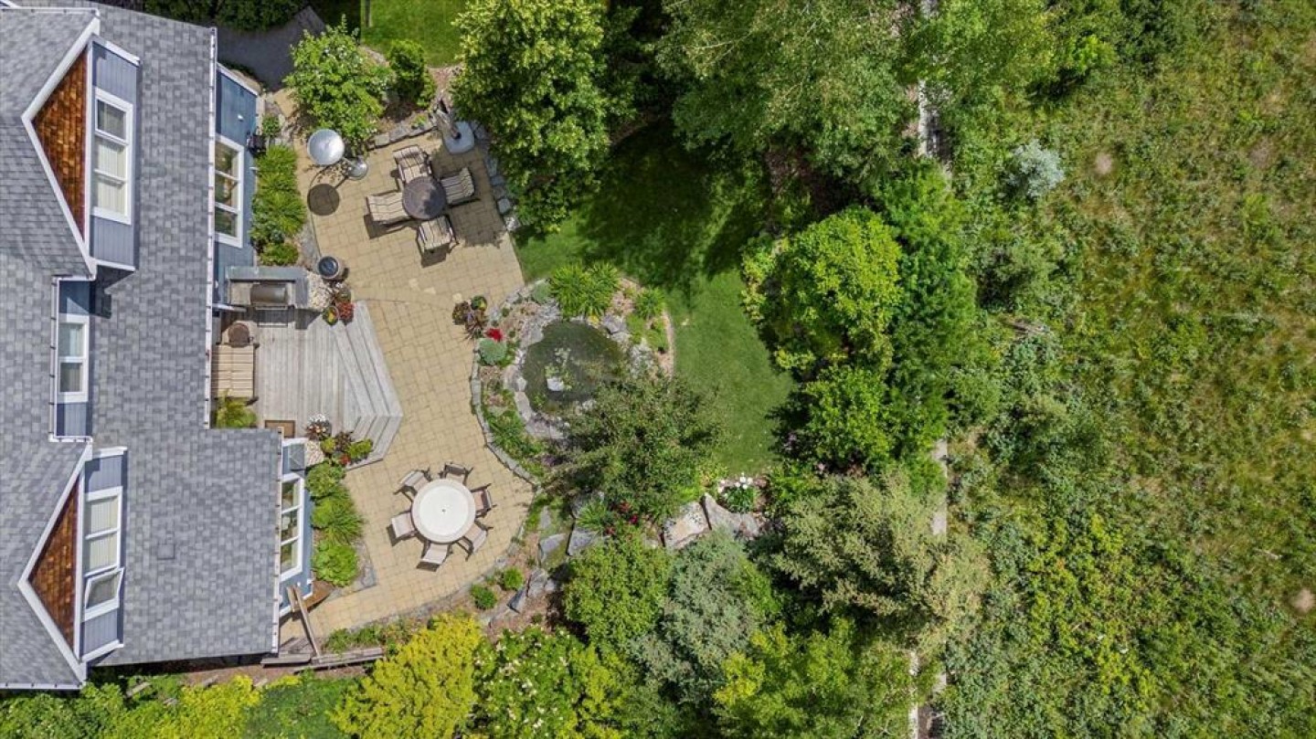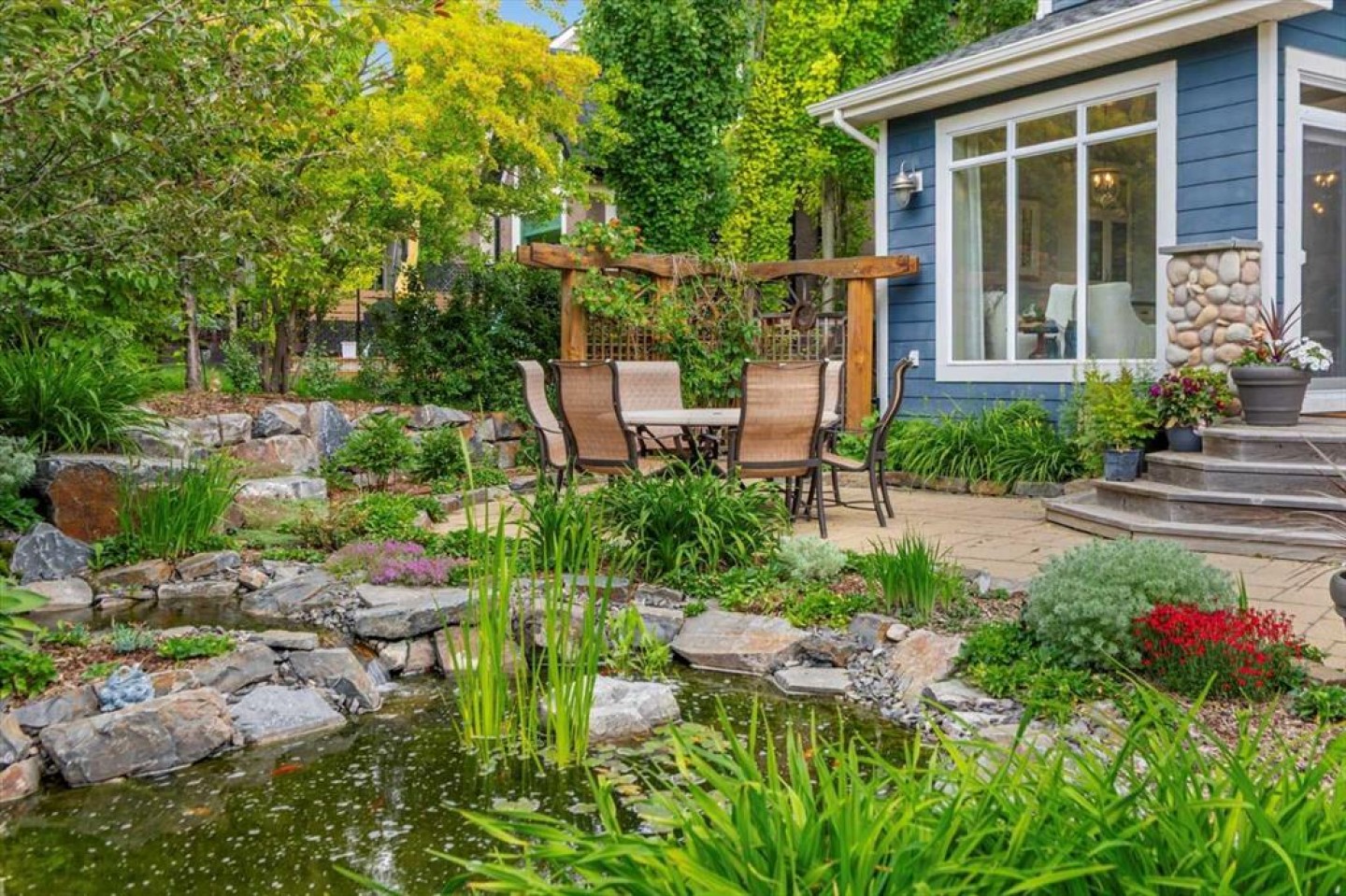 Some homes catch your eye from the street and never quite let go. That's the effect of this exceptional Tuscany craftsman - blue Hardie Plank siding, wood shake gables, river stone accents, and an arched entrance that signals something special long before you step inside. It's the kind of exterior that draws admiring glances from passersby, and the interior delivers on every one of those expectations. A spacious foyer welcomes you in and draws your gaze immediately toward the back of the home, where the family room unfolds around a wood-burning fireplace — an increasingly rare find - flanked by custom built-ins and complemented by bookshelf cabinetry that gives the space an inviting, lived-in warmth. The picture window here frames the backyard like a painting you'll never tire of looking at. Between the family room and the kitchen, the dining room has direct access to the deck and overlooks the yard - so beautiful the owners use it for everyday dining. Clever pocket doors allow the kitchen to be closed off when entertaining, a thoughtful detail that speaks to how carefully this home was designed. The kitchen is genuinely lovely: ivory cabinetry with granite counters, subway tile backsplash, gas cooktop, Miele double wall ovens, and a panel-front refrigerator. A slightly lowered counter section is a baker's delight, and a cozy nook - originally designed as a breakfast area - has been reimagined as a quiet sitting spot with views over the yard and pond. The main floor also includes a well-appointed mudroom with garage access, a family command station, a powder room with charming wallpaper, and a flex room with sliding barn doors - ideal as a home office or reading room. Upstairs, the wide staircase leads to a generous landing before arriving at the recently updated primary suite. It overlooks the yard, and the renovated ensuite is exceptional - thick marble counters, aged brass fixtures, and a herringbone-tiled shower where every detail has been chosen with care. The walk-in closet, outfitted with custom built-ins and his-and-hers laundry hampers, renders dressers unnecessary. Two additional bedrooms, a full bath, and a laundry room with sink complete the upper level. And then there is the backyard. Mature trees, a stone-edged pond, layered gardens bursting with perennials, multiple stone patio areas, a pergola, and additional green space beyond the property line - it is a garden sanctuary unlike anything you'll find in a typical suburban yard. The seamless flow between the indoor and outdoor spaces makes entertaining feel entirely natural here. Backing onto green space, this is a home that rewards every glance - from the street, from the kitchen window, from a quiet evening on the patio.
