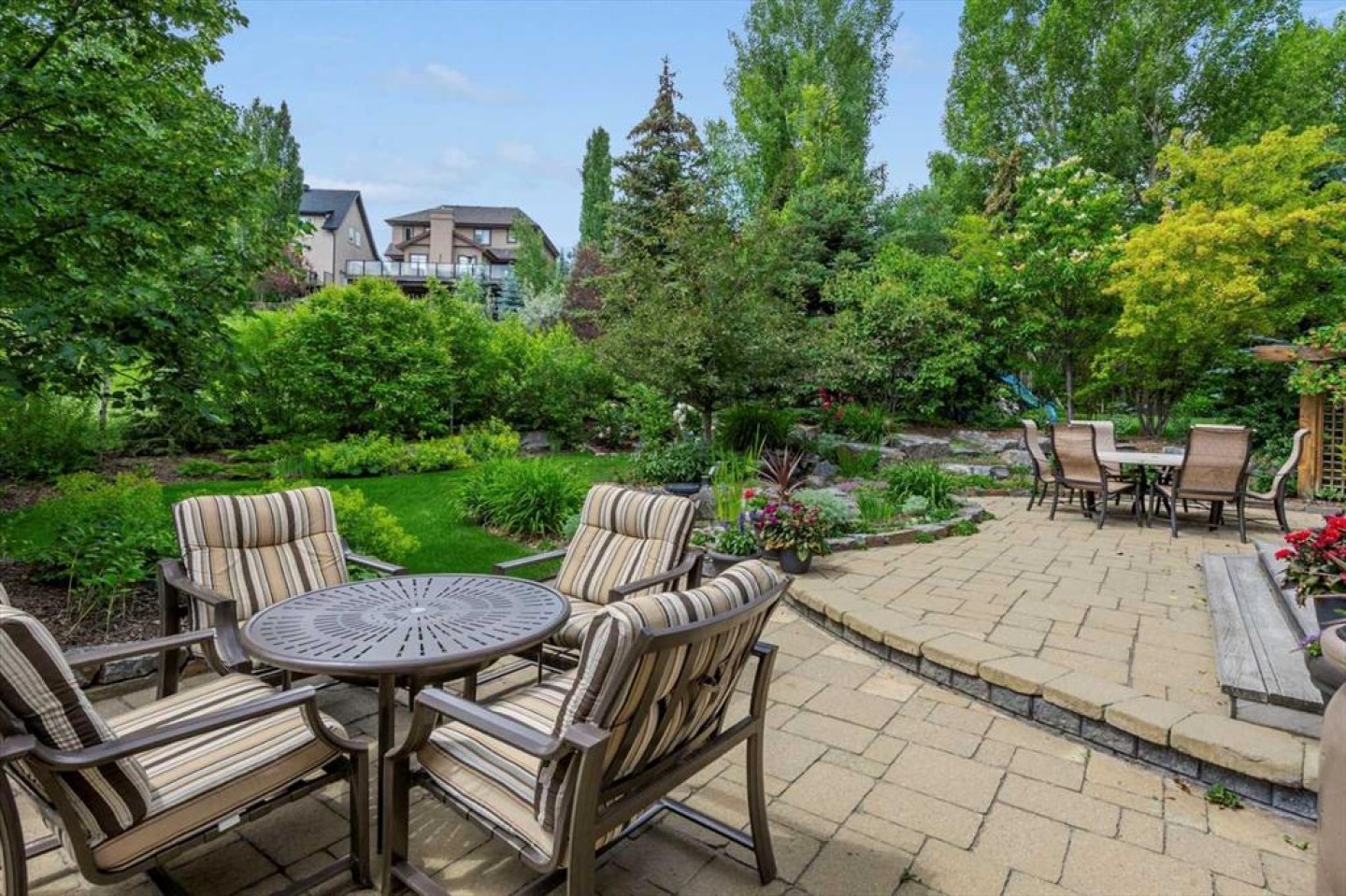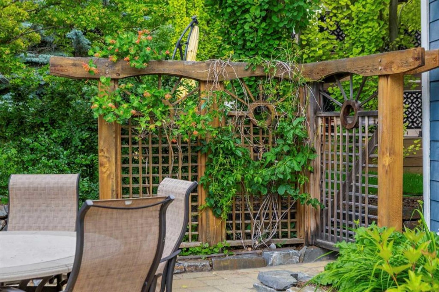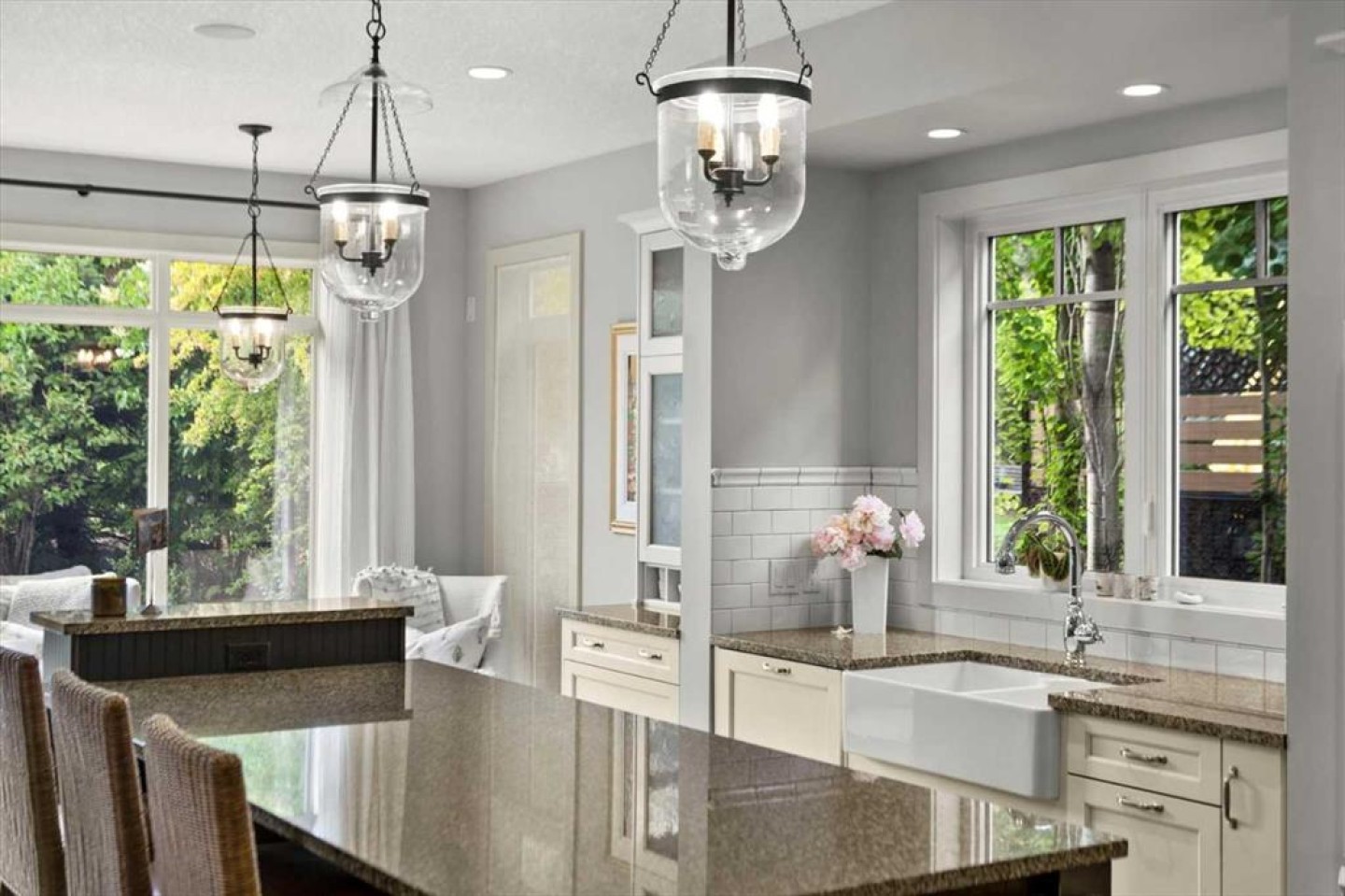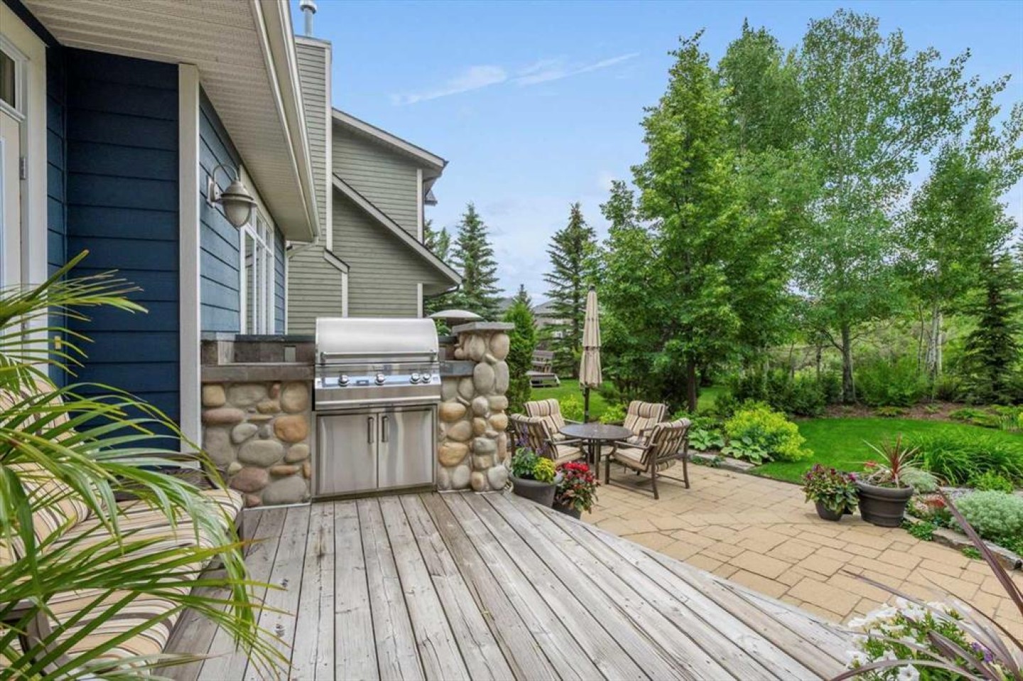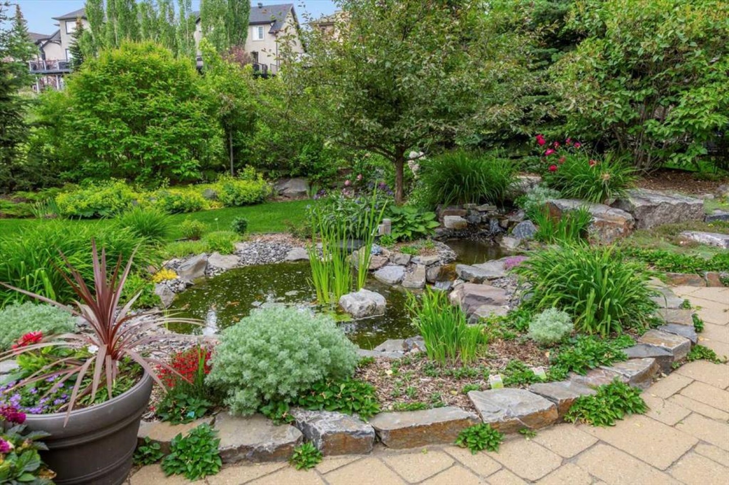 Some homes catch your eye from the street and never quite let go. That's the effect of this exceptional Tuscany craftsman - blue Hardie Plank siding, wood shake gables, river stone accents, and an arched entrance that signals something special long before you step inside. It's the kind of exterior that draws admiring glances from passersby, and the interior delivers on every one of those expectations. A spacious foyer welcomes you in and draws your gaze immediately toward the back of the home, where the family room unfolds around a wood-burning fireplace — an increasingly rare find - flanked by custom built-ins and complemented by bookshelf cabinetry that gives the space an inviting, lived-in warmth. The picture window here frames the backyard like a painting you'll never tire of looking at. Between the family room and the kitchen, the dining room has direct access to the deck and overlooks the yard - so beautiful the owners use it for everyday dining. Clever pocket doors allow the kitchen to be closed off when entertaining, a thoughtful detail that speaks to how carefully this home was designed. The kitchen is genuinely lovely: ivory cabinetry with granite counters, subway tile backsplash, gas cooktop, Miele double wall ovens, and a panel-front refrigerator. A slightly lowered counter section is a baker's delight, and a cozy nook - originally designed as a breakfast area - has been reimagined as a quiet sitting spot with views over the yard and pond. The main floor also includes a well-appointed mudroom with garage access, a family command station, a powder room with charming wallpaper, and a flex room with sliding barn doors - ideal as a home office or reading room. Upstairs, the wide staircase leads to a generous landing before arriving at the recently updated primary suite. It overlooks the yard, and the renovated ensuite is exceptional - thick marble counters, aged brass fixtures, and a herringbone-tiled shower where every detail has been chosen with care. The walk-in closet, outfitted with custom built-ins and his-and-hers laundry hampers, renders dressers unnecessary. Two additional bedrooms, a full bath, and a laundry room with sink complete the upper level. And then there is the backyard. Mature trees, a stone-edged pond, layered gardens bursting with perennials, multiple stone patio areas, a pergola, and additional green space beyond the property line - it is a garden sanctuary unlike anything you'll find in a typical suburban yard. The seamless flow between the indoor and outdoor spaces makes entertaining feel entirely natural here. Backing onto green space, this is a home that rewards every glance - from the street, from the kitchen window, from a quiet evening on the patio.