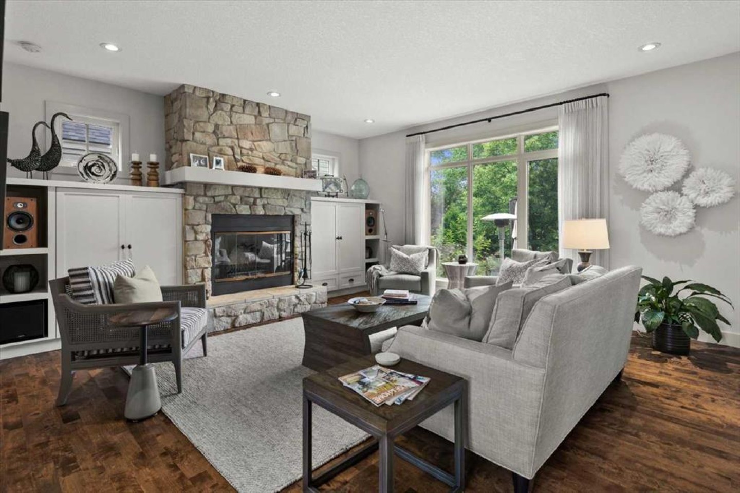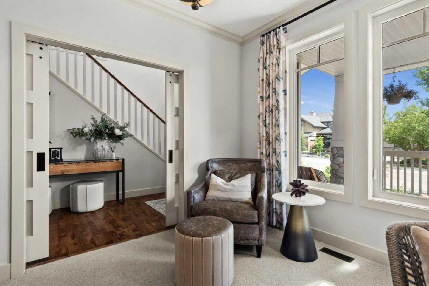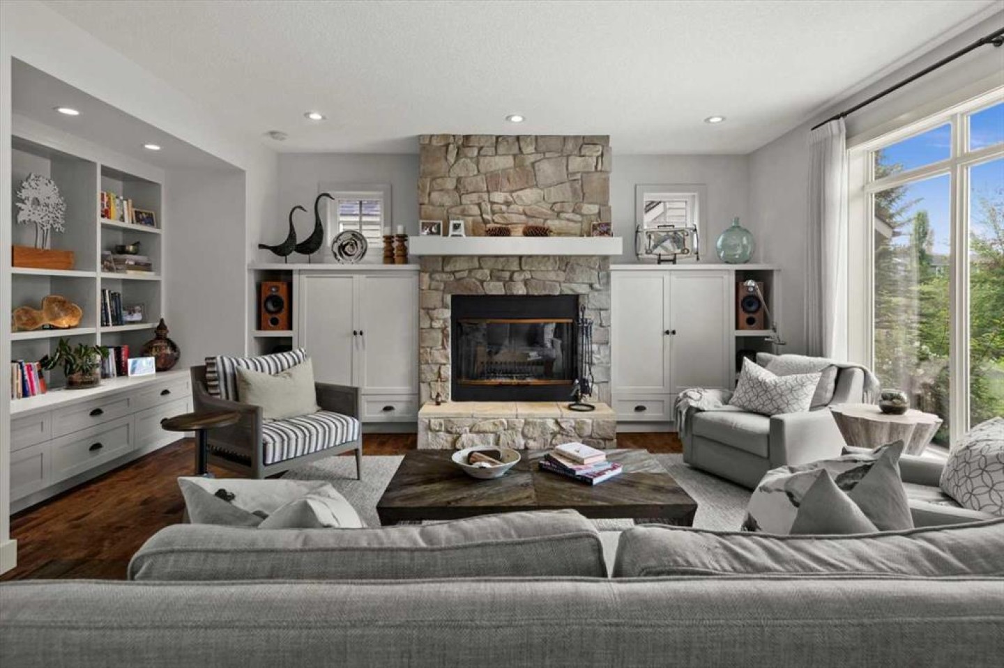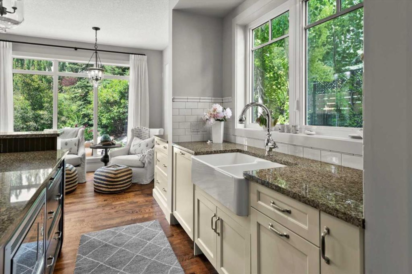Some homes catch your eye from the street and never quite let go. That's the effect of this exceptional Tuscany craftsman - blue Hardie Plank siding, wood shake gables, river stone accents, and an arched entrance that signals something special long before you step inside. It's the kind of exterior that draws admiring glances from passersby, and the interior delivers on every one of those expectations. A spacious foyer welcomes you in and draws your gaze immediately toward the back of the home, where the family room unfolds around a wood-burning fireplace — an increasingly rare find - flanked by custom built-ins and complemented by bookshelf cabinetry that gives the space an inviting, lived-in warmth. The picture window here frames the backyard like a painting you'll never tire of looking at. Between the family room and the kitchen, the dining room has direct access to the deck and overlooks the yard - so beautiful the owners use it for everyday dining. Clever pocket doors allow the kitchen to be closed off when entertaining, a thoughtful detail that speaks to how carefully this home was designed. The kitchen is genuinely lovely: ivory cabinetry with granite counters, subway tile backsplash, gas cooktop, Miele double wall ovens, and a panel-front refrigerator. A slightly lowered counter section is a baker's delight, and a cozy nook - originally designed as a breakfast area - has been reimagined as a quiet sitting spot with views over the yard and pond. The main floor also includes a well-appointed mudroom with garage access, a family command station, a powder room with charming wallpaper, and a flex room with sliding barn doors - ideal as a home office or reading room. Upstairs, the wide staircase leads to a generous landing before arriving at the recently updated primary suite. It overlooks the yard, and the renovated ensuite is exceptional - thick marble counters, aged brass fixtures, and a herringbone-tiled shower where every detail has been chosen with care. The walk-in closet, outfitted with custom built-ins and his-and-hers laundry hampers, renders dressers unnecessary. Two additional bedrooms, a full bath, and a laundry room with sink complete the upper level. And then there is the backyard. Mature trees, a stone-edged pond, layered gardens bursting with perennials, multiple stone patio areas, a pergola, and additional green space beyond the property line - it is a garden sanctuary unlike anything you'll find in a typical suburban yard. The seamless flow between the indoor and outdoor spaces makes entertaining feel entirely natural here. Backing onto green space, this is a home that rewards every glance - from the street, from the kitchen window, from a quiet evening on the patio.