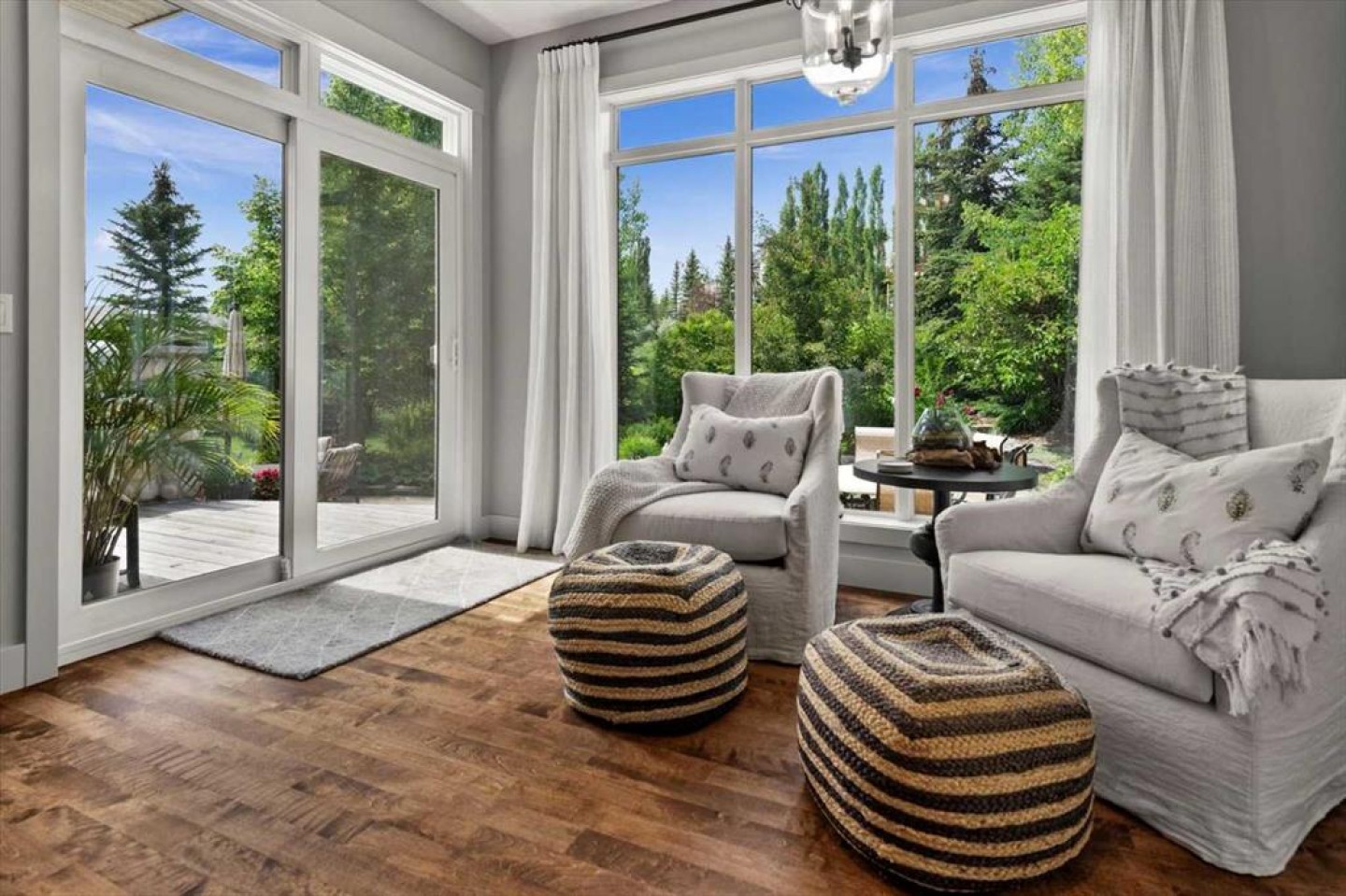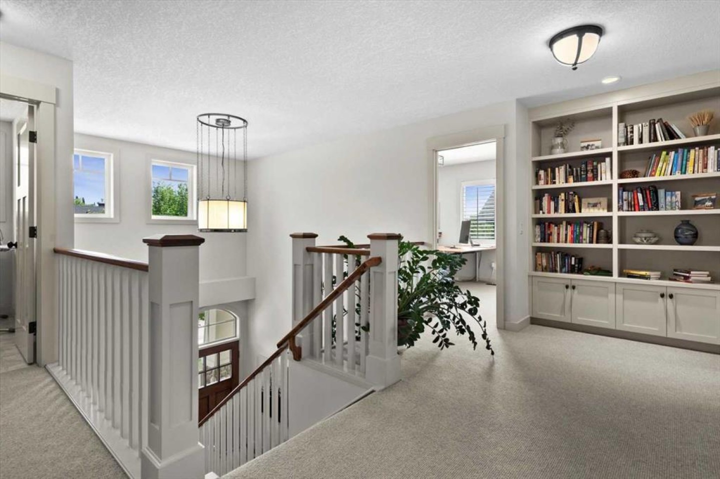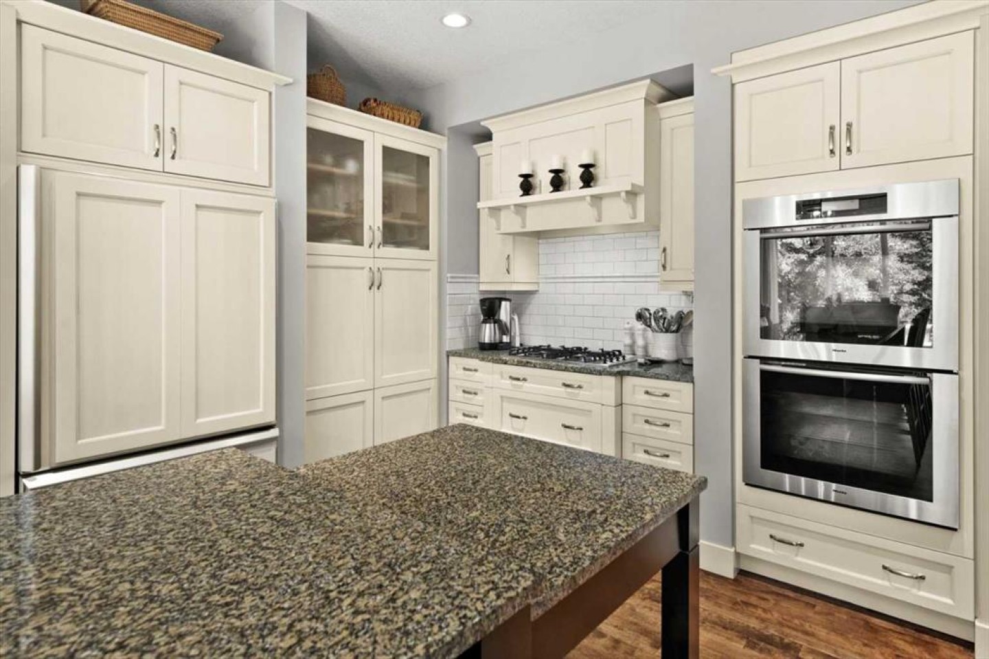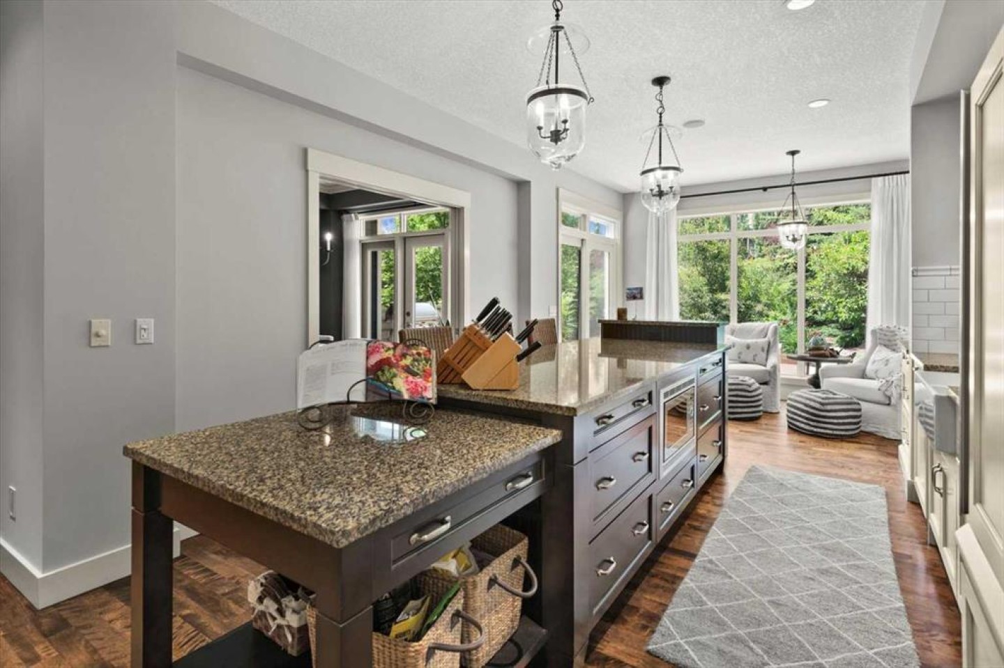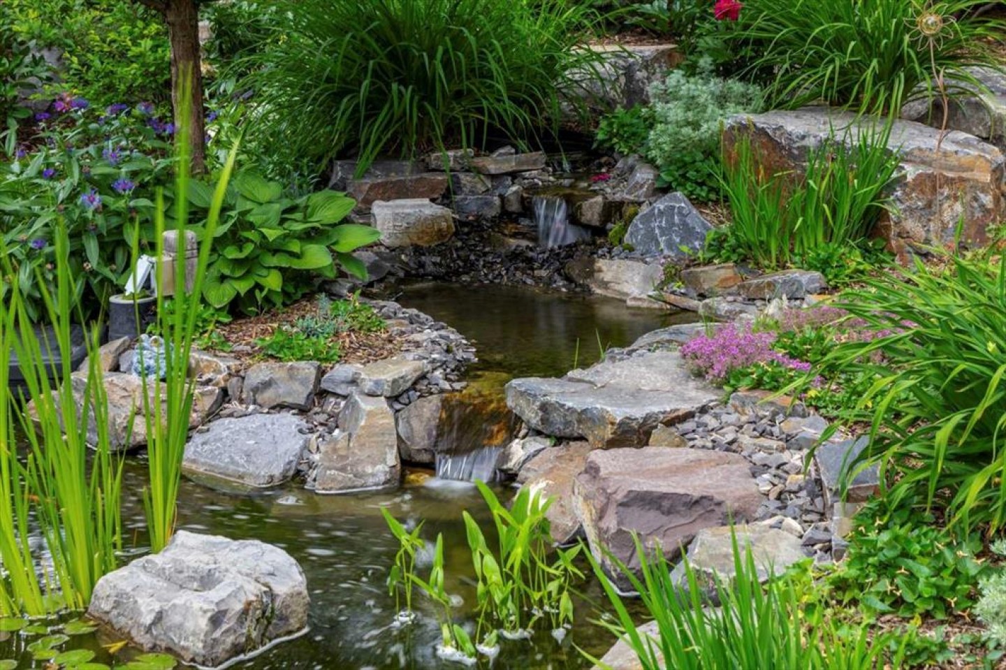 Some homes catch your eye from the street and never quite let go. That's the effect of this exceptional Tuscany craftsman - blue Hardie Plank siding, wood shake gables, river stone accents, and an arched entrance that signals something special long before you step inside. It's the kind of exterior that draws admiring glances from passersby, and the interior delivers on every one of those expectations. A spacious foyer welcomes you in and draws your gaze immediately toward the back of the home, where the family room unfolds around a wood-burning fireplace — an increasingly rare find - flanked by custom built-ins and complemented by bookshelf cabinetry that gives the space an inviting, lived-in warmth. The picture window here frames the backyard like a painting you'll never tire of looking at. Between the family room and the kitchen, the dining room has direct access to the deck and overlooks the yard - so beautiful the owners use it for everyday dining. Clever pocket doors allow the kitchen to be closed off when entertaining, a thoughtful detail that speaks to how carefully this home was designed. The kitchen is genuinely lovely: ivory cabinetry with granite counters, subway tile backsplash, gas cooktop, Miele double wall ovens, and a panel-front refrigerator. A slightly lowered counter section is a baker's delight, and a cozy nook - originally designed as a breakfast area - has been reimagined as a quiet sitting spot with views over the yard and pond. The main floor also includes a well-appointed mudroom with garage access, a family command station, a powder room with charming wallpaper, and a flex room with sliding barn doors - ideal as a home office or reading room. Upstairs, the wide staircase leads to a generous landing before arriving at the recently updated primary suite. It overlooks the yard, and the renovated ensuite is exceptional - thick marble counters, aged brass fixtures, and a herringbone-tiled shower where every detail has been chosen with care. The walk-in closet, outfitted with custom built-ins and his-and-hers laundry hampers, renders dressers unnecessary. Two additional bedrooms, a full bath, and a laundry room with sink complete the upper level. And then there is the backyard. Mature trees, a stone-edged pond, layered gardens bursting with perennials, multiple stone patio areas, a pergola, and additional green space beyond the property line - it is a garden sanctuary unlike anything you'll find in a typical suburban yard. The seamless flow between the indoor and outdoor spaces makes entertaining feel entirely natural here. Backing onto green space, this is a home that rewards every glance - from the street, from the kitchen window, from a quiet evening on the patio.