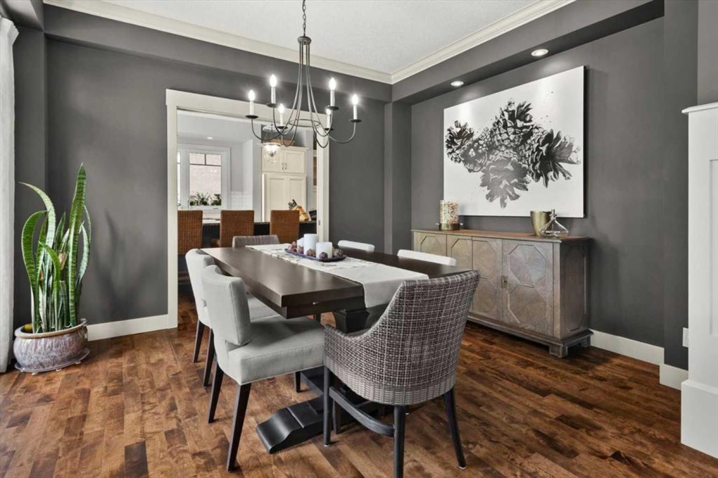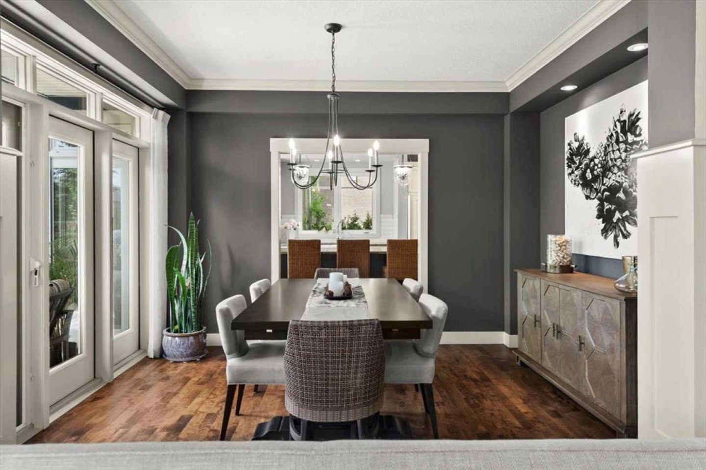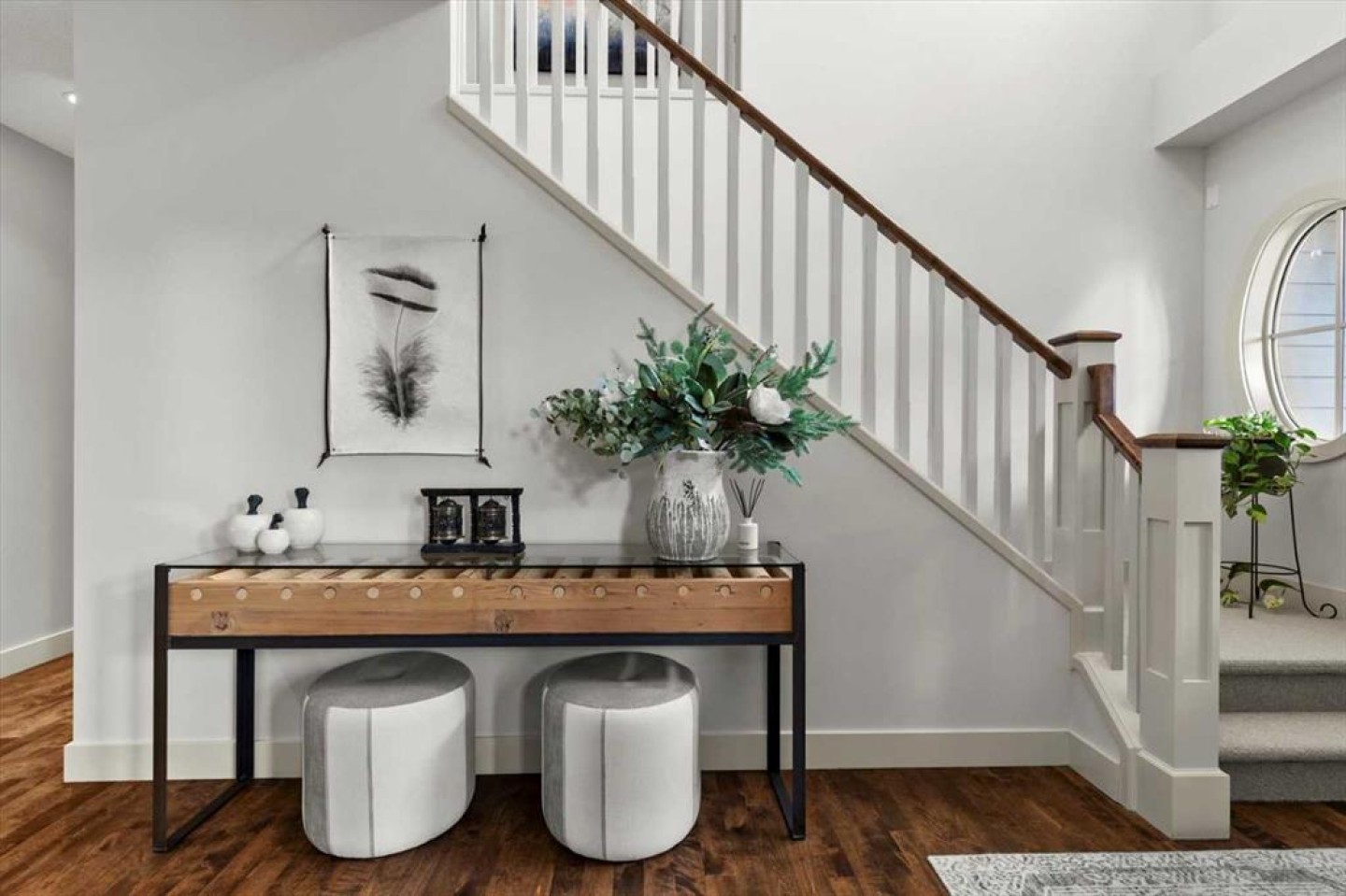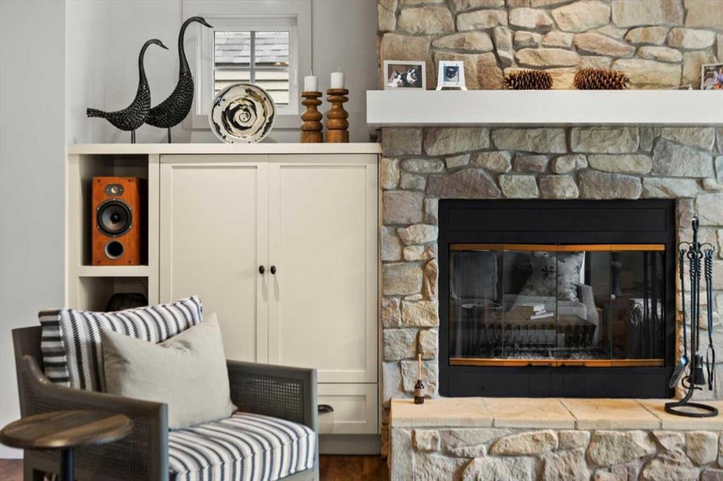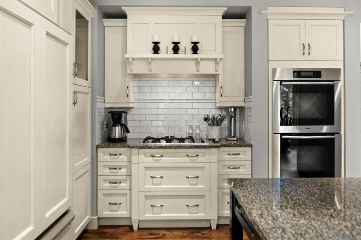 Some homes catch your eye from the street and never quite let go. That's the effect of this exceptional Tuscany craftsman - blue Hardie Plank siding, wood shake gables, river stone accents, and an arched entrance that signals something special long before you step inside. It's the kind of exterior that draws admiring glances from passersby, and the interior delivers on every one of those expectations. A spacious foyer welcomes you in and draws your gaze immediately toward the back of the home, where the family room unfolds around a wood-burning fireplace — an increasingly rare find - flanked by custom built-ins and complemented by bookshelf cabinetry that gives the space an inviting, lived-in warmth. The picture window here frames the backyard like a painting you'll never tire of looking at. Between the family room and the kitchen, the dining room has direct access to the deck and overlooks the yard - so beautiful the owners use it for everyday dining. Clever pocket doors allow the kitchen to be closed off when entertaining, a thoughtful detail that speaks to how carefully this home was designed. The kitchen is genuinely lovely: ivory cabinetry with granite counters, subway tile backsplash, gas cooktop, Miele double wall ovens, and a panel-front refrigerator. A slightly lowered counter section is a baker's delight, and a cozy nook - originally designed as a breakfast area - has been reimagined as a quiet sitting spot with views over the yard and pond. The main floor also includes a well-appointed mudroom with garage access, a family command station, a powder room with charming wallpaper, and a flex room with sliding barn doors - ideal as a home office or reading room. Upstairs, the wide staircase leads to a generous landing before arriving at the recently updated primary suite. It overlooks the yard, and the renovated ensuite is exceptional - thick marble counters, aged brass fixtures, and a herringbone-tiled shower where every detail has been chosen with care. The walk-in closet, outfitted with custom built-ins and his-and-hers laundry hampers, renders dressers unnecessary. Two additional bedrooms, a full bath, and a laundry room with sink complete the upper level. And then there is the backyard. Mature trees, a stone-edged pond, layered gardens bursting with perennials, multiple stone patio areas, a pergola, and additional green space beyond the property line - it is a garden sanctuary unlike anything you'll find in a typical suburban yard. The seamless flow between the indoor and outdoor spaces makes entertaining feel entirely natural here. Backing onto green space, this is a home that rewards every glance - from the street, from the kitchen window, from a quiet evening on the patio.