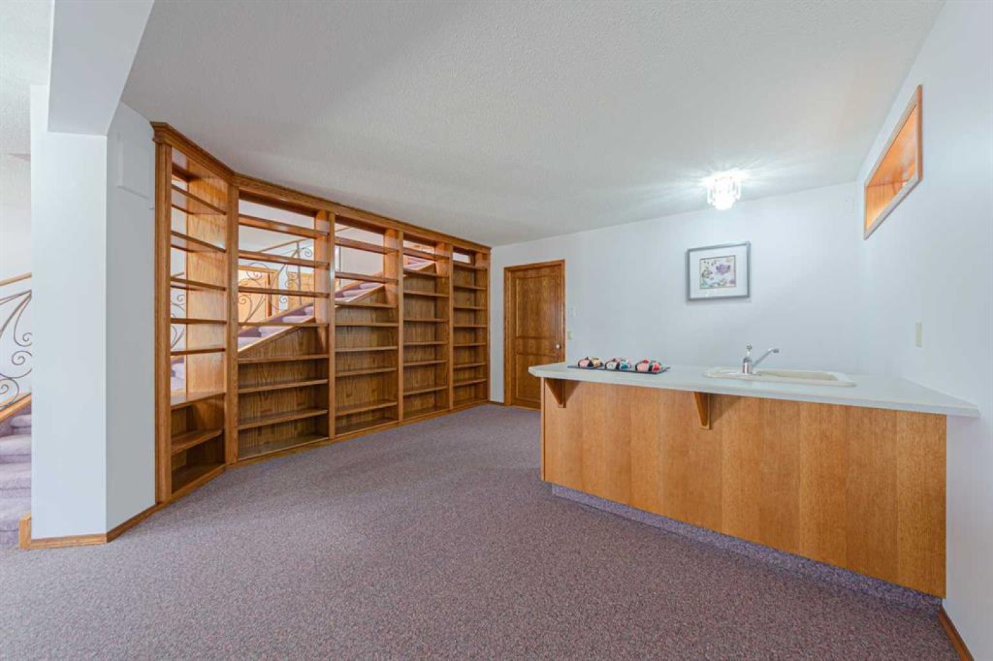 Across from Somerset Park on a large lot is this rare find walkout bungalow with over 3300sqft of usable space! Truly one-of-a-kind in the community of Somerset, main floor features dramatic vaulted ceilings, a three-sided see through fireplace, and floor to ceiling windows allowing abundant natural lights brighten up the whole great room! Well designed layout includes an open kitchen with pantry and a wooden countertop island, a bright breakfast nook which you can sit down and enjoy views of neighborhood from different seasons! The supersized primary bedroom offers two large closets, 2 entry doors, a 4pcs spa like ensuite. There is an additional bedroom, formal dinning room and a full bathroom complete this level. Walk along the artistic railing down to the basement, you will find a spacious recreation room with unique built-in book shelves, a wet bar, good sized 3rd bedroom with again big window, a full bathroom, and a den that can easily be converted into the 4th bedroom. Lots of extra space in furnace room provides multiple options for gym lovers, hobby room, or family’s storage needs. To complete the full package there’s an oversized insulated garage with separate doors/openers. Other highlights includes extra wide driveway, front yard metal gate with brick pathway, central air conditioning for all year round comfort.., Long term owner has taken care of every inch of this home and keeps interior in perfect condition! Recent upgrades including new roof & gutter (2022), full house stucco exterior paint (2022) and Poly-B plumbing replacement (2025)! Bungalows of this size are hard to come up in Somerset, especially in a super convenient park front location like this! Call today to view!