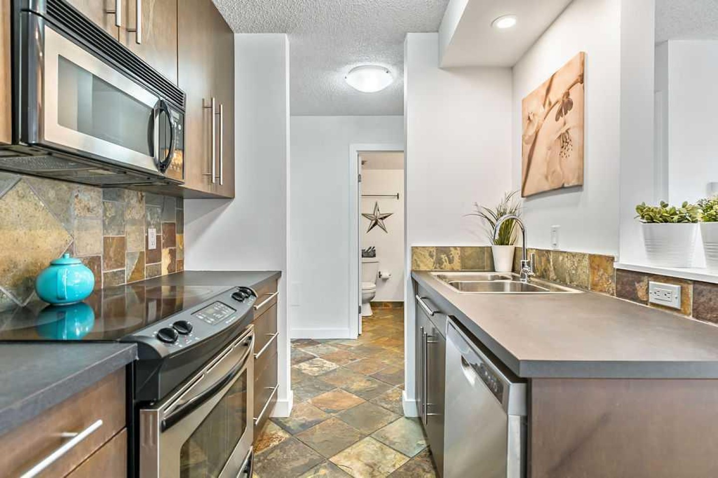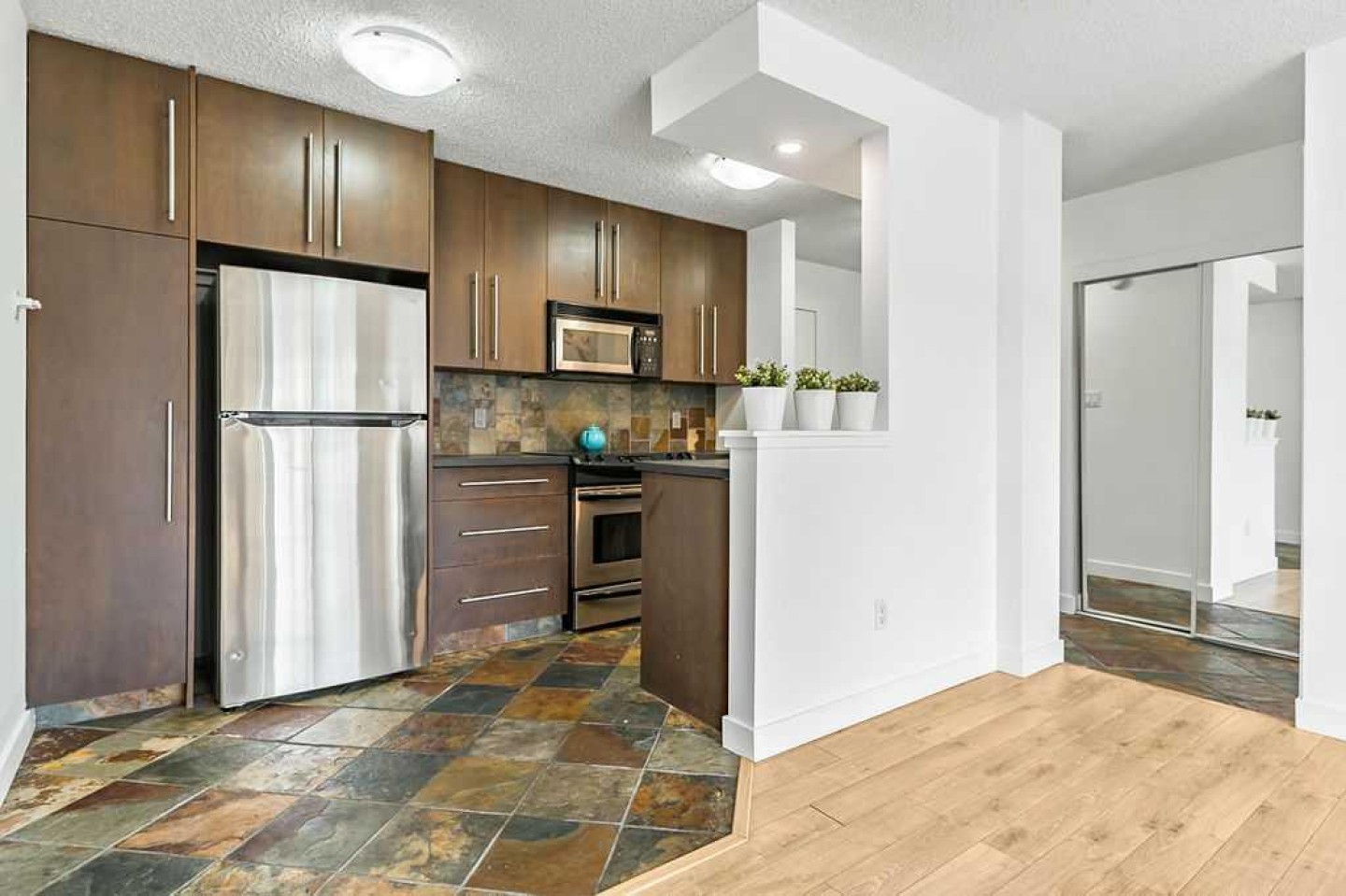 Bright and stylish top-floor condo in a quiet, concrete building in the desirable community of Bankview. This well-maintained suite features a functional open-concept layout, updated flooring, a custom kitchen, and convenient in-suite European washer/dryer. Spacious bedroom includes a custom wardrobe, while the bathroom offers a relaxing soaker tub and large vanity. Enjoy west-facing views from your private balcony. Additional features include assigned parking and a main-level storage locker. Solid concrete construction provides excellent sound insulation, no post-tension cables, storage, and private setting offer comfortable and quiet living. Ideally located within walking distance to 17th Avenue’s shops, cafés, and amenities, with easy access to transit and downtown. Pet friendly with board approval (2 cats or 1 cat and 1 dog permitted). A fantastic opportunity for low-maintenance inner-city living!