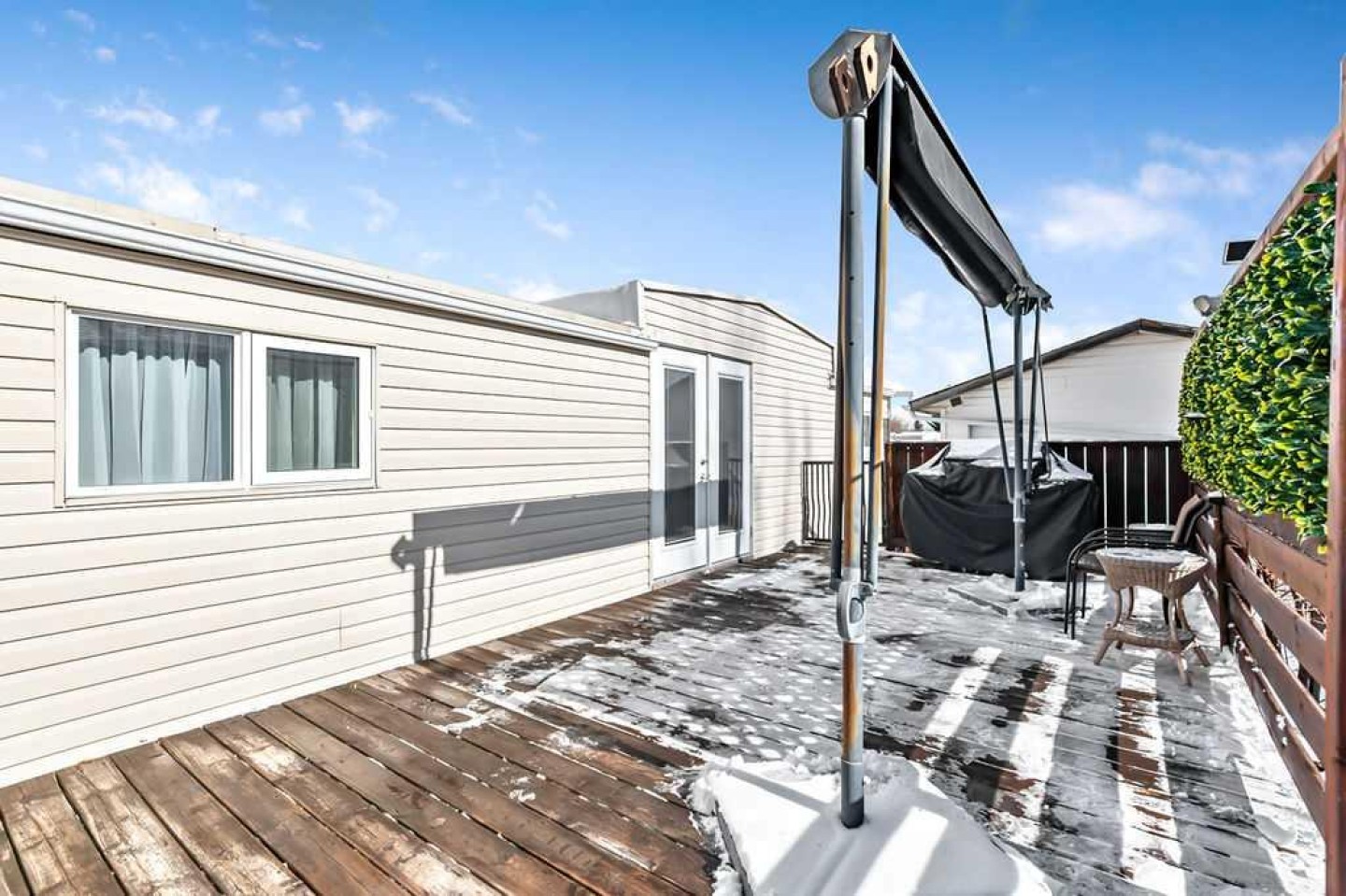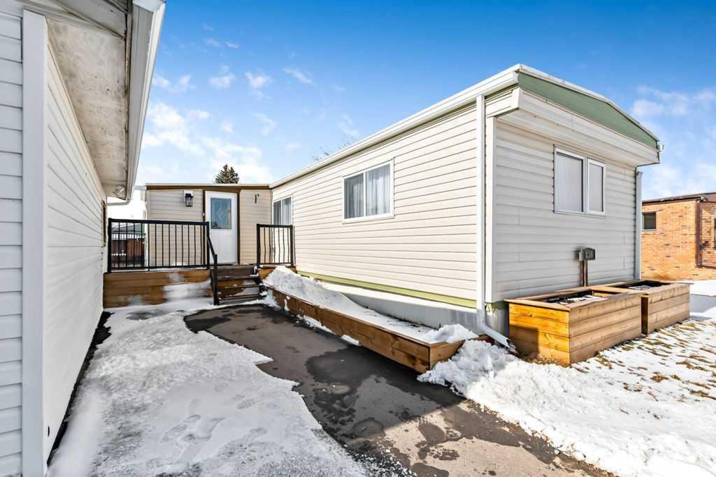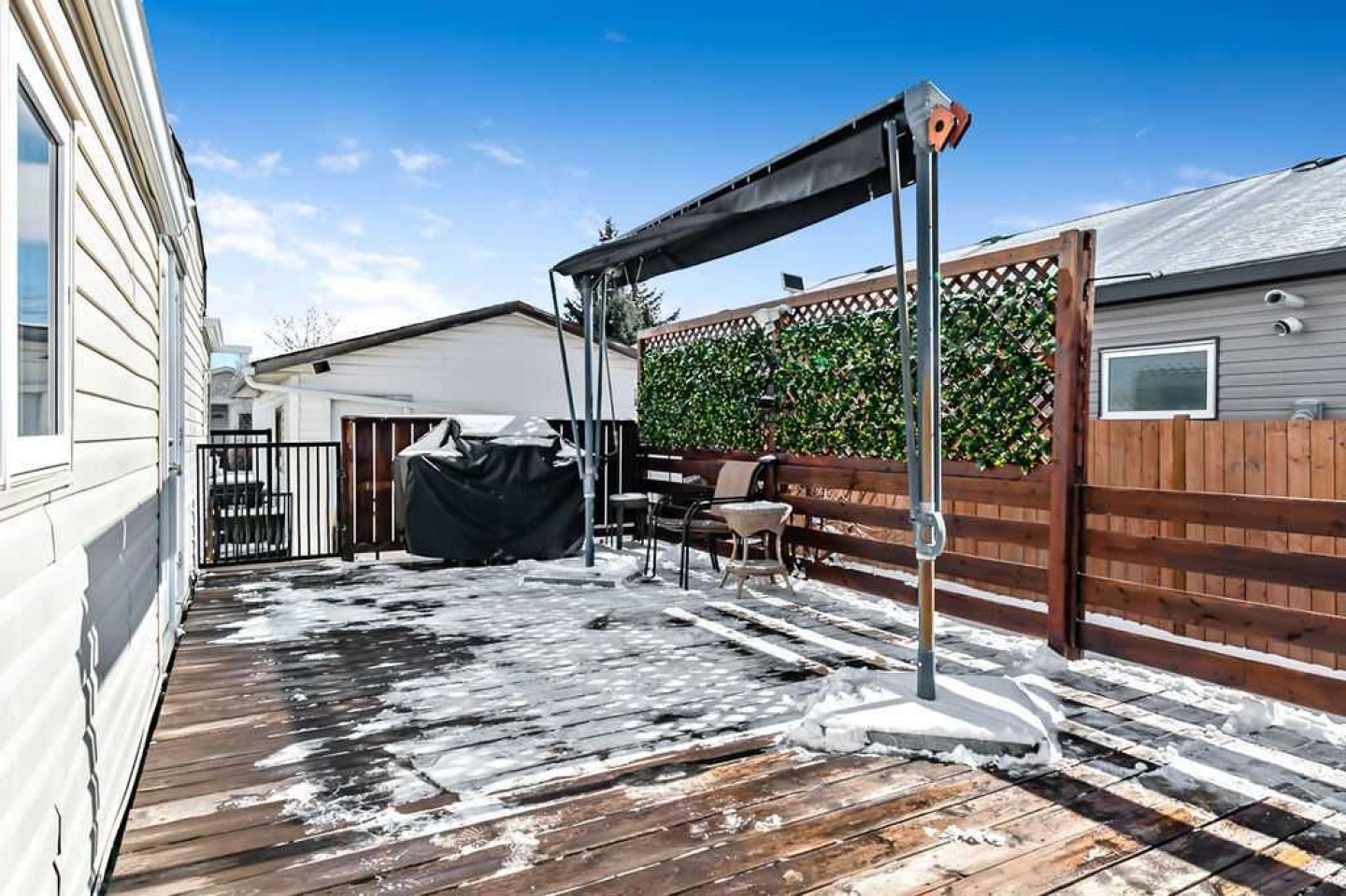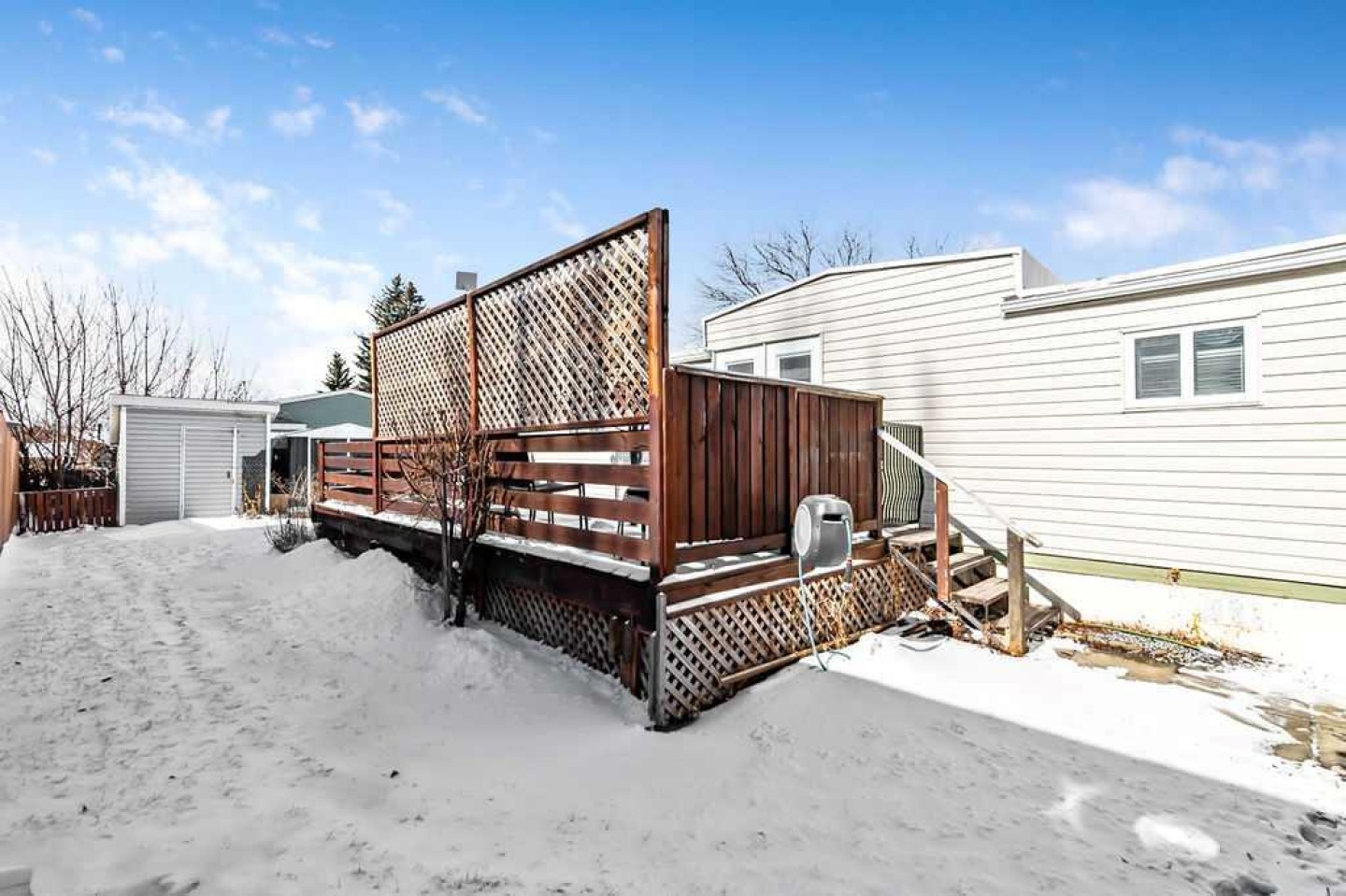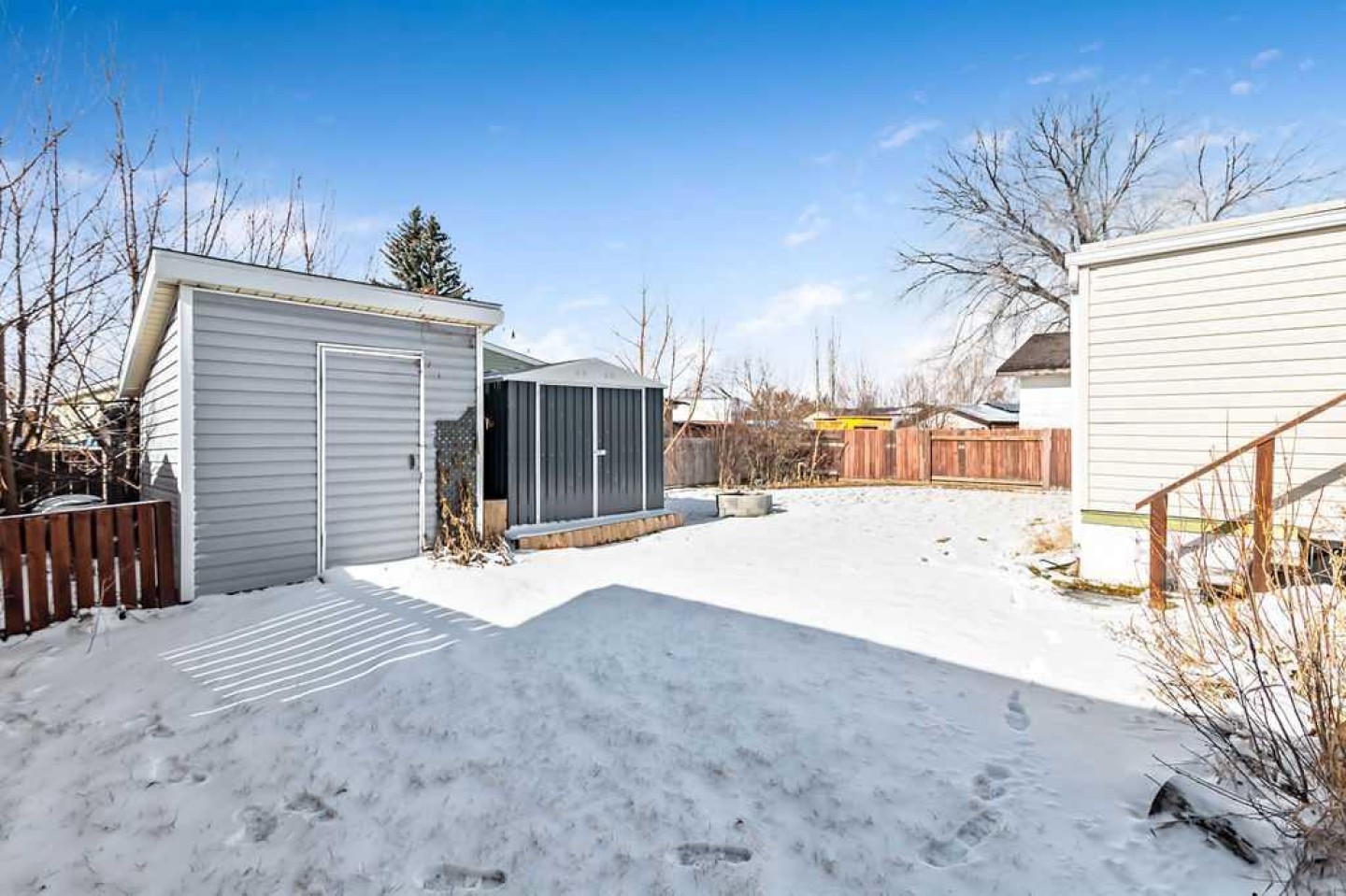 Over 1290 sqft of living space offering 2 bedrooms, 1 bathroom and no lot fees. Situated on a generous lot of over 5,400 sqft this property also features a single detached garage. Upon entering, you’re welcomed by an open-concept layout with the kitchen island serving as the focal point of the home. The kitchen features stainless steel appliances and cabinetry that extends all the way to the ceiling, offering both style and functionality. The open design allows you to easily entertain guests in the living room while preparing meals in the kitchen. The spacious living room provides plenty of room for family gatherings, making it perfect for entertaining or relaxing during movie nights. The home also offers a generously sized 4-piece bathroom. The primary bedroom is impressively large, easily accommodating a king-size bed while still leaving ample space on both sides. It also features a walk-in closet—no more fighting over closet space. The second bedroom is ideal for a growing family, guest room, or home office. A flex room off the hallway leads out to the large deck, creating a great transition between indoor and outdoor living. Enjoy summer barbecues on the deck, which includes an awning and privacy wall so you can stay shaded and enjoy extra seclusion when desired. The expansive yard provides plenty of space to relax and unwind. Two large sheds offer excellent storage, and the fire pit creates the perfect setting to end summer evenings gathered around the fire. The single garage has been upgraded with insulation, drywall, and 240V power—ideal for anyone who enjoys working on vehicles or spending time in the workshop. Conveniently located close to schools, parks, and shopping this home offers everything you need within easy reach. Homes like this don’t last long—book your showing before it’s gone!