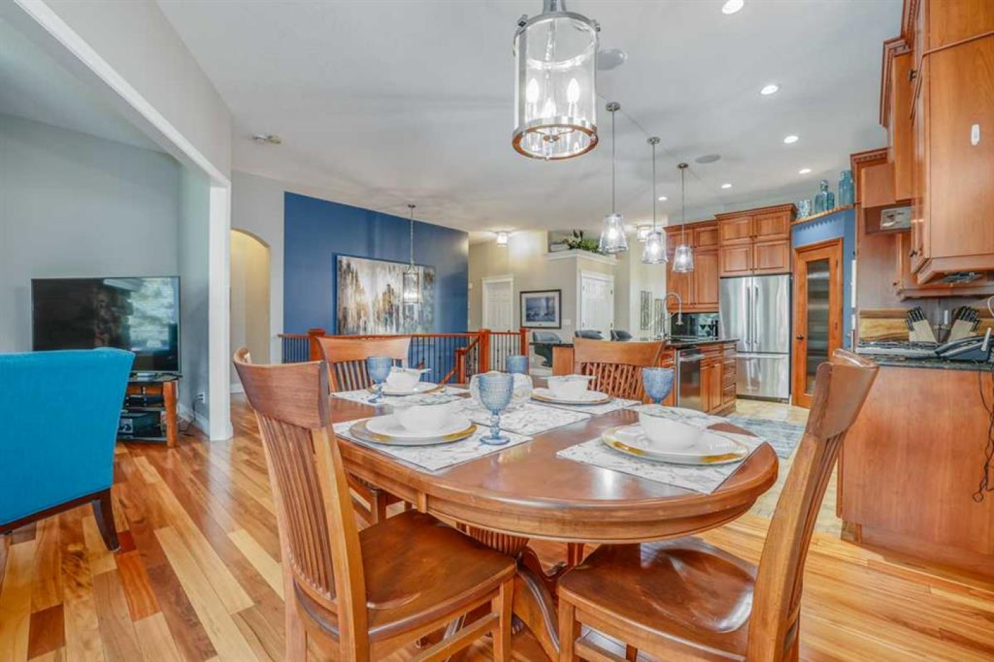 "WELCOME TO YOUR DREAM HOME" An exquisite custom walkout bungalow nestled on an exquisite, landscaped lot, on a quiet culdesac backing onto beautiful Crystal Ridge Golf Course. The home features vaulted ceilings, tigerwood hardwood floors, air conditioning, and numerous extras. The spacious open design includes a living/family room with a gorgeous stone fireplace for cozy evenings, a lovely dining area for formal times, a chef's gourmet haven including a gas range, a built-in oven & warmer, loads of cupboards, granite counters, walk in pantry, and a fantastic huge island for entertaining. The primary bedroom features a walk in closet and five piece ensuite complete with a therapeutic air bath tub. Eating area has access to the wrap around deck to enjoy the beautiful privacy and the evening sun. For convenience, laundry and a powder room on main floor. Lower walkout level features a family/games/theatre room for enjoyable fun times. There are an additional two bedrooms, an office/den, and three piece bathroom, as well as space for a gym. The patio area features a beautiful hot tub, and steps away, a cozy firepit. The numerous extras include underground sprinkler system, Allure outside lighting, water lines in garage and on deck, air conditioning, all closets with auto lights, surround system upstairs in living & dining room, kitchen, ensuite and upper & lower deck, movie system downstairs with sub-woofer, and natural gas outlets on both upper & lower decks. Recent upgrades include roof shingles (2017), fridge with water & ice (2023), dishwasher (2024), microwave (2024), vacu flo (2023), new in slab heating pump (2024), 75 gallon hot water tank (2024), new blinds (2023). This home is located in a quiet long culdesac with a west facing back yard in beautiful Okotoks. The annual HOA gives access to Crystal Shores lake just blocks away. Don't miss viewing this lovely home, its PRECIOUS! No sign on property.