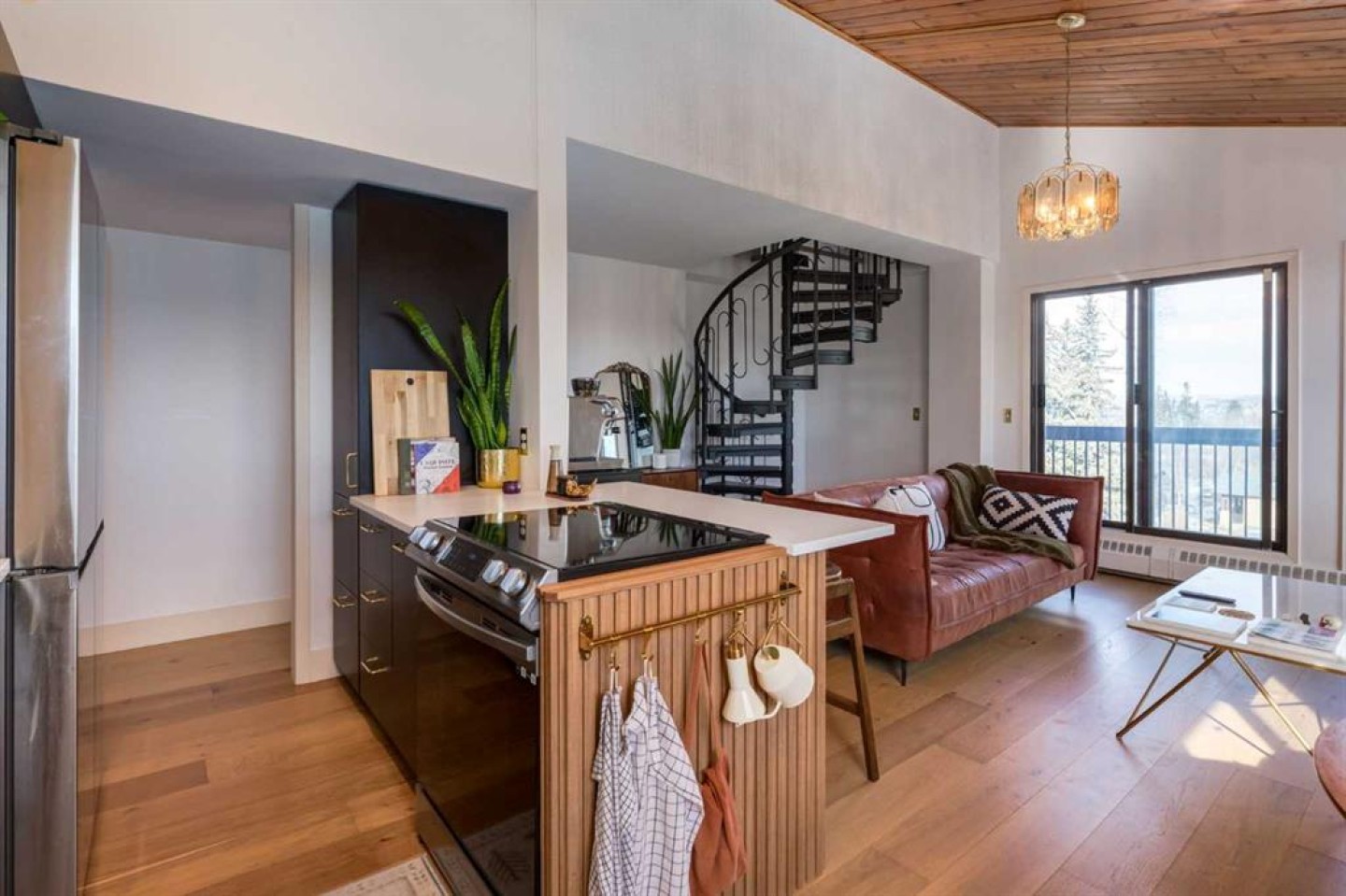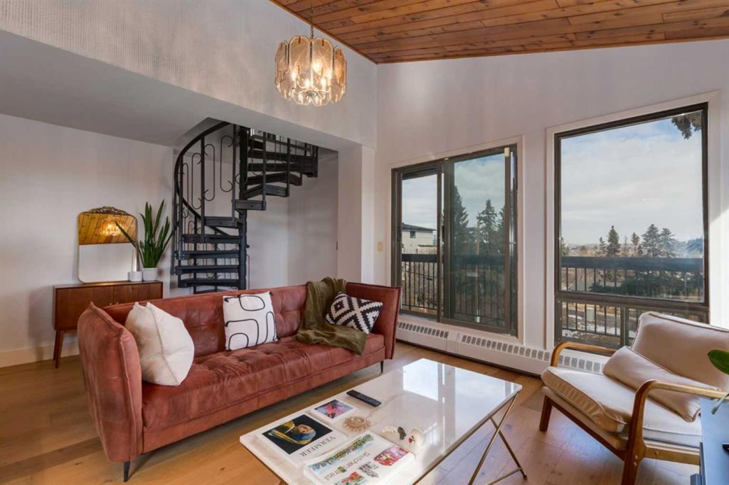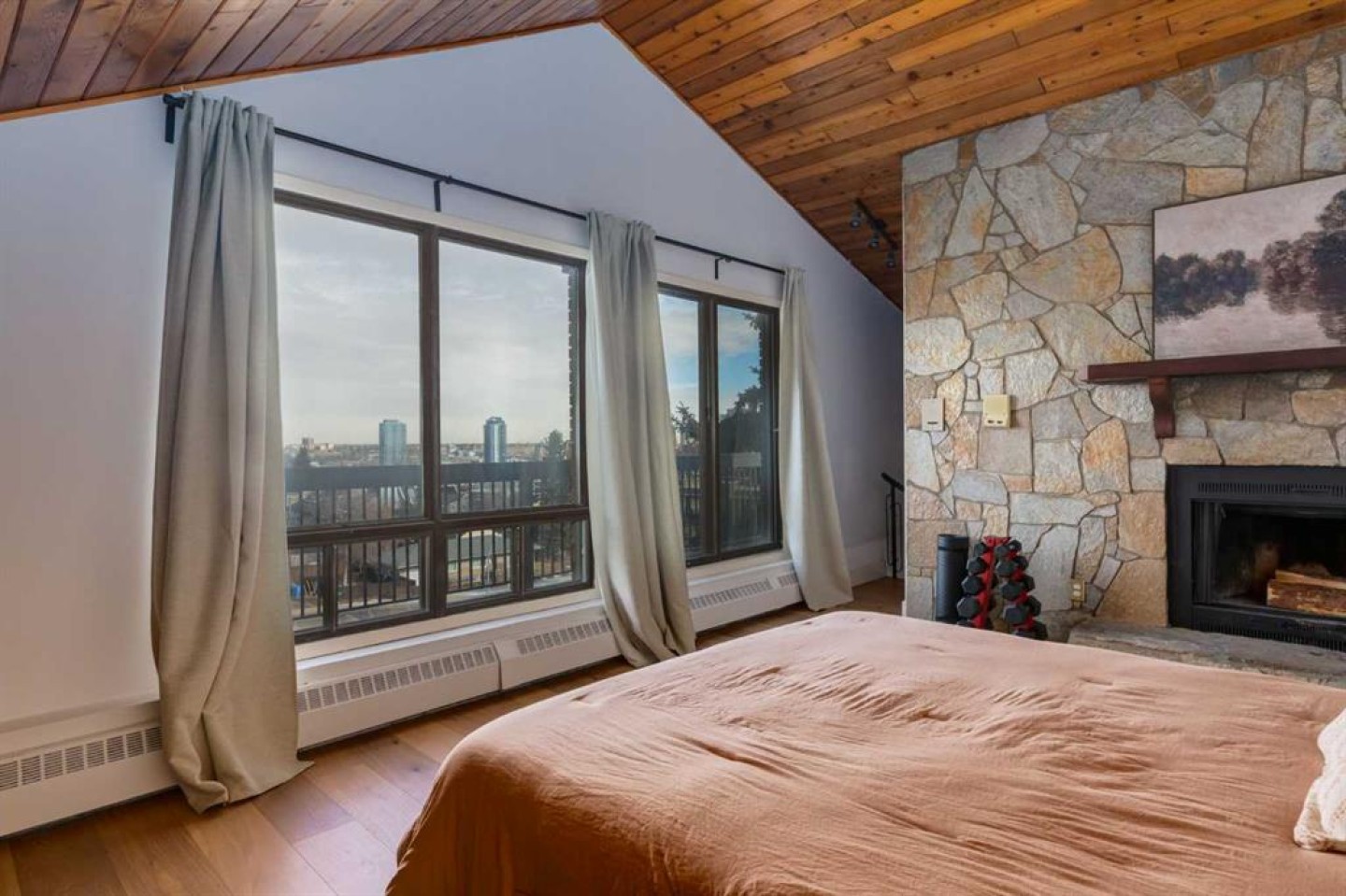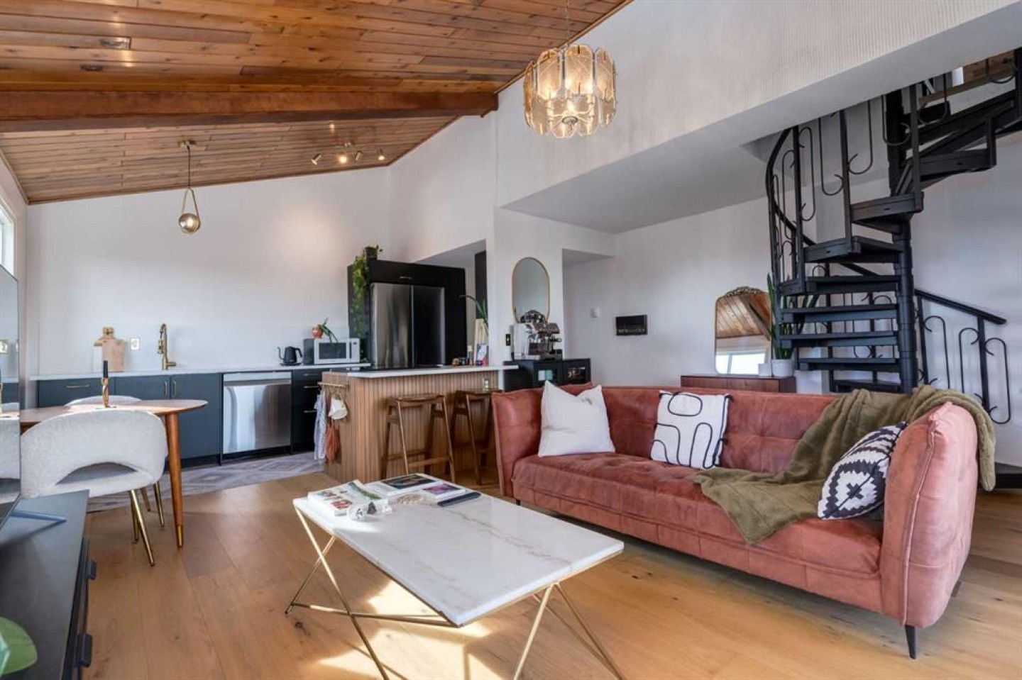 Rare loft-style two-storey condo with incredible downtown skyline views in Knob Hill Estates. Located in the heart of Bankview, just two blocks from 17th Ave SW, this bright and unique home offers a true inner-city lifestyle. The main level features brand new engineered hardwood flooring, tall slanted ceilings, and a bright open layout. The fully renovated kitchen includes stainless steel Samsung appliances and opens to the spacious living and dining area and access to a private balcony with city views. Two bedrooms and a beautifully renovated bathroom with Italian marble complete the main floor. A dramatic spiral staircase leads to the upper loft,with a wood-burning fireplace—perfect as a family room, office, or studio—with access to a second balcony overlooking downtown. Includes 2 underground heated parking stalls, storage, in-suite laundry, and a pet-friendly building. Minutes to downtown, Marda Loop, parks, and transit.