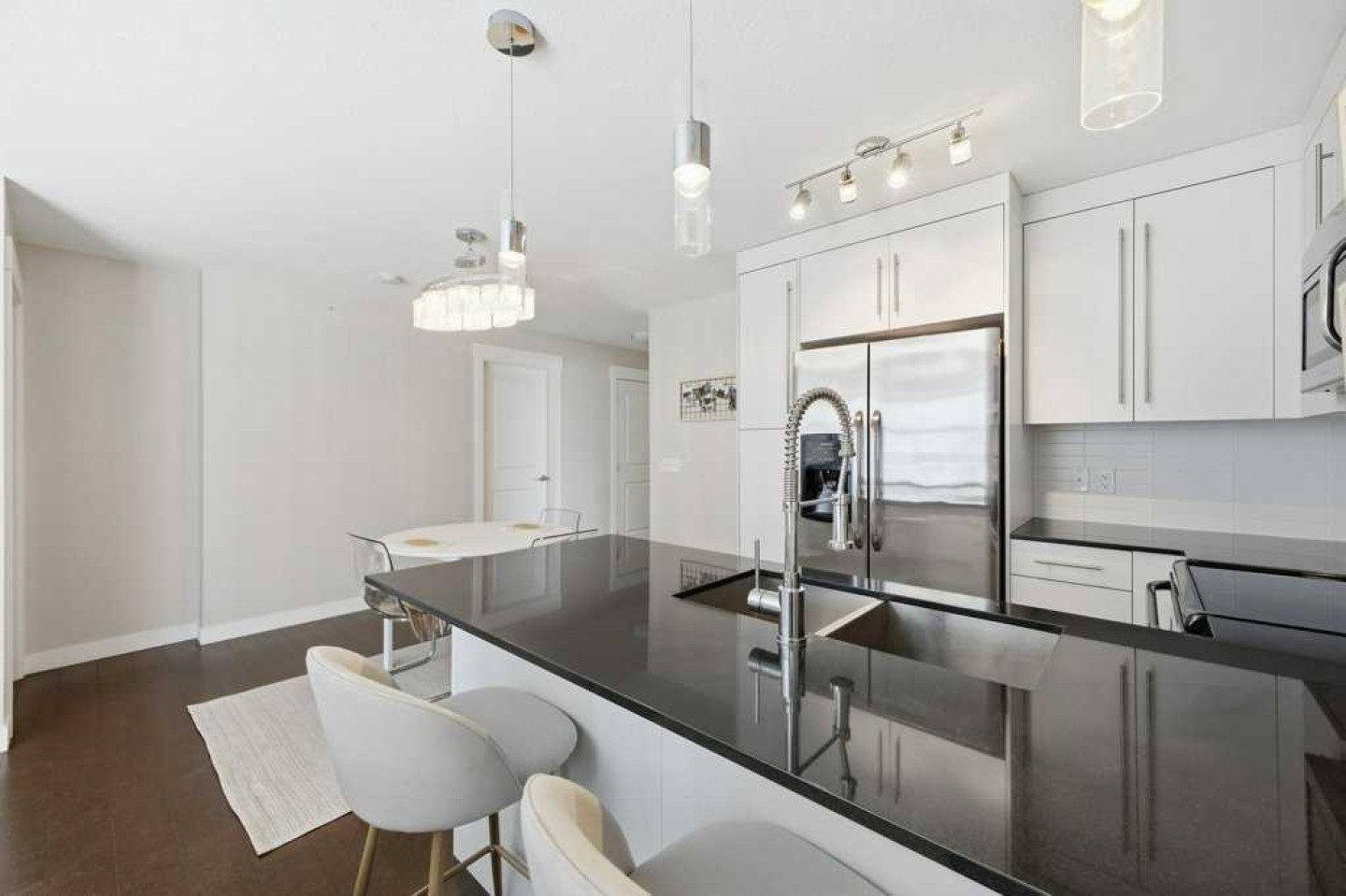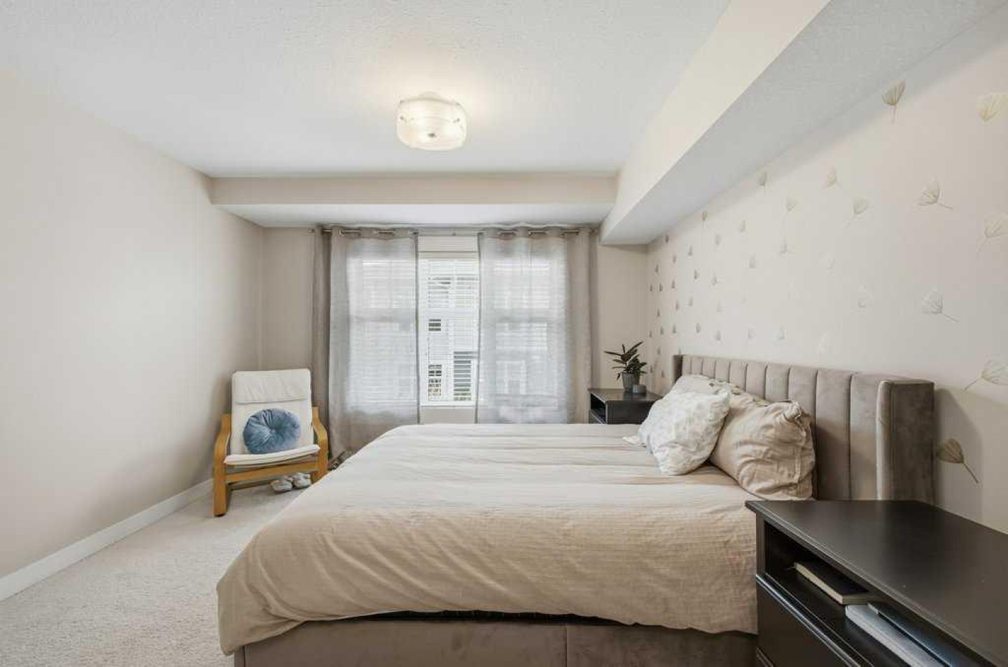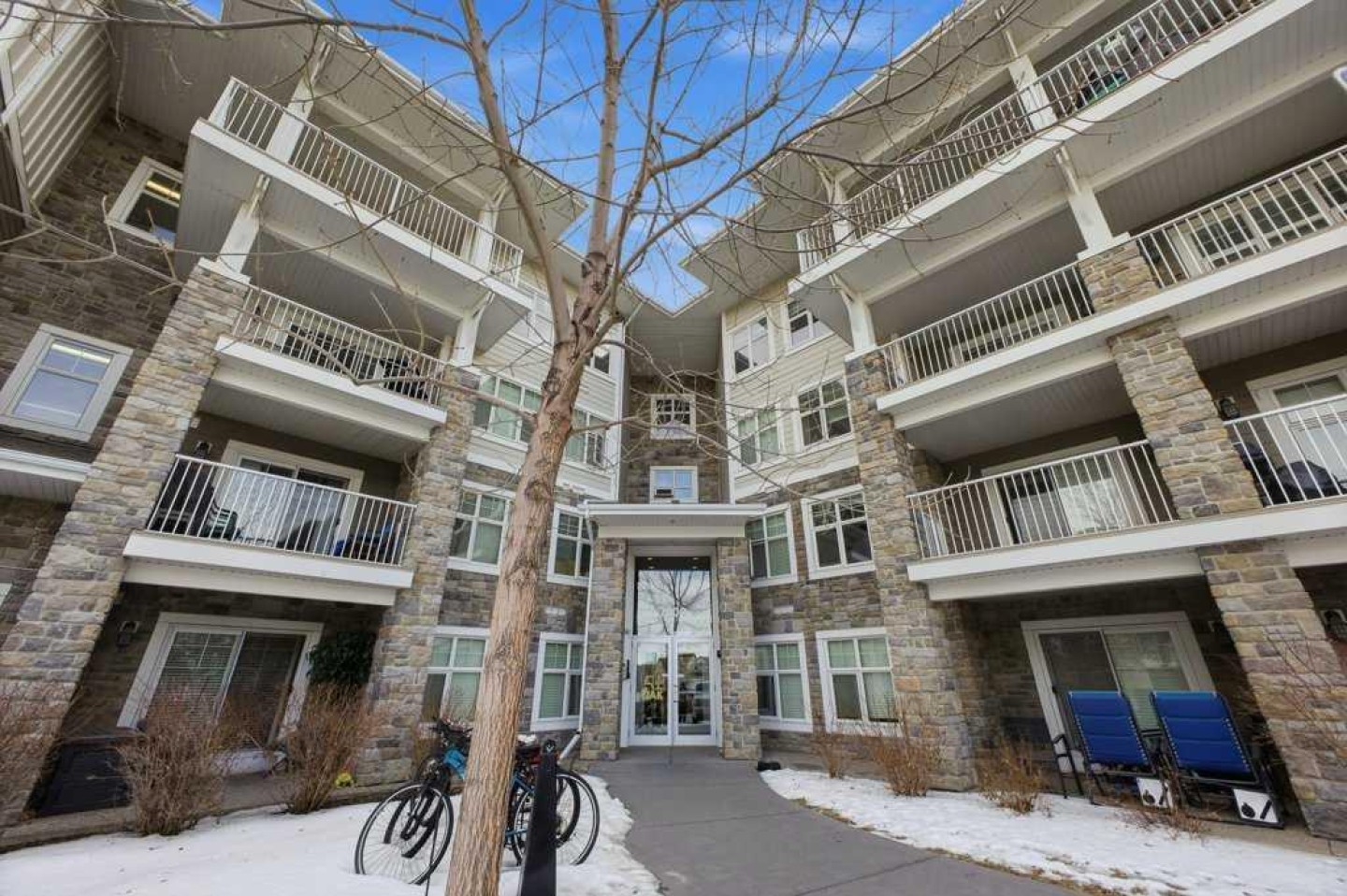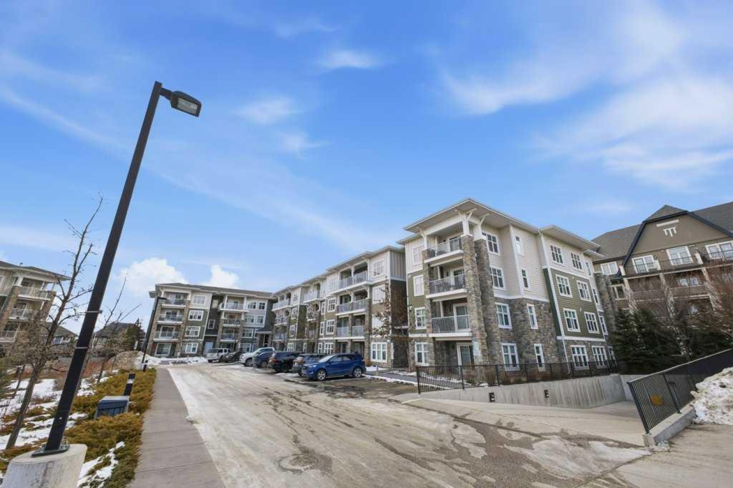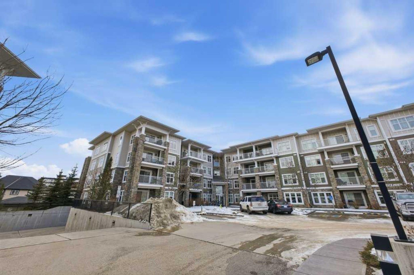 This is a top-floor corner unit and that matters. No one above you, no noise from the hallway on two sides, and windows wrapping the south, southeast, and southwest. Natural light from morning through evening. It's one of the quieter positions in the building, and one of the larger floor plans available. The living room is generous for a condo this size. There's room for a proper sofa, a coffee table, and still space to move around. The cork flooring runs through the main living areas. It's softer underfoot than hardwood and keeps the space feeling warm. This isn't a unit where you feel like you're living in a box. The corner layout gives you that extra breathing room that most condos in this price range just don't have. The kitchen sits open to the living and dining area with no walls cutting it off and no awkward transition. Upgraded appliances, a microwave hood fan above the stove, good counter space, and enough cabinetry to actually store things. The layout is practical and the flow makes sense whether you're cooking for one or having people over. There's also a built-in desk just off the kitchen area, It keeps a workspace tucked in without eating up a whole room. The dining area sits between the kitchen and the living room, big enough for a full table and chairs, with natural light coming in from multiple directions. Morning coffee here with the south sun coming through is a pretty good way to start a day. The primary bedroom comfortably fits a king bed with nightstands on both sides and still leaves you room to move. Dual closets mean storage isn't an issue. The 4-piece ensuite is off the primary and well-sized. It's your own bathroom, private to the bedroom, which matters when you have guests or a roommate using the second bath. The second bedroom is also a solid size, fits a queen easily, and works just as well as a home office or flex space if you don't need the second bedroom full time. It has direct access to the second full 4-piece bathroom in the hall. In-suite laundry is included, washer and dryer in the unit. Step out onto the south-facing balcony. You've got south and west exposure, which means afternoon and evening sun. One titled, heated underground parking stall is included. Assigned storage locker also included, separate from the unit, on the parkade level. Condo fees cover heat, water. Electricity is the only utility you're paying separately. Outside the front door, you're in Mahogany, one of the few lake communities in Calgary where the lake access is actually good. Residents get two beaches, the Beach House, tennis courts, a skating rink in winter, and over 35 km of pathways that wind through the wetlands. It's a community where people actually use the amenities. Seton is a short drive with a grocery store, restaurants, coffee shops, a Cineplex, and South Health Campus all within a few minutes. Deerfoot and Stoney Trail are both easily accessible.