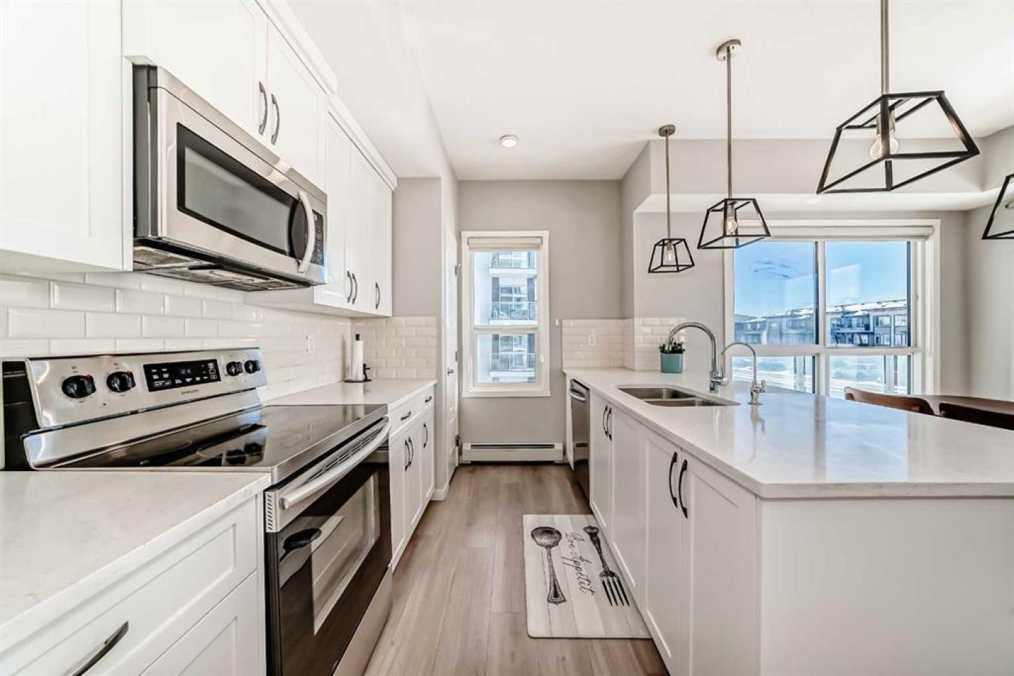 Welcome to this stunning SOUTH-FACING CORNER unit on the second floor, offering exceptional natural light from morning to evening. This modern, beautifully maintained home features a bright open-concept layout with 9’ ceilings, triple-pane windows, and durable vinyl plank flooring throughout. The stylish kitchen is the heart of the home, highlighted by a gorgeous oversized island, quartz countertops, stainless steel appliances, and a pantry, making it perfect for both everyday living and entertaining. The spacious primary bedroom includes a walk-in closet and private 4-piece ensuite, while the second bedroom and additional 4-piece bathroom provide comfortable space for guests, family, or a home office. You’ll also appreciate the convenience of in-suite laundry with additional storage. Step outside to the WRAP-AROUND balcony with a gas BBQ hookup, ideal for relaxing or hosting summer gatherings. This unit comes with TWO TITLED SIDE-BY-SIDE underground heated parking stalls (#329 & #330) located close to the elevators, plus one assigned storage locker (#120) for extra storage. The location is unbeatable—steps to the world’s largest YMCA, Calgary Public Library, VIP Cinema, and South Health Campus, with walking distance to bus stops, schools, parks, playgrounds, and extensive walking and biking pathways. Pet owners will love the nearby green space and off-leash dog park just minutes away. Plus, enjoy the future convenience and value of being just steps from the upcoming Green Line LRT. Modern design, unbeatable location, and exceptional value—this home truly has it all. Don’t miss your chance to make it yours!