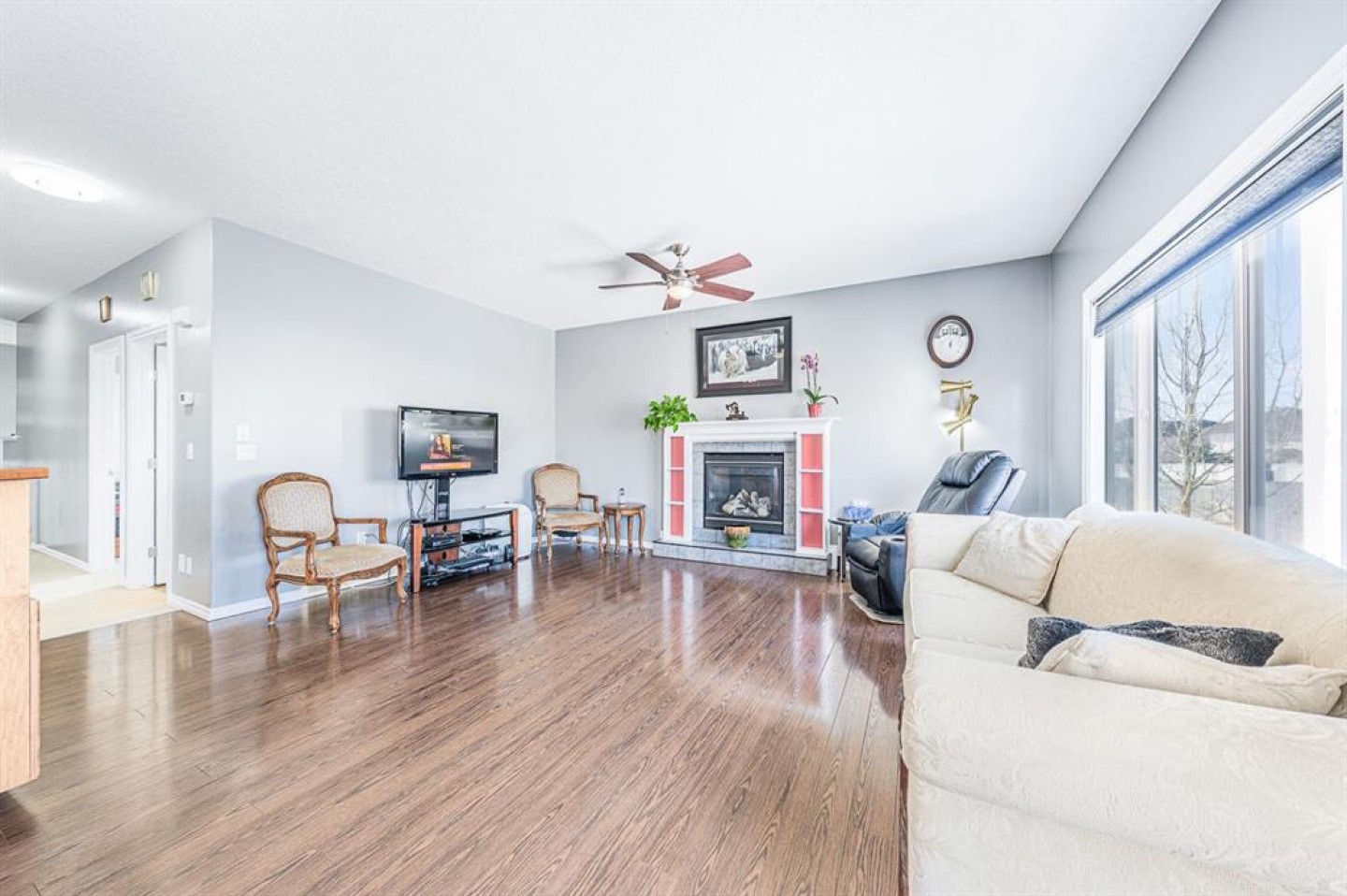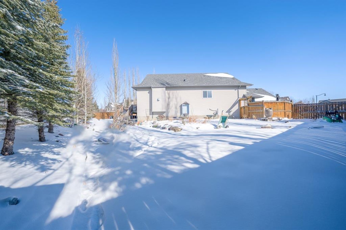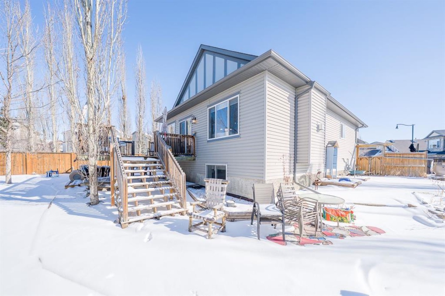 Situated on a pie lot in the lake community of Crystal Shores, this home offers a total of 3 bedrooms, 2 full bathrooms and nearly 2000 sq ft of developed living area. The main level features a great room with easy to care for laminate flooring and a warm, cozy fireplace. The eat-in kitchen boasts a corner pantry, full height tiled backsplash, black appliances and island with eating ledge, pendant lighting & built-in wine rack. Access to the deck is found through the sliding doors off the breakfast nook. Completing this level are 2 bedrooms including the master retreat with walk-in closet and convenient 4 pc ensuite bath. Basement development includes an incredibly spacious rec room, office niche, 3rd bedroom and storage area. The back yard offers a park like setting with tastefully landscaped flower beds, bushes and mature trees. Located near schools, within walking distance to the Crystal Ridge Golf Club and with lake access privileges, this home is ideal for a growing family.