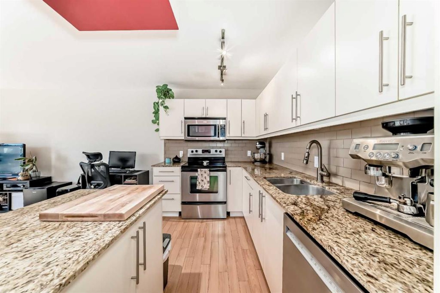 Freshly painted and thoughtfully updated, this bright condo sits in a well-maintained building with fantastic downtown views from a sunny south-facing balcony. The open floor plan, modern kitchen with granite countertops, white cabinetry, and stainless appliances (including a one-year-old Bosch dishwasher) makes entertaining and daily living a pleasure. The living area is bright with laminate flooring running throughout. Large patio doors lead to the balcony for easy indoor- outdoor living. The spacious primary bedroom features a large closet and downtown view. The 4 piece bathroom boasts a granite vanity and a touch of personality with funky wallpaper. The Bosch washer is a year old and there’s the option to install a dryer. There is also a common laundry room in the building. The unit includes secure bike storage and an assigned parking stall. Roof replacement is scheduled for summer 2026. Amazing location steps from the LRT, Safeway, Kensington pubs and restaurants, SAIT, University of the Arts, and Jubilee, with easy access to downtown, U of C, Foothills and Children’s Hospital campuses. Bike lanes, walking paths, plus off-leash dog parks, are nearby for an active urban lifestyle.
