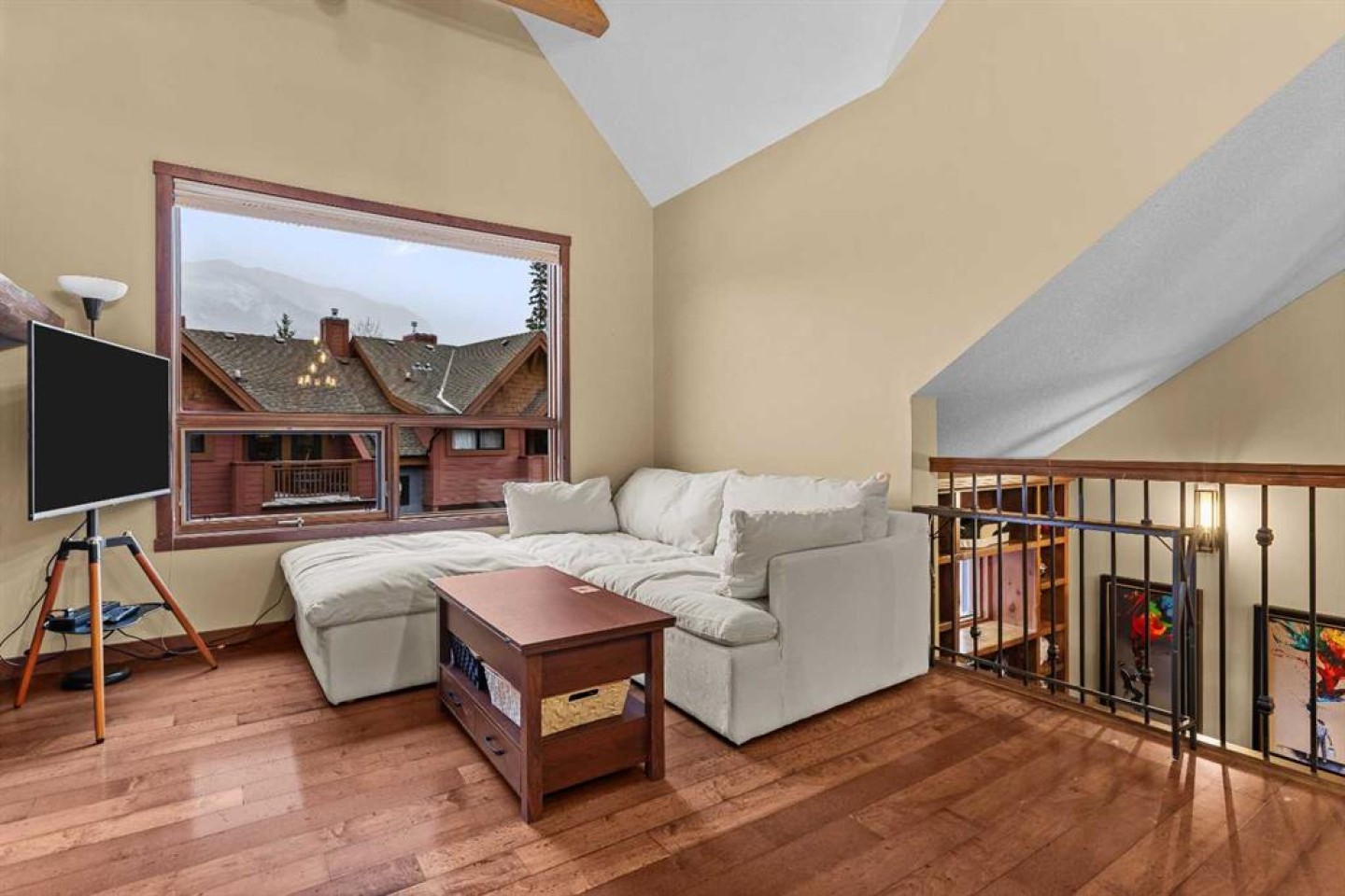 This bright top-floor, end-unit townhouse offers two bedrooms and two bathrooms with mountain views, high ceilings, and no neighbours above. Large windows flood the space with natural light, creating an airy feel throughout. The living area features a cozy fireplace, while two private balconies, one off the dining area and one with access from the primary bedroom and living room, offer the perfect spots for morning coffee and unwinding in the evening with mountain views. A single-car garage plus driveway parking adds everyday convenience. Ideally located just down the street from the new Gateway at Three Sisters commercial district, you’ll have easy access to shopping, groceries, and more.