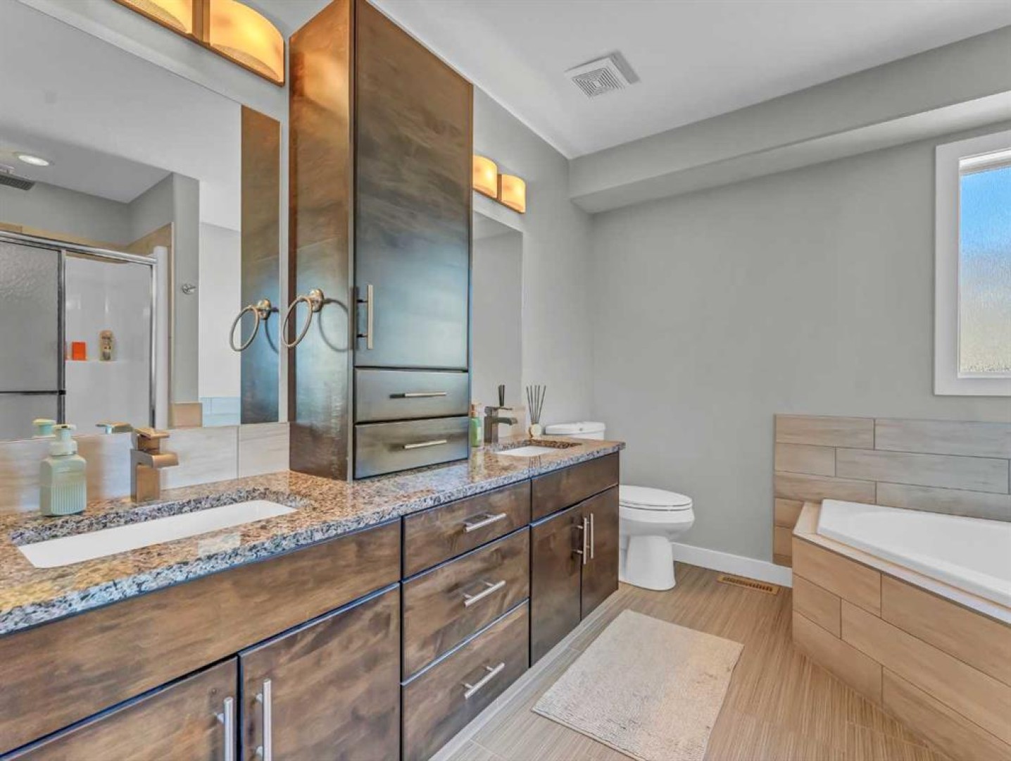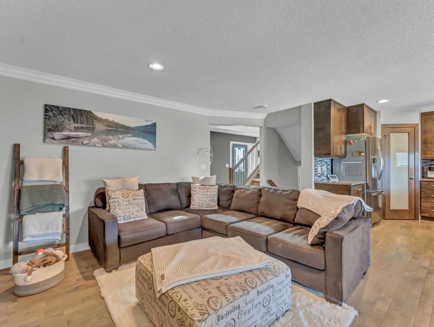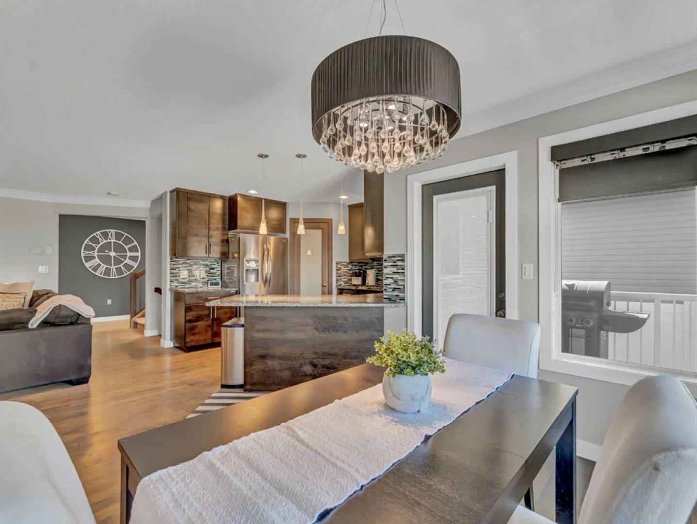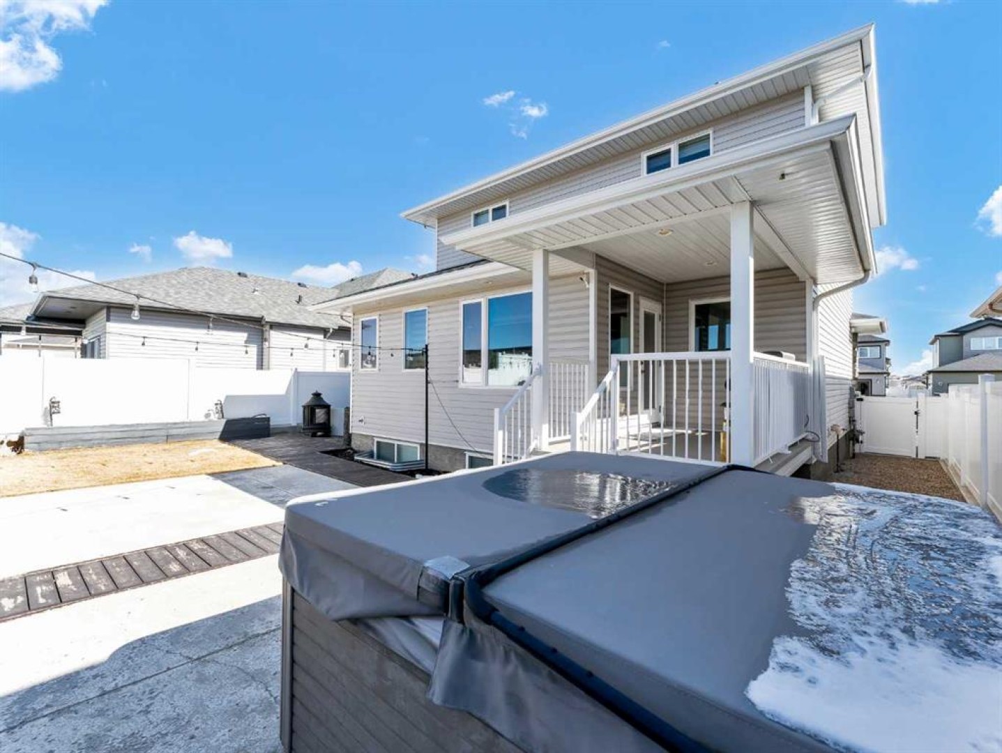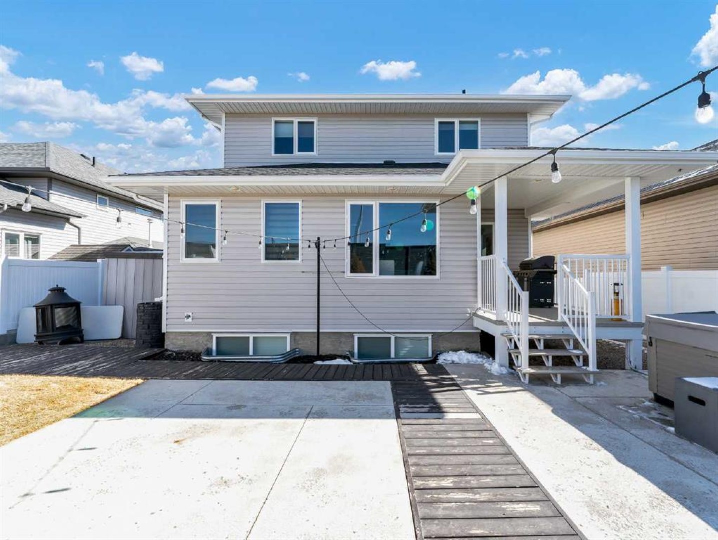 Thoughtful details throughout this home create a warm and inviting atmosphere, starting with the real hardwood flooring that flows seamlessly across the main floor. The entry way is the perfect welcome into the home, its bright and inviting. The open-concept living space is filled with natural light from large windows and includes a conveniently located main floor office—perfect for staying connected with family while working or enjoying views of the lovely backyard. The kitchen showcases custom details, modern yet warm finishes, a peninsula feature with eat up seating, a corner pantry, and stainless steel appliances, making it both stylish and functional . The living room is a cozy focal point with built-in cabinetry and stunning tile work surrounding the gas fireplace. Upstairs you’ll find three well-sized bedrooms and a conveniently located laundry room complete with sink and cabinetry—right where all the laundry happens! The primary bedroom features a walk-in closet with a window and built in features, and a private ensuite with a relaxing soaker tub, double sinks and a walk in shower. The bright and welcoming basement offers a spacious family room, a beautifully done bathroom, and a dedicated gym area. This space could easily be converted into a fourth bedroom if desired. Outside, enjoy the fantastic backyard featuring a good size concrete patio, and a hot tub - perfect for relaxing or entertaining. There is a small BBQ deck off the inside dining space with a gas hook up as well. The yard is fully fenced, there are underground sprinklers front and back with a shed for extra exterior storage. The double attached, heated garage is another great feature of this property, and the concrete front drive partners well to allow for ample parking. This home is centrally located with two great playgrounds within close walking distance, and large greenspaces and schools, and other desirable amenities just a stones throw away.