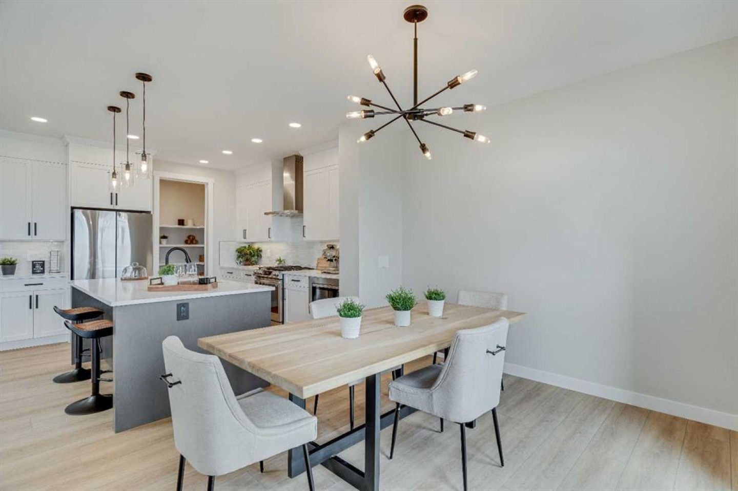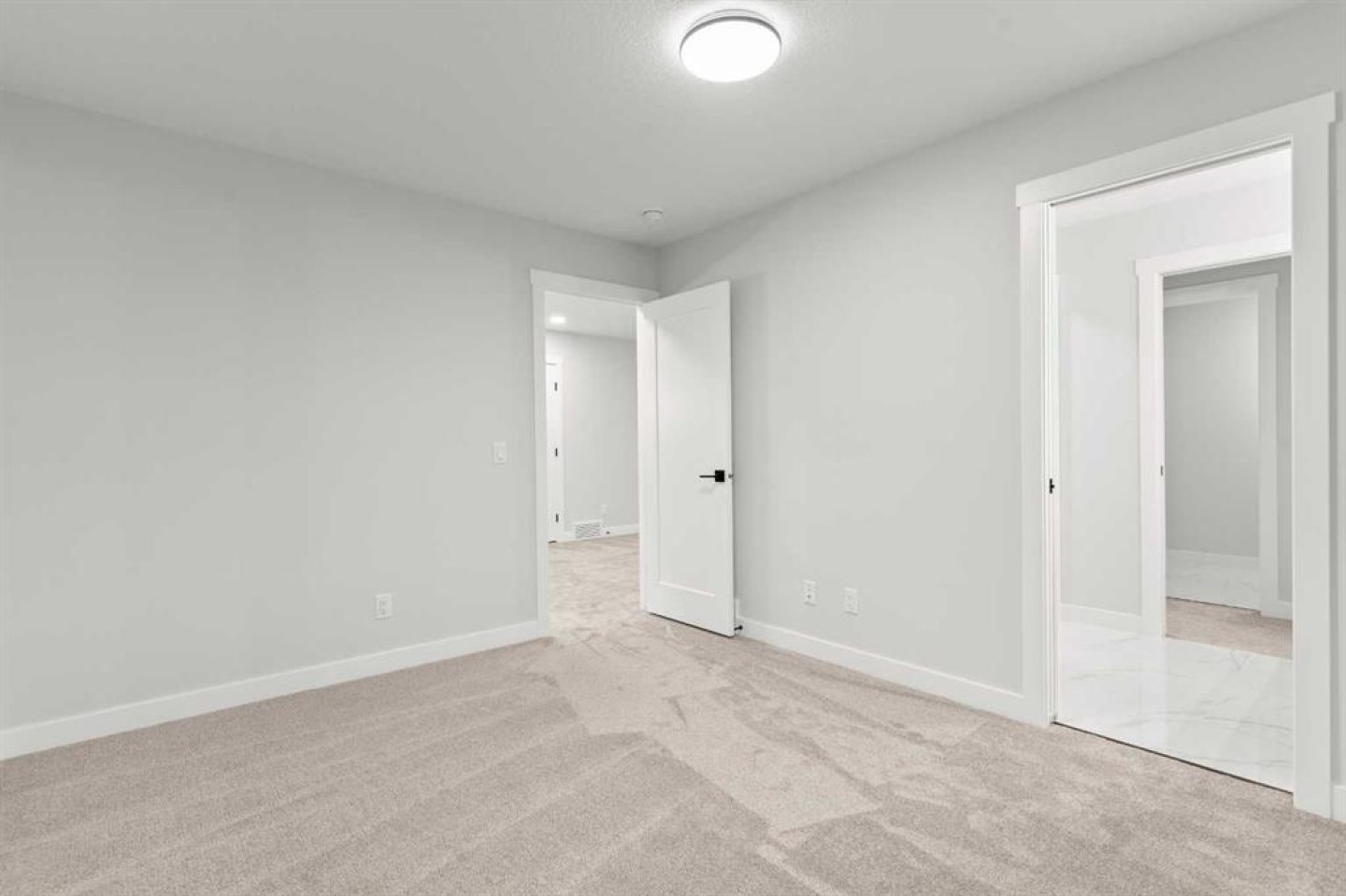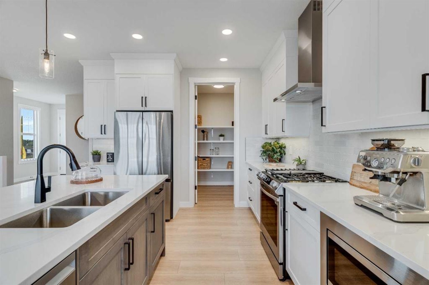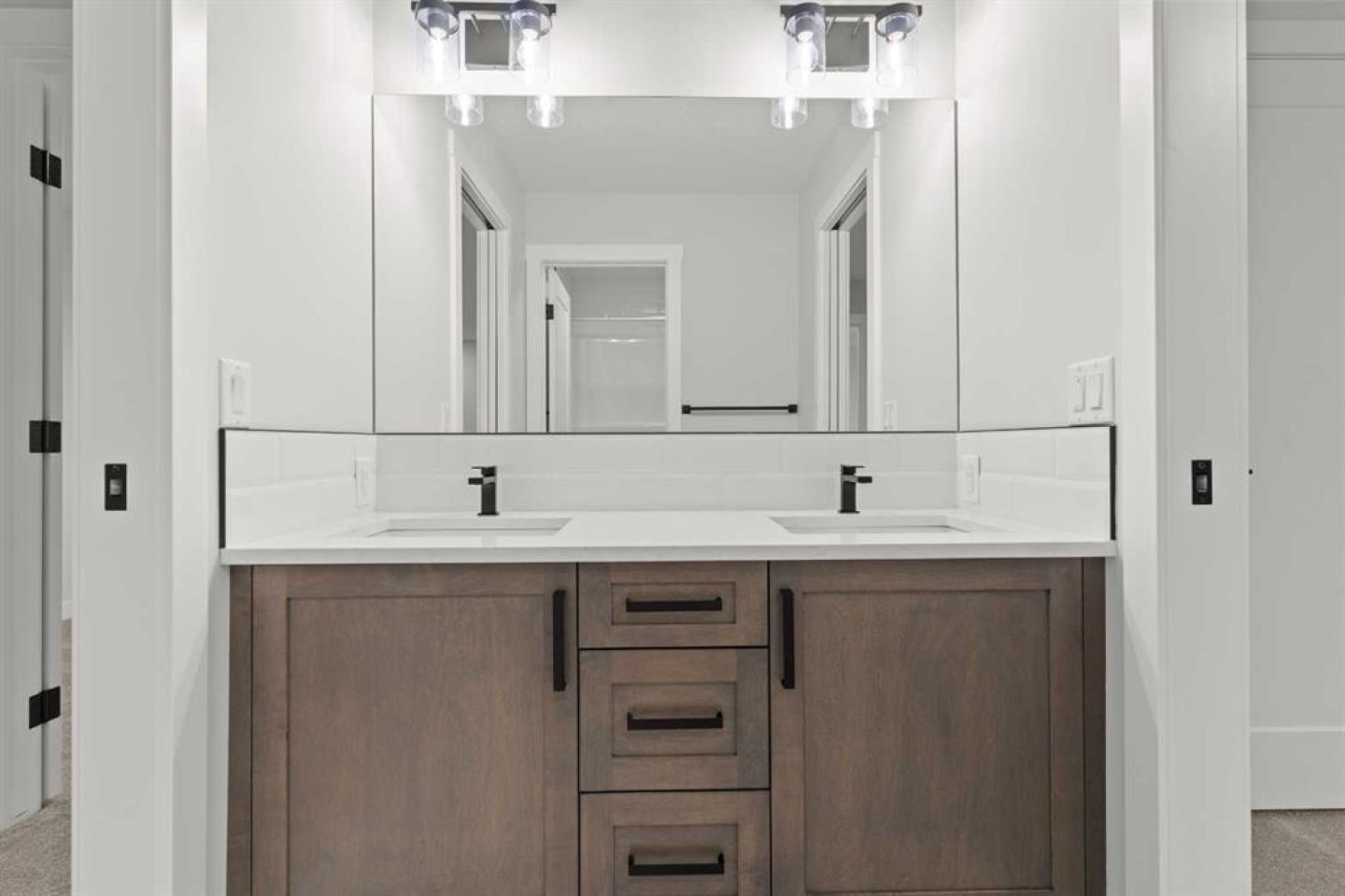 Welcome to 467 Kinniburgh Loop – A 3-Bedroom, 2.5-Bathroom Home by Golden Homes in Kinniburgh South! Built by 5-star builder Golden Homes, this beautifully designed 2,137 sq. ft. semi-detached home delivers modern craftsmanship, premium finishes, and a functional open-concept layout — all in one of Chestermere's most desirable new communities. The main floor welcomes you with 9' ceilings, 8' doors, and a bright, open layout designed for everyday living and entertaining. The upgraded kitchen is the centrepiece of the main floor, featuring two-tone cabinetry, quartz countertops throughout, soft-close drawers with metal sides, upgraded Samsung stainless steel appliances, a built-in microwave with stainless steel trim, and a walk-in pantry with built-in shelving. The dining area is filled with natural light from oversized triple-pane windows, and the living room features a cozy electric fireplace with glass sliding doors opening to your west-facing backyard — the perfect setup for soaking up afternoon and evening sun. A half bath, side entrance, and finished staircase to the basement complete the main level. Upstairs, an oversized staircase with iron spindle railings and an open-to-below feature creates an impressive sense of space. The primary bedroom offers a spa-inspired 5-piece ensuite with a freestanding tub, fully tiled shower with glass doors, double vanity, and private enclosed toilet, plus a custom walk-in closet with built-in drawers and shelving. Two additional bedrooms each have their own walk-in closets and share a Jack & Jill bathroom with double vanity and separated toilet/shower space. The upper level also includes a conveniently located laundry room with quartz countertop and shelving. The basement is fully roughed-in with a separate mechanical room — excellent future development potential. The oversized 20' x 22' front-attached double garage provides ample parking and storage. The exterior is fully graded, loamed, and sodded to the side entrance — move-in ready from day one. As with every Golden Homes build, this home includes the full Golden Standard package: true 9' ceilings on the main floor and basement, tankless hot water heater, HRV system, solar panel rough-in, gas line to the deck, smart home features, upgraded MDF shelving, upgraded carpet underlay, and a front yard tree. Located in the family-friendly neighborhood of Kinniburgh South, you're just minutes from Lake Chestermere, schools, parks, shopping, and everyday amenities. Don't miss your opportunity to be part of the Golden Homes family.