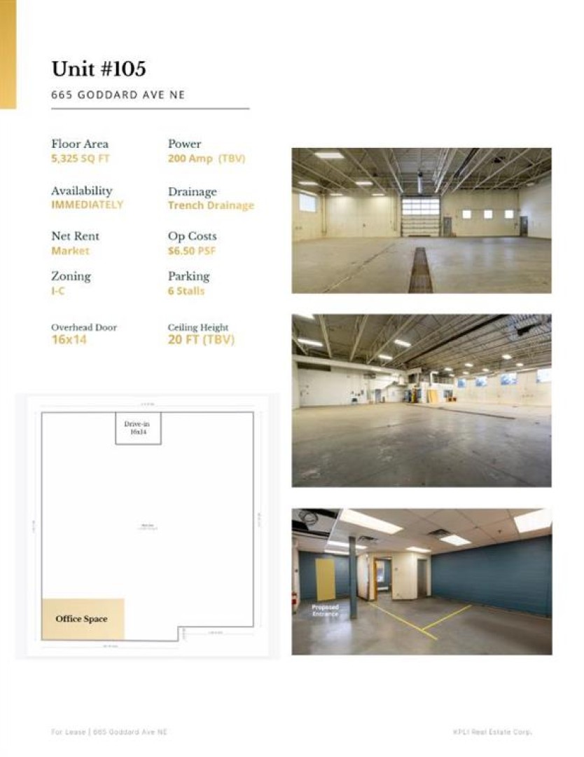Now available for lease, Unit 105 at 665 Goddard Ave NE offers 5,325 SF of versatile industrial space in Calgary’s established northeast industrial corridor. The unit features an efficient open warehouse layout combined with dedicated office space, making it ideal for a variety of industrial, service, or distribution users. The warehouse area provides approximately 20-foot ceiling height (TBV) and is serviced by a 16’ x 14’ drive-in overhead door, allowing for convenient loading and operational flexibility. The space is equipped with trench floor drainage and 200 amp power (to be verified), supporting a wide range of operational needs. The property is zoned I-C (Industrial – Commercial), accommodating numerous industrial and commercial uses. Tenants benefit from six on-site parking stalls, immediate availability, and convenient access to major transportation routes throughout the northeast industrial area.