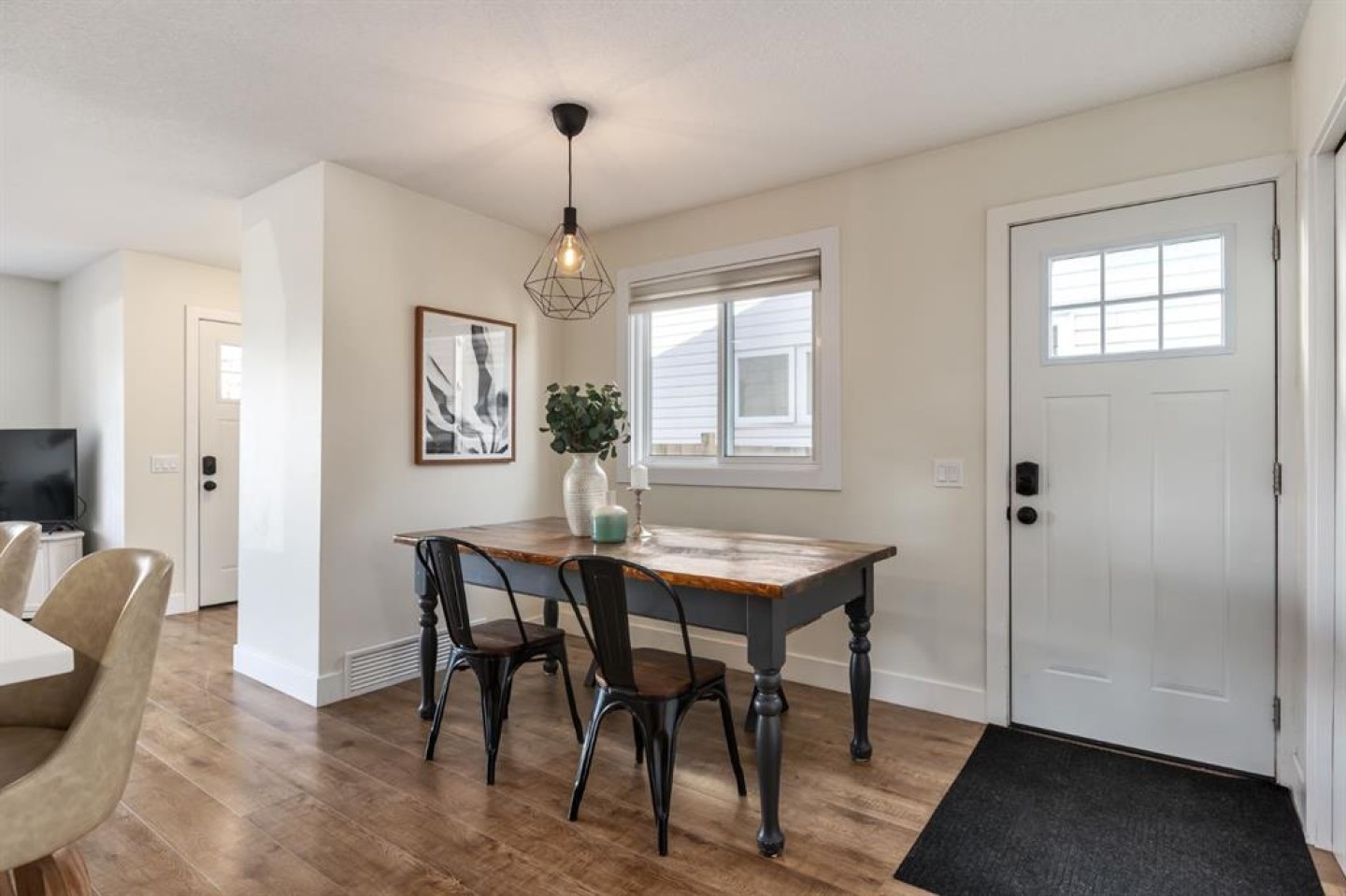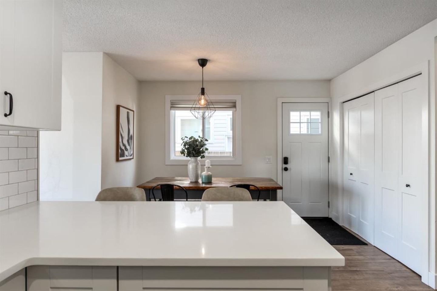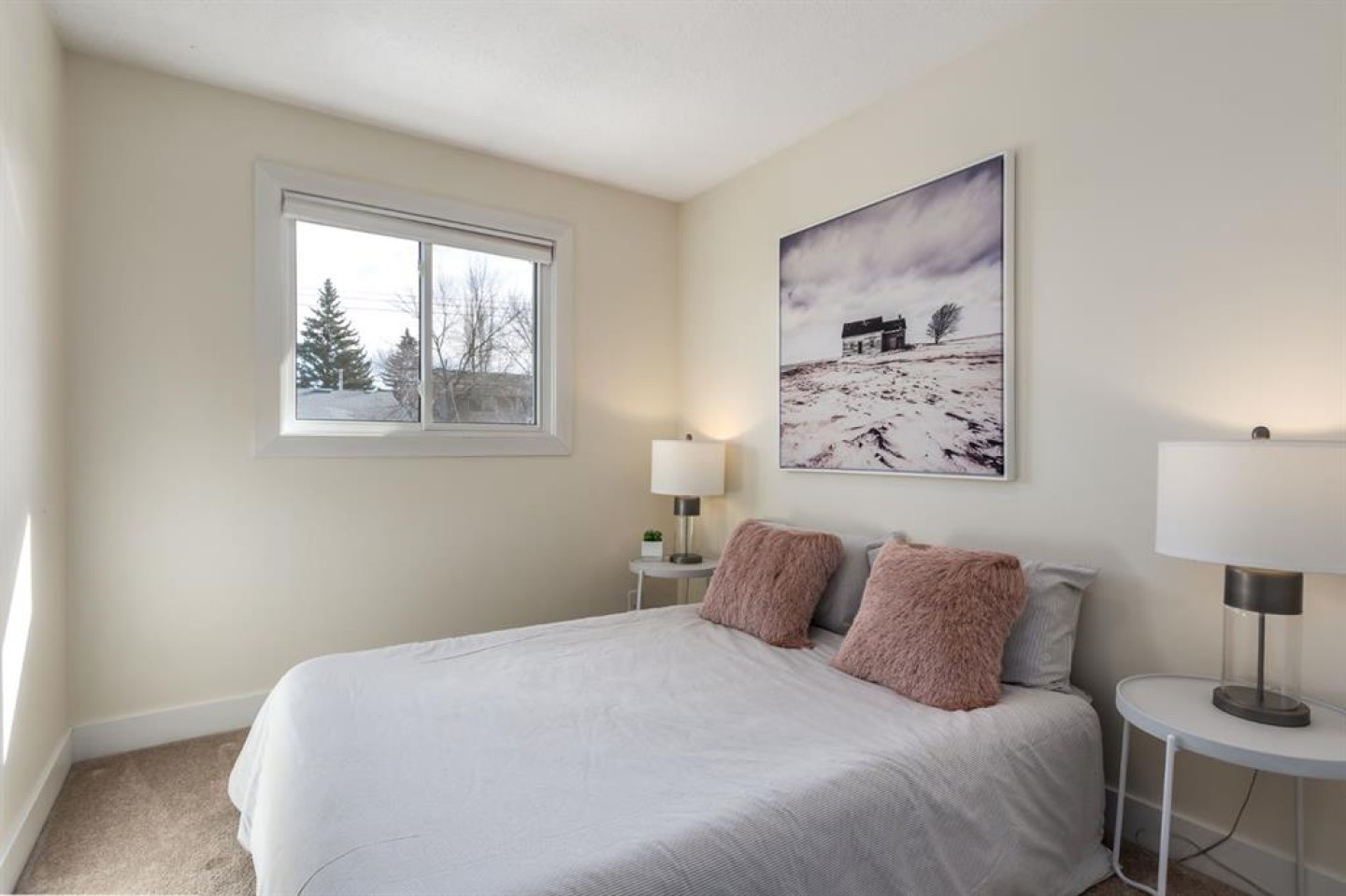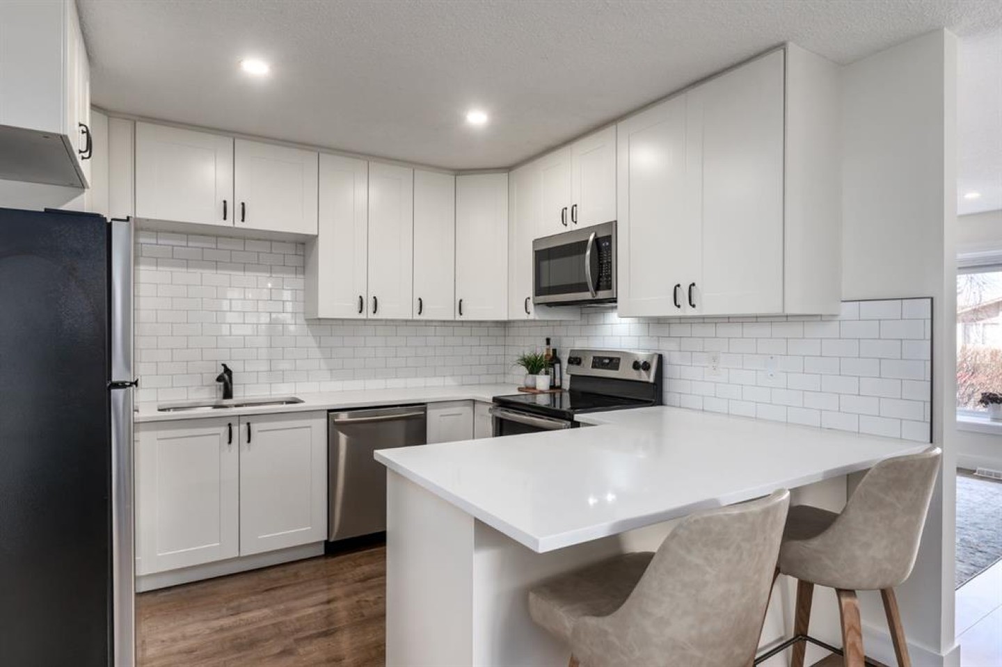 Welcome to this beautifully reimagined 3-bedroom + den, 2-bathroom home, perfectly positioned on one of the most sought-after streets in the community. Ideally located within walking distance to Almadina language Charter School and surrounded by parks and green space, this home offers an exceptional lifestyle for families. Enjoy the convenience of being just a short walk to grocery stores, everyday amenities, and easy access to the future LRT, making commuting effortless. Step inside to a spacious front entry that opens into a warm and inviting main living area, where a charming bay window floods the space with natural light throughout the day. The fully renovated kitchen is both timeless and functional, featuring crisp white cabinetry, quartz countertops with an eating bar, a classic subway tile backsplash, and stainless steel appliances. Durable laminate flooring runs throughout the main level, offering both style and practicality for busy households. Upstairs, the expansive primary retreat comfortably accommodates a king-sized bed and is complemented by an oversized walk-in closet with custom built-ins. A generous second bedroom provides the perfect setup for children or guests. The lower level adds incredible versatility, with a spacious rec room ideal for a media space, home office, or playroom, along with a third bedroom and additional den to suit your evolving needs. Both bathrooms have been beautifully finished with full tile surrounds and striking black fixtures, creating a modern, cohesive design throughout. With thoughtful updates from top to bottom, including a new washer and hot water tank (2024), this home is truly turnkey and ready for its next chapter. Welcome home!
