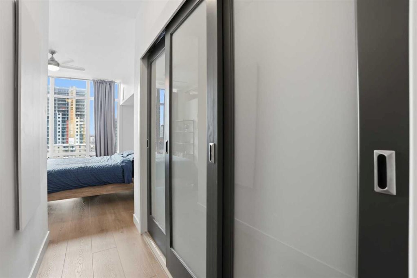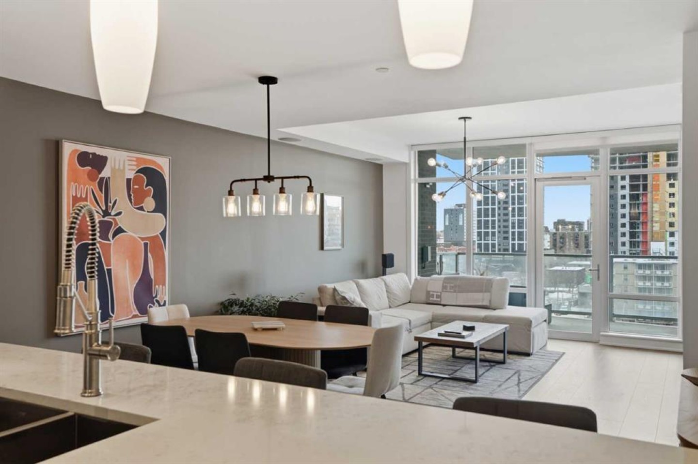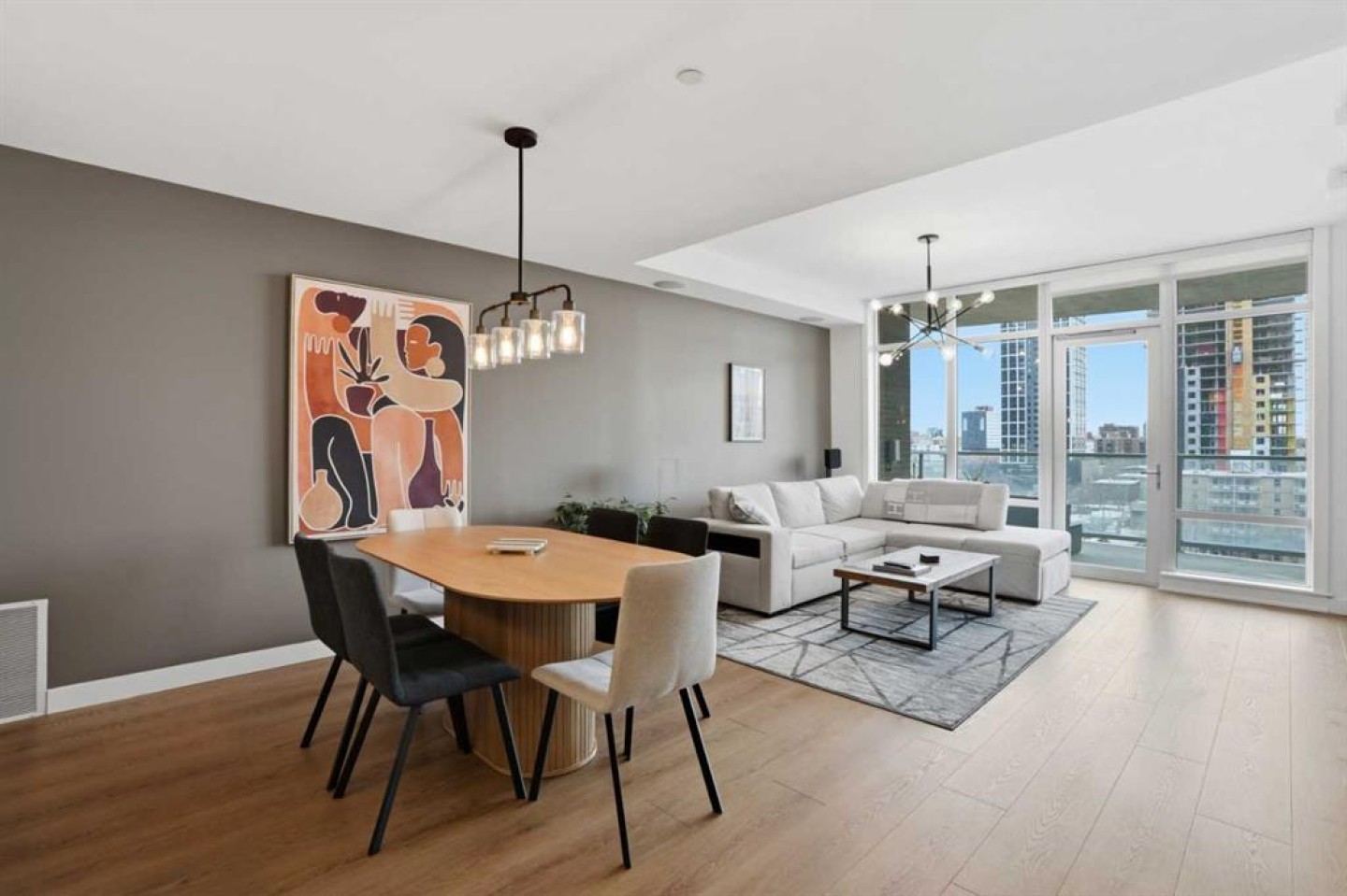 Experience elevated inner city living in The Castello, one of Calgary’s most sought after luxury buildings in the Beltline. This 918 sq ft one bedroom residence has been fully and extensively renovated, creating a truly one of a kind unit that cannot be duplicated anywhere else in the building. Unlike other units in Castello, this home has been completely updated with brand new luxury vinyl plank flooring, entirely new custom kitchen cabinetry, fresh designer paint throughout, and brand new modern contemporary fixtures that transform the space into a sleek and sophisticated urban retreat. The thoughtful renovation elevates both the style and functionality of the home, making it feel brand new and entirely unique compared to other units in the building. The bright open concept layout features 9 foot ceilings and dramatic floor to ceiling windows, allowing natural light to pour into the living space while showcasing unobstructed south facing views. The beautifully updated kitchen is designed for both everyday living and entertaining, offering quartz countertops, stainless steel appliances, full height cabinetry, a wine cooler, garburator, and generous preparation space. The spacious primary bedroom easily accommodates a king sized bed with nightstands and a large television, while the walk through closet leads to an impressive 5 piece spa inspired ensuite. The ensuite is one of the largest in the building and features dual sinks, a deep soaker tub, and a luxurious steam shower, creating a true at home retreat. For added convenience, the front loading washer and dryer are discreetly located within the ensuite. A separate guest bathroom provides additional comfort and privacy for visitors. Additional features include central air conditioning, a built in humidifier, in suite speakers with individual room controls, and a gas BBQ line on the balcony. The unit also includes titled underground secure parking and a titled storage locker. Residents of The Castello enjoy premium amenities including a fully equipped fitness centre, guest suite, car wash, and a social lounge. Perfectly located in the heart of the Beltline, you are steps from Calgary’s best restaurants, cafes, shopping, and downtown amenities. This is a rare opportunity to own a fully renovated, truly one of a kind residence in one of Calgary’s premier condo buildings.