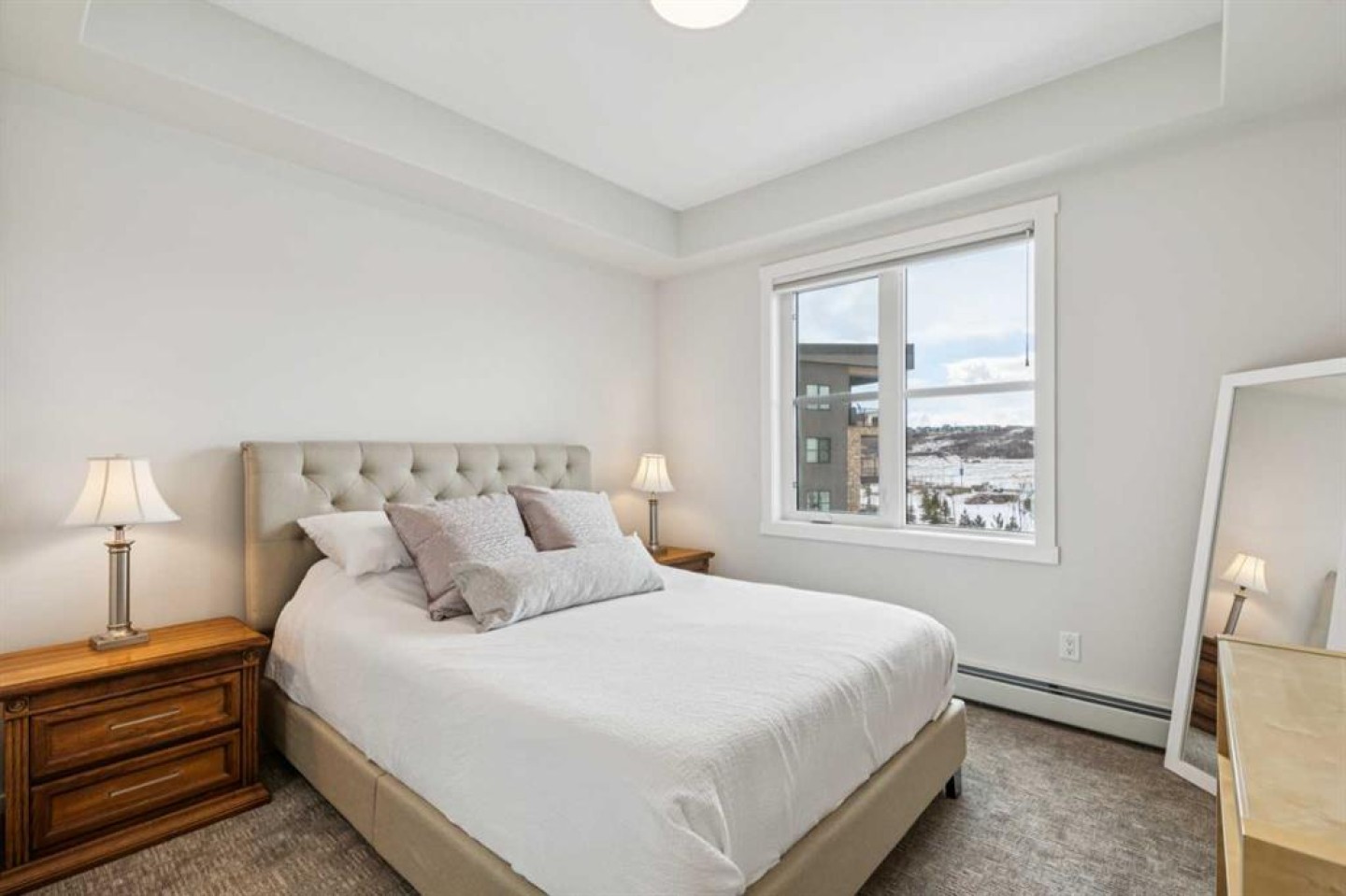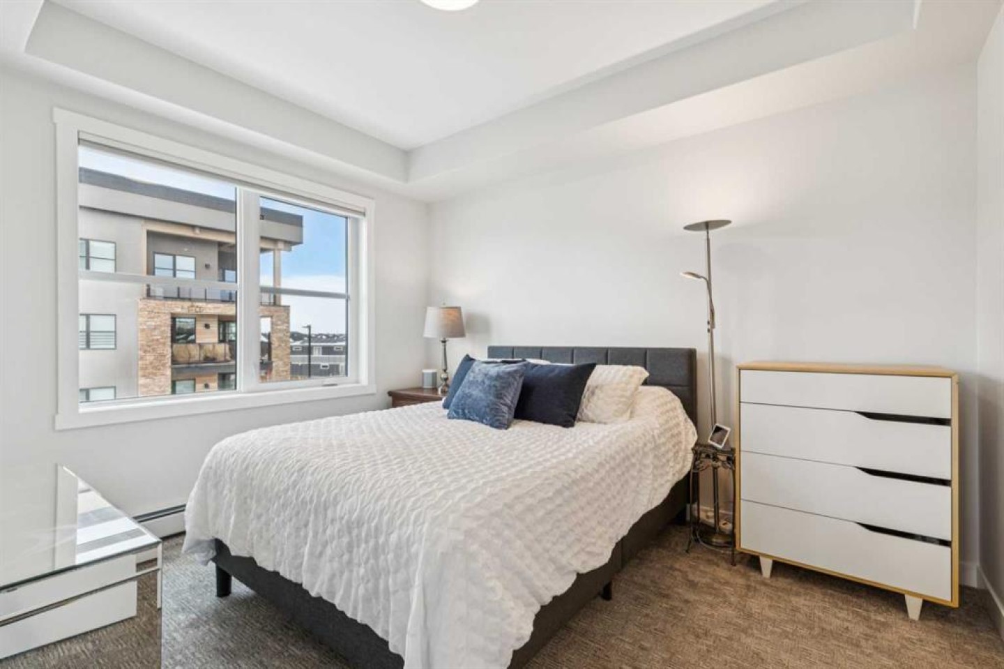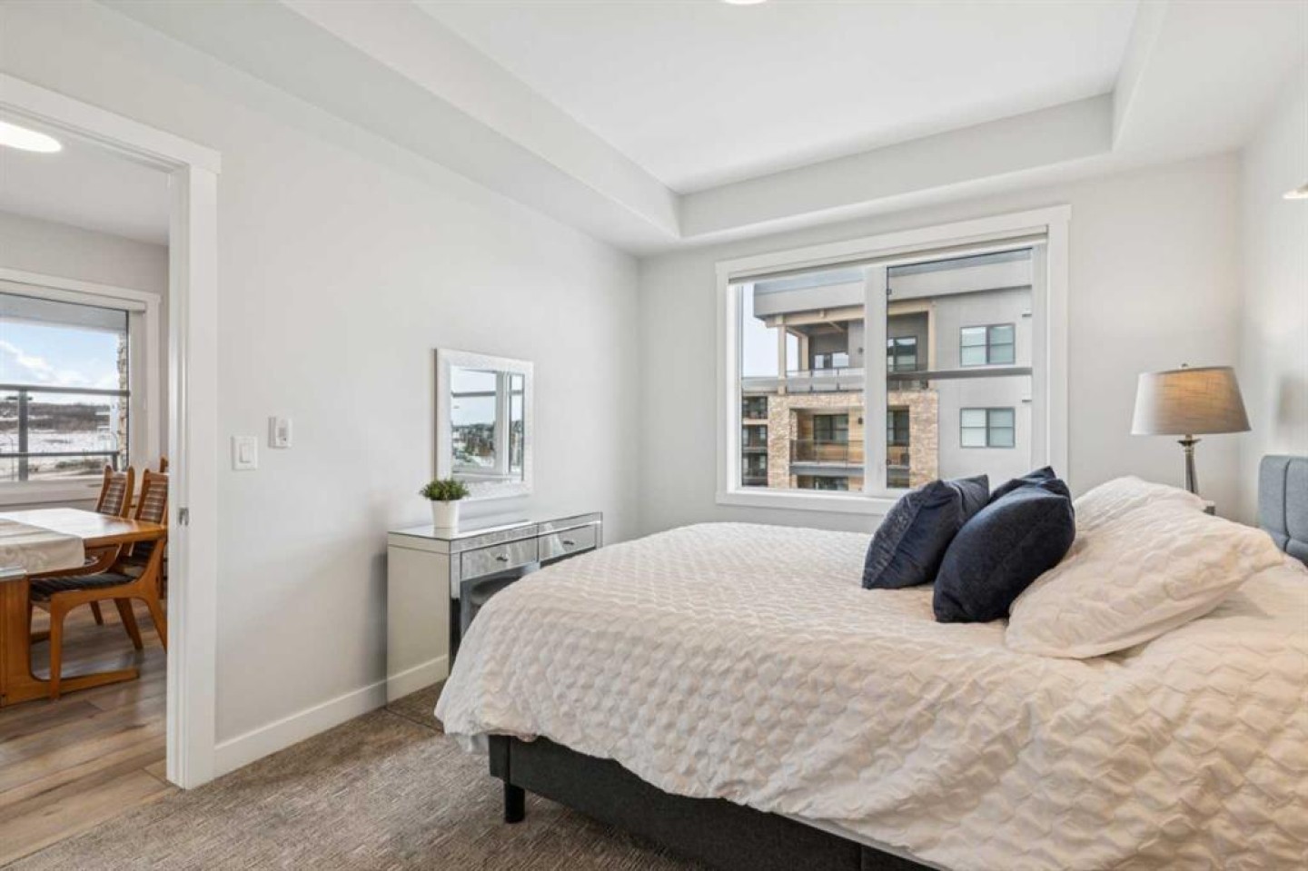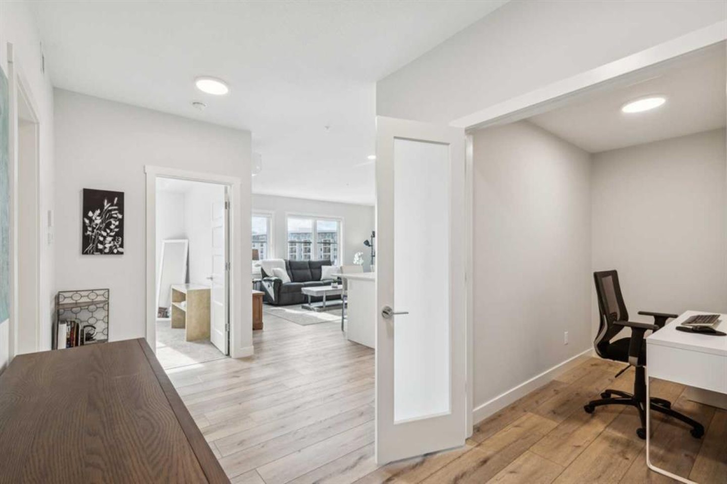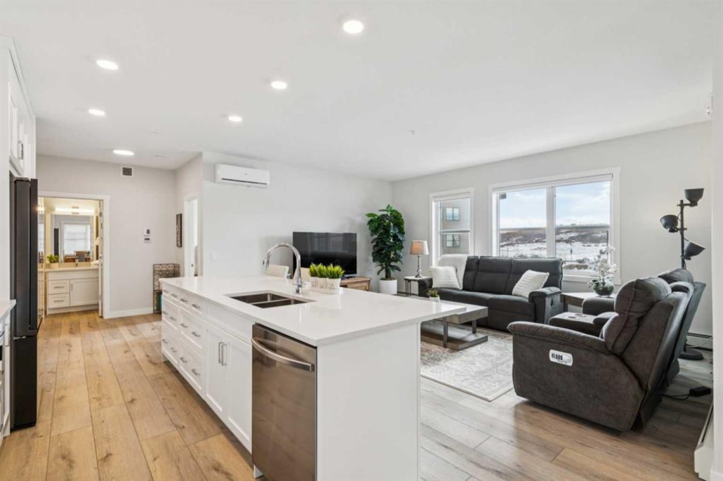 Welcome to Bow 360 in the vibrant and sought-after community of Wolf Willow, where this beautifully appointed, air-conditioned corner-unit condo offers one of the largest and most desirable floorplans in the complex. From the moment you step inside, you’ll appreciate the bright, open-concept design highlighted by expansive windows that flood the home with natural light and showcase lovely views of surrounding parks and green spaces. The elegant kitchen is both stylish and functional, featuring crisp white cabinetry, sleek quartz countertops, durable vinyl plank flooring, and an impressive oversized island with seating—perfect for casual dining, morning coffee, or gathering with friends and family. The kitchen flows seamlessly into the generous living room and a separate dining area spacious enough for a full dining suite, creating an inviting space ideal for both comfortable everyday living and sophisticated entertaining. Just off the dining area, step onto the spacious corner deck—an ideal outdoor retreat with gas bib for BBQing and overlooking the surrounding community green space and parks, including the 'Woof Willow Dog Park'. This thoughtfully designed home offers two spacious bedrooms, including a refined primary suite complete with its own private ensuite bathroom, along with a second full four-piece bathroom that provides comfort and convenience for guests or family. A private den with elegant French doors adds versatility and charm, making it the perfect space for a stylish home office, reading room, or flex area. Completing the package, this exceptional unit includes two titled parking stalls and an additional paid storage unit, providing outstanding convenience and valuable extra space. Located just moments from the Bow River and its extensive network of scenic walking and cycling pathways, residents of Wolf Willow enjoy an incredible balance of urban convenience and access to nature, with beautiful river valley landscapes, parks, and outdoor recreation right outside your door while still being minutes from everyday amenities, shopping, dining, and major commuter routes—making this a rare opportunity to own a spacious, light-filled, and elegantly finished home in one of Calgary’s most exciting riverside communities.