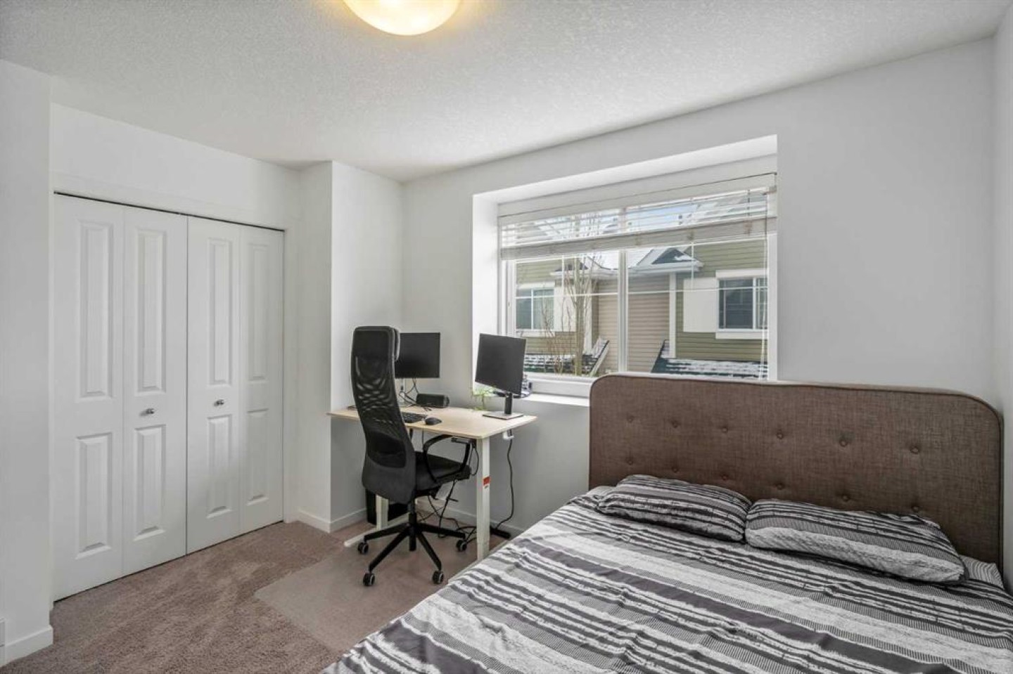 Located in the heart of New Brighton, this well-maintained three-storey townhome offers a functional layout, great natural light, and an unbeatable location close to parks, schools, and everyday amenities. Just steps from playgrounds and the New Brighton Athletic Park, you’ll enjoy easy access to football, soccer, and baseball fields, along with nearby walking paths and green spaces. Shopping and dining are only minutes away at 130th Avenue and High Street in McKenzie Towne. The main living area features tall ceilings, oversized windows, and an open floor plan that connects the kitchen, dining, and living spaces. The kitchen is designed for both style and practicality with stainless steel appliances, modern cabinetry, a tile backsplash, and a large island with breakfast seating. A convenient powder room completes the main level. Upstairs are two spacious primary bedrooms, each with its own private ensuite, along with the added convenience of upper floor laundry. Outside, enjoy a private deck with bamboo privacy screening and a lower patio that opens to a quiet courtyard and tree-lined pathway. Parking is easy with a single attached garage plus a second covered parking pad. Recent updates include a new dishwasher (2024) and new hot water tank. Residents of New Brighton also enjoy access to the New Brighton Club, featuring a splash park, skating rink, tennis courts, and year-round community programming.