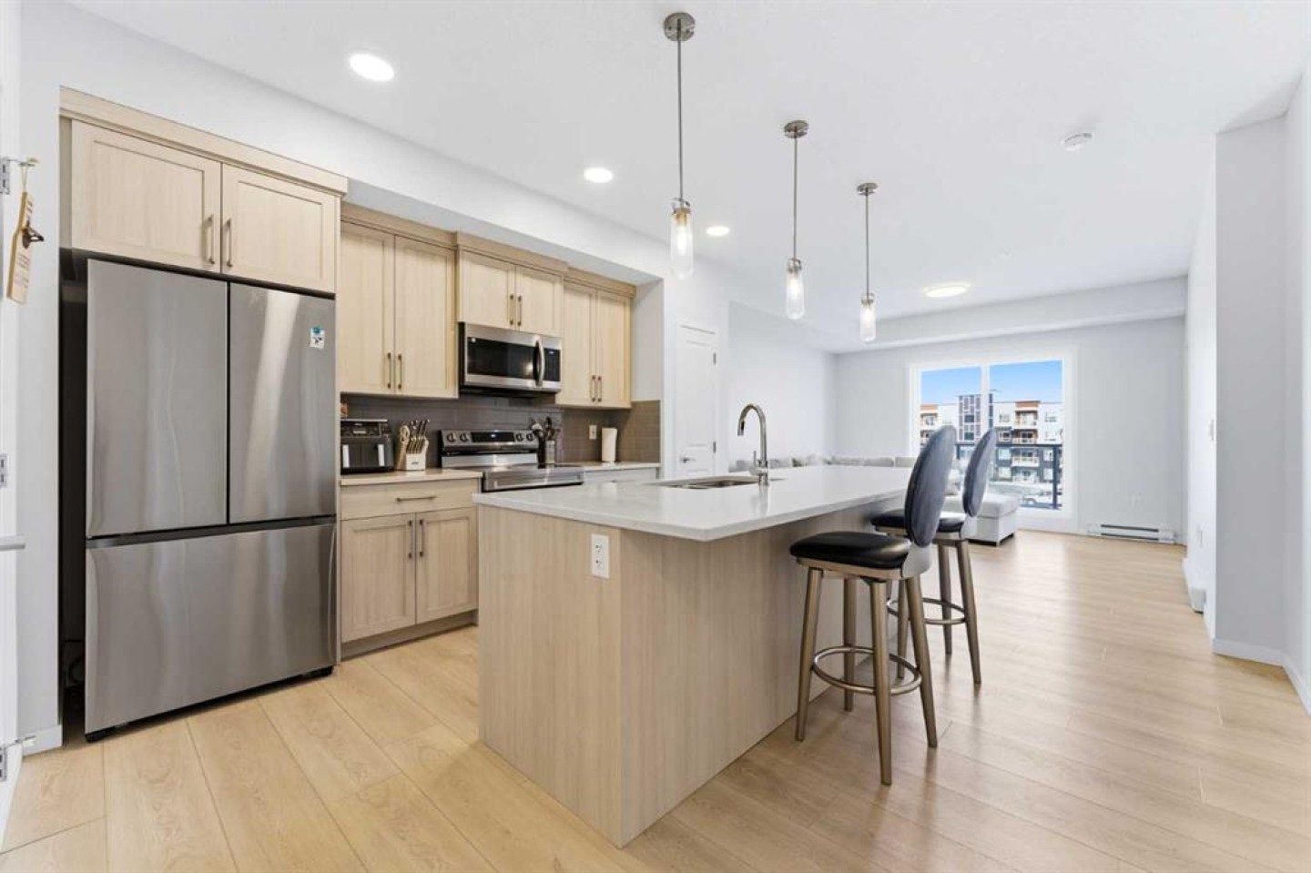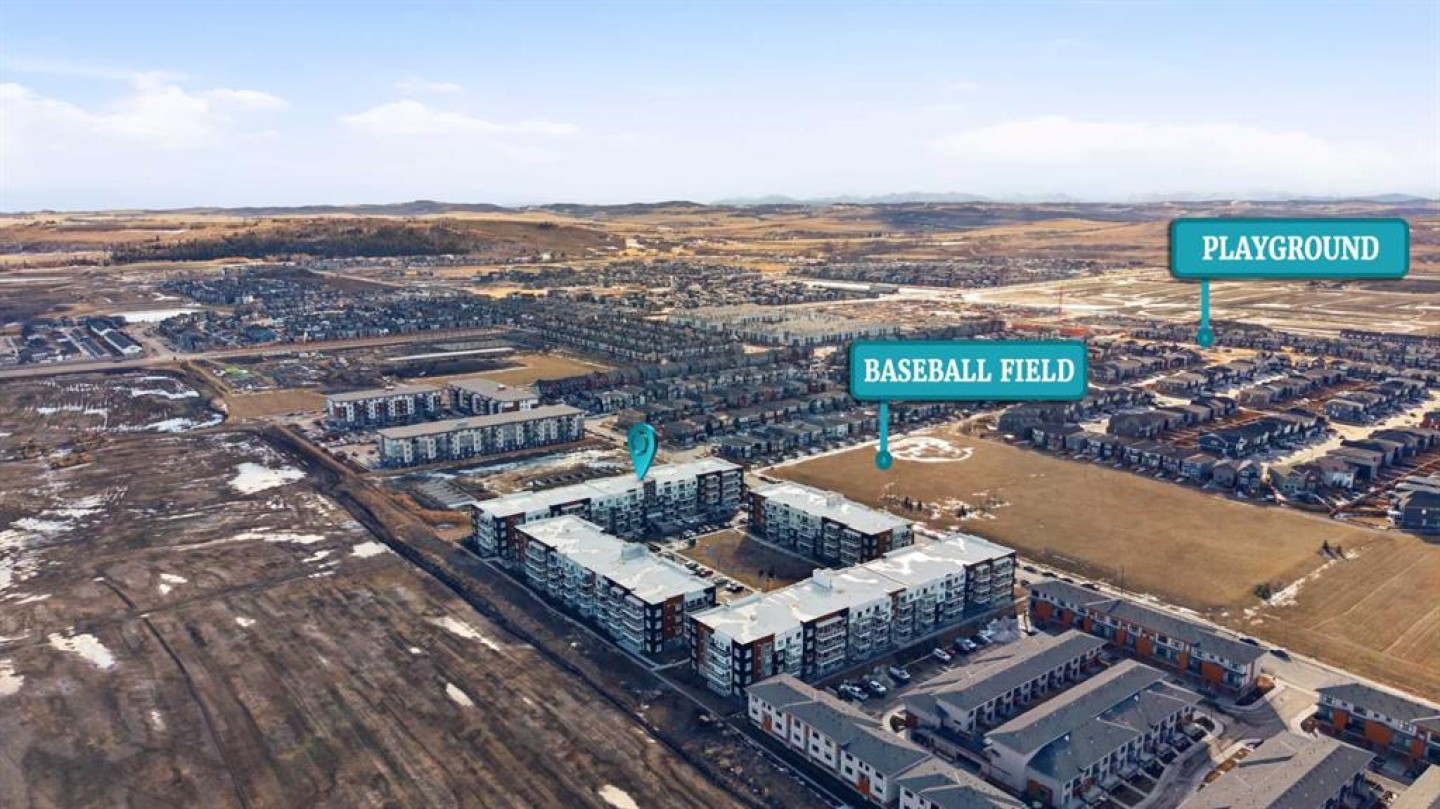 Welcome to modern living in the growing community of Belmont! This beautifully designed 2-bedroom, 2-bathroom condo, Cedarglen built in 2024, offers a bright, functional layout with 9’ ceilings and a clean Scandinavian-inspired palette in a stylish low-rise building. Step inside to discover durable LVP flooring throughout and a thoughtfully designed kitchen featuring quartz countertops, sleek cabinetry, a stainless steel undermount sink with pull-down faucet, stainless steel appliances, and a spacious island with breakfast bar seating that’s perfect for casual dining, meal prep, or entertaining. The kitchen opens to an inviting dining and living area, where large Low-E triple-glazed windows bring in plenty of natural light while enhancing energy efficiency. Sliding doors lead from the living room to your private balcony with clear glass railings, an unrestricted view and a BBQ gas line—an ideal spot to relax and enjoy fresh air year-round. The well-planned layout offers two spacious bedrooms and two full bathrooms. The primary bedroom features its own 4-piece ensuite, while the second bedroom sits conveniently next to another 4-piece bathroom complete with a soaker bathtub. An in-suite laundry room adds everyday convenience. Additional highlights include titled underground parking, assigned storage, sound-reducing membrane beneath LVP and LVT surfaces, a fresh air system for enhanced comfort, and elevator access. This pet-friendly and rental-friendly building offers flexibility for homeowners and investors alike. Located in the vibrant and rapidly developing Belmont community, this home is close to parks, amenities, and everyday conveniences, with exciting upcoming developments including a public library, YMCA, shopping plaza, and the proposed 210 Avenue SW LRT station on the Red Line—approximately a 5-minute drive away (buyer to verify all future development plans). These planned amenities are expected to further enhance the long-term property value and help build equity. Whether you're a first-time buyer, downsizer, or investor, this move-in ready condo is a fantastic opportunity in a growing area. Book your private showing today and experience everything Belmont living has to offer!