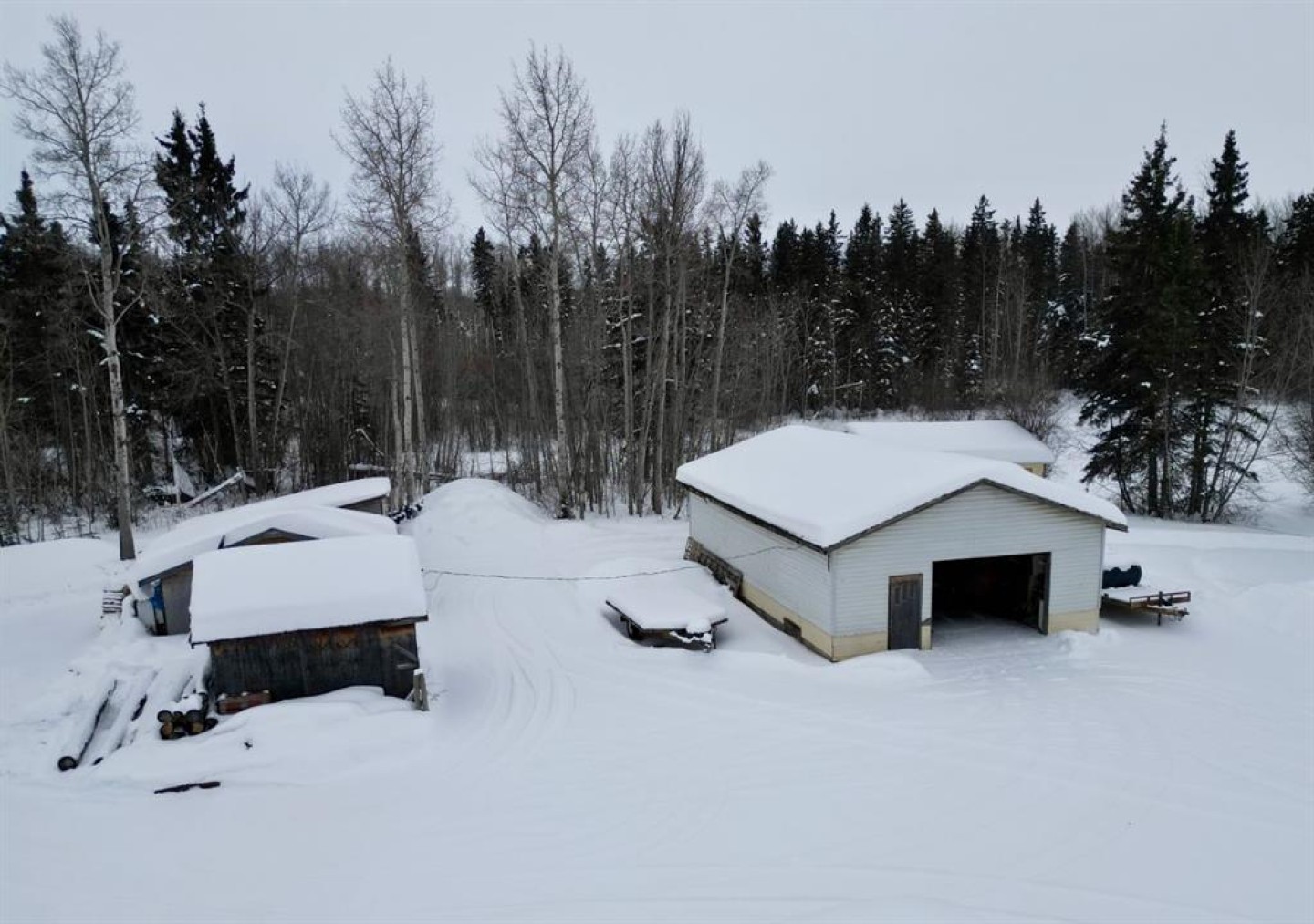 24 by 32 detached garage built in 2013, 26 by 40 older garage with wood floor, multiple storage sheds, and open front shelters