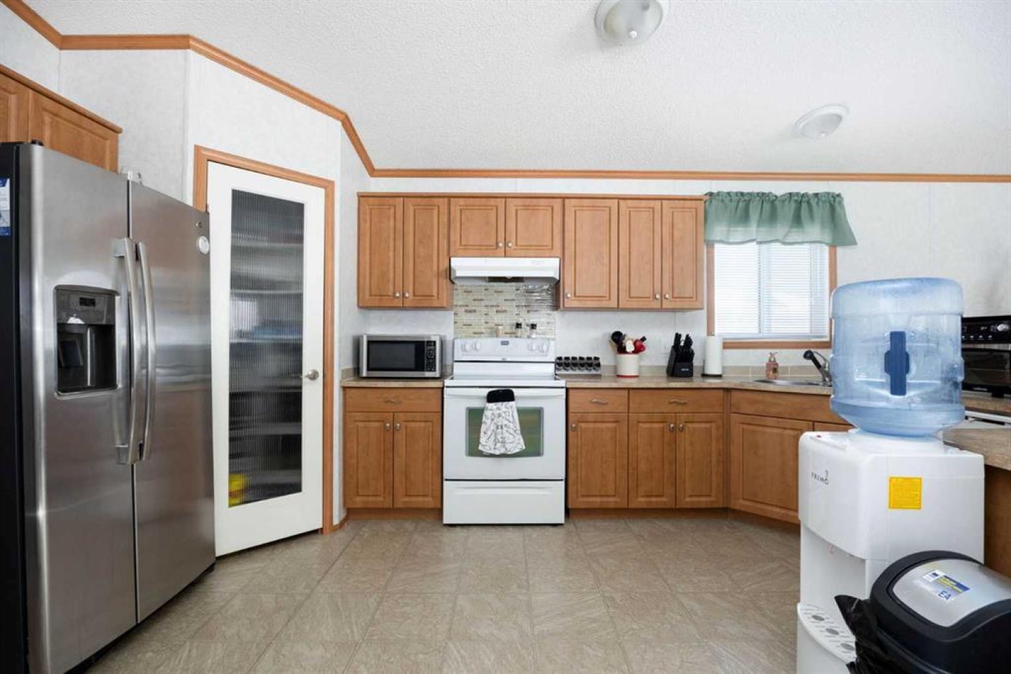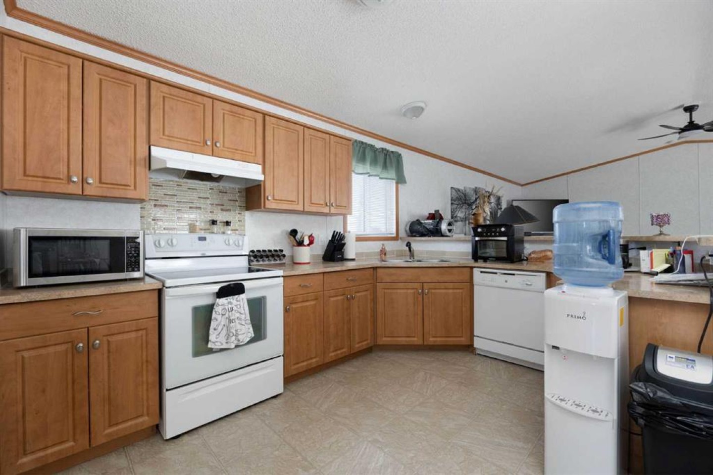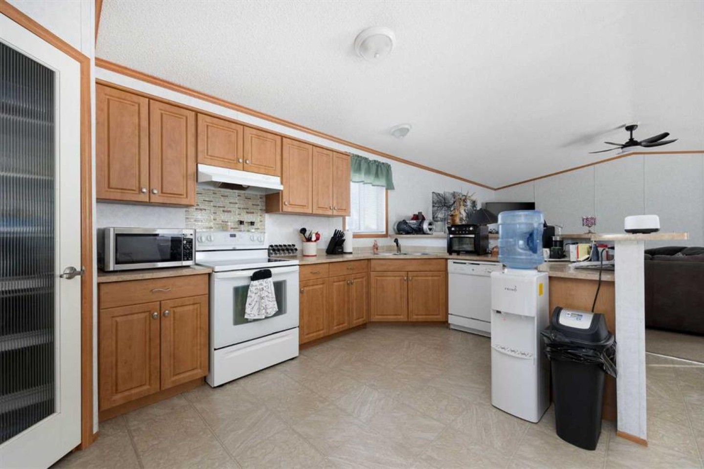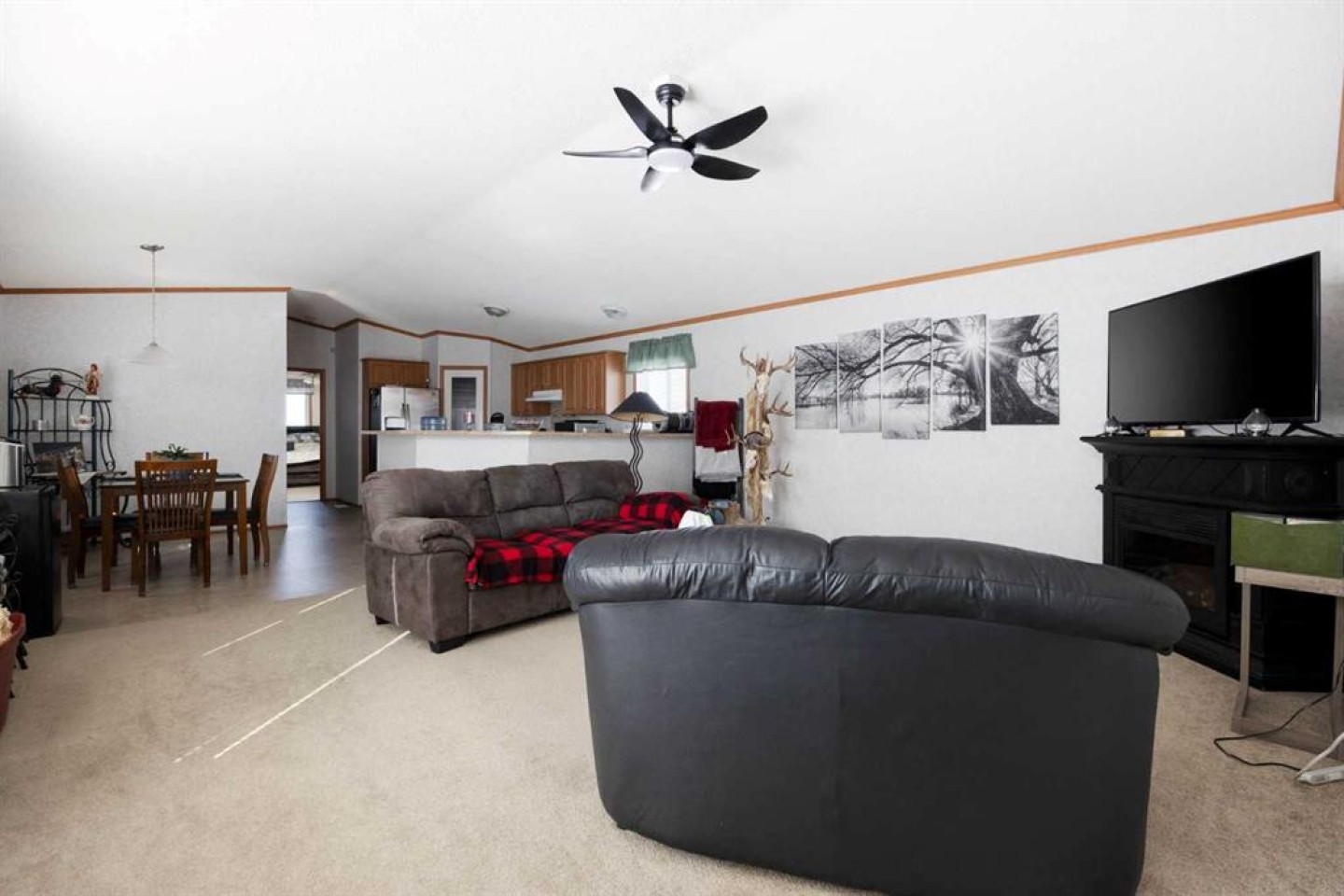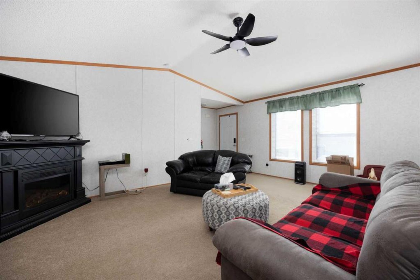 Electric fireplace in living room, Fridge, Stove, Dishwasher, Washer, Dryer, Microwave and windows covering