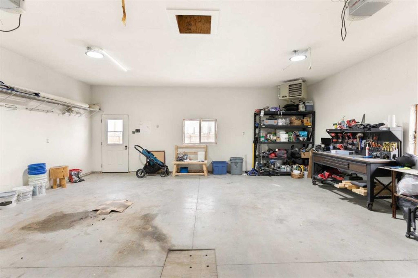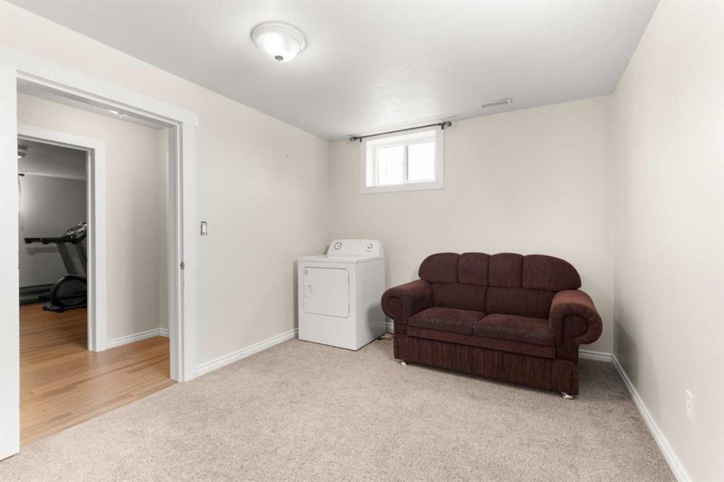 workbench in garage, basement couch and chair, treadmill
