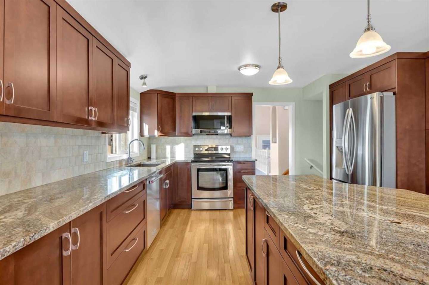 *** OPEN HOUSE THIS SAT, MARCH 14TH, 12-3PM*** Welcome to this spacious 4-level split home in the desirable community of Cedabrae, offering just about 1,000 sq ft on the main floor and a functional layout perfect for families. The beautifully renovated kitchen (2021) features quartz countertops, a large island with breakfast bar, and new stainless steel appliances, creating a bright and modern space for cooking and entertaining. New double doors open to the east-facing balcony, bringing in plenty of natural light. The massive primary bedroom includes a huge closet, while the second bedroom features a built-in computer desk, ideal for working or studying from home. The upper level also offers a newly renovated 3-piece bathroom. The lower level includes a cozy wood-burning fireplace with gas lighter, a wet bar, and large basement bedrooms, providing great additional living space. The laundry room is equipped with a convenient laundry sink, and the furnace room includes a huge crawl space for extra storage and a water softener. Major updates include a high-efficiency furnace (2021) and hot water tank installed in September 2024. Step outside to a private backyard with mature aspens, fruit trees, and a storage shed, creating a peaceful outdoor retreat. Located in the well-established Cedabrae community, close to parks, schools, and amenities, this home offers comfort, space, and excellent value.
