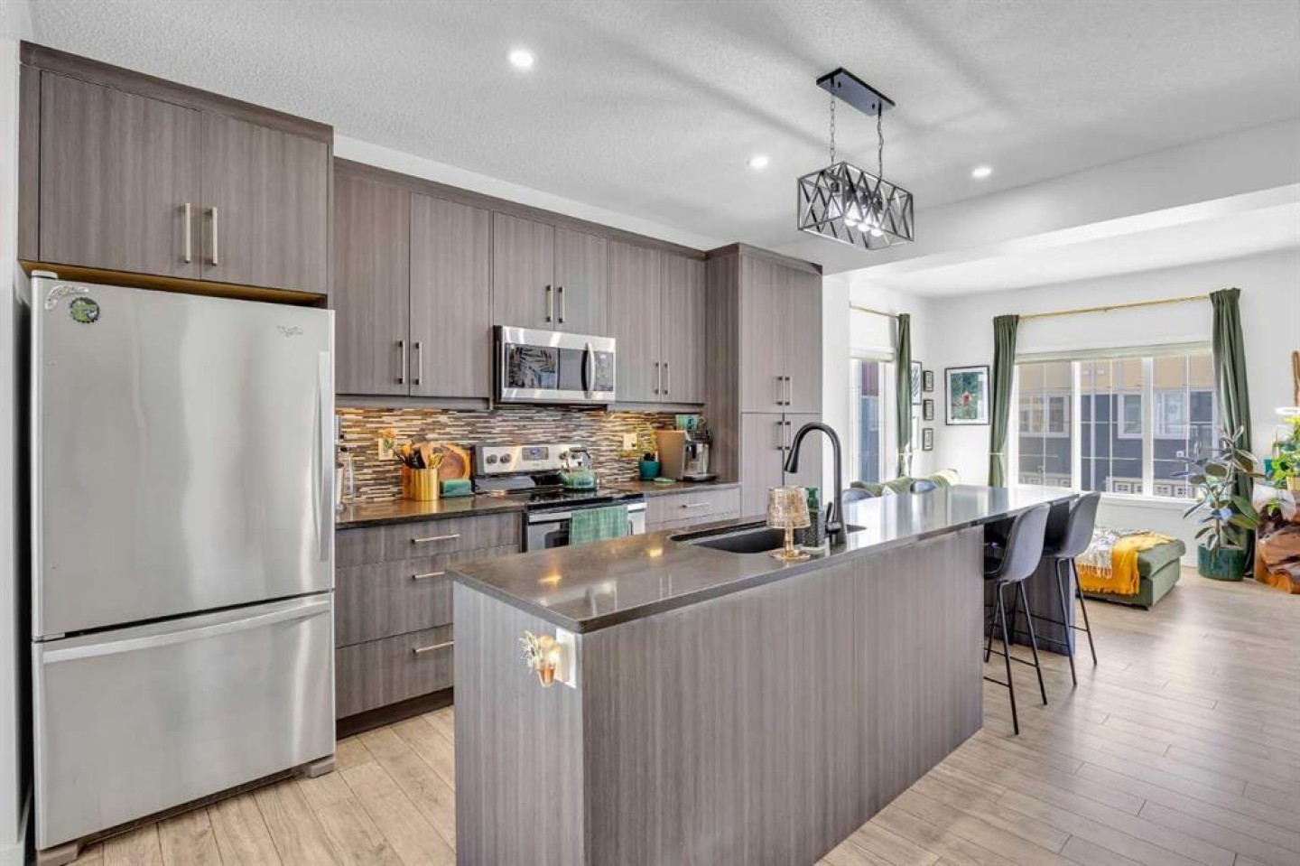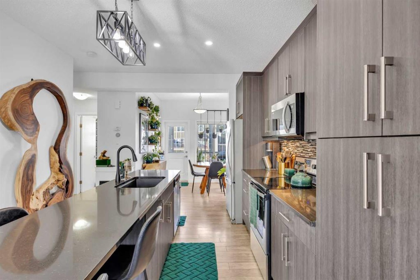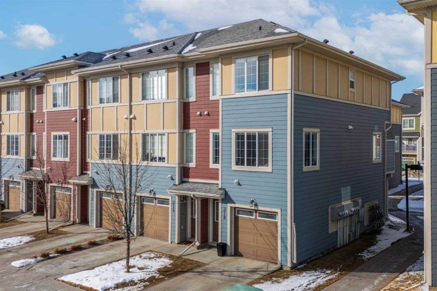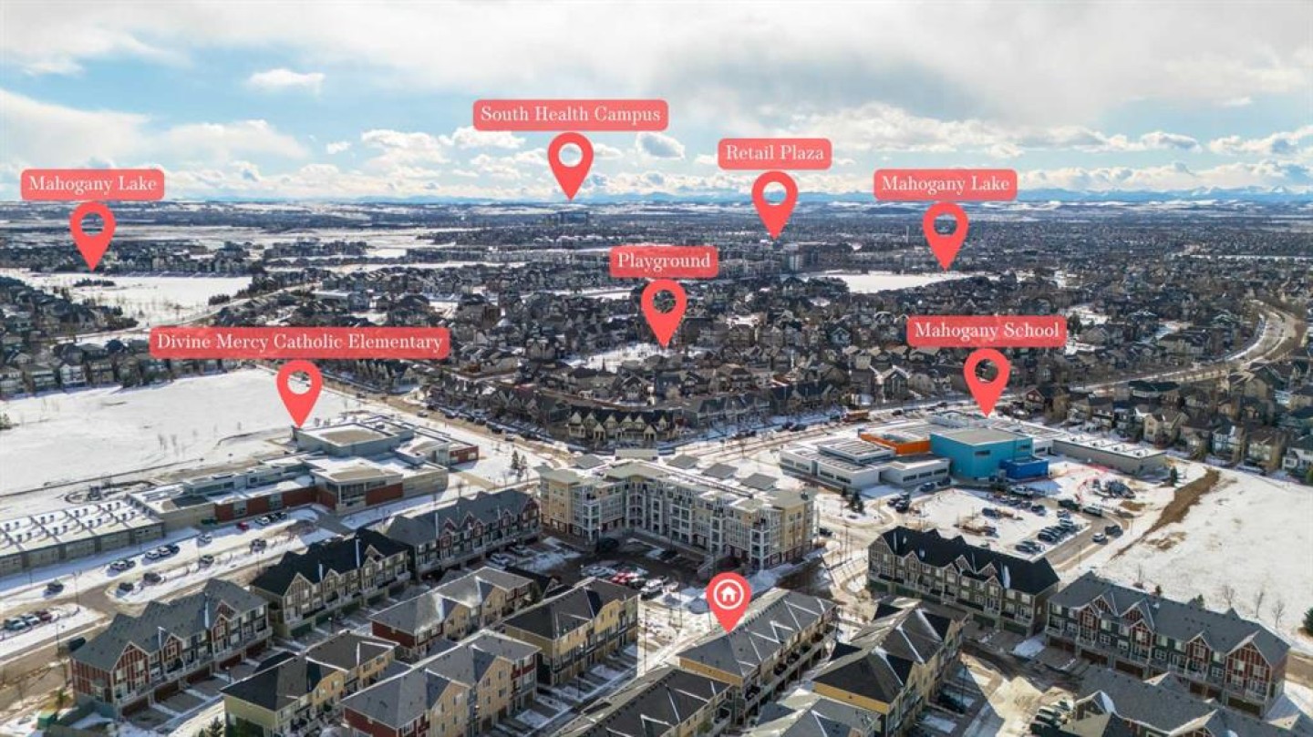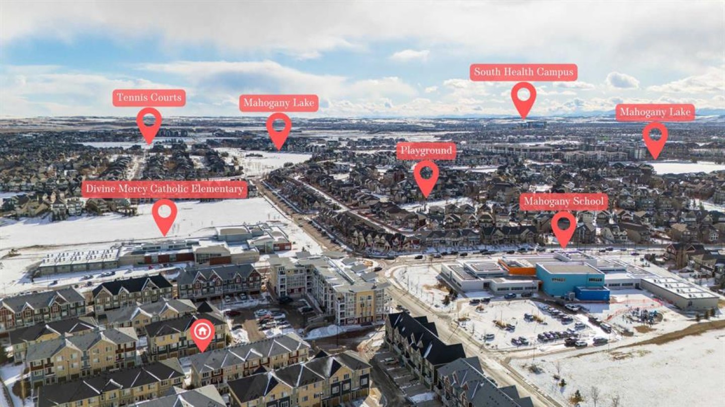 Welcome to this bright and well maintained corner unit townhouse located in the sought after lake community of Mahogany. Offering 3 bedrooms, 2.5 bathrooms, central air conditioning, and over 1,200 sq ft of living space, this home combines a functional layout with excellent natural light thanks to its end unit location. The main floor features an open concept design with a spacious living room, dedicated dining area, and a modern kitchen complete with quartz countertops, stainless steel appliances, mosaic tile backsplash, and a large island with seating. The dining area provides direct access to the balcony, making it easy to enjoy summer BBQs or relax outdoors. A convenient 2 piece bathroom is also located on this level. Upstairs you will find three bedrooms including the primary bedroom with a walk in closet and private 4 piece ensuite. Two additional bedrooms, another full bathroom, and upper level laundry add to the practical layout of the home. Parking is a standout feature with a double tandem attached heated garage plus driveway parking, providing space for multiple vehicles along with extra storage. The home also includes central air conditioning for added comfort during Calgary’s warmer months. Located in Ebony Townhomes, the complex offers visitor parking, landscaped green spaces, and courtyards. Residents also enjoy access to Mahogany’s private lake, along with nearby parks, pathways, schools, shopping, and restaurants. A great opportunity to own a corner unit townhouse in one of Calgary’s most desirable lake communities.