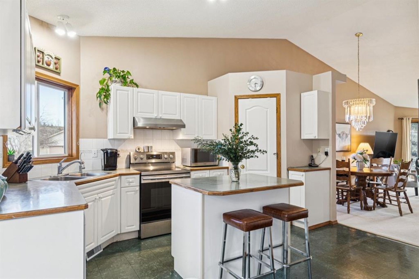 Chandelier, Closet Organizers, High Ceilings, Kitchen Island, Open Floorplan, Soaking Tub, Vaulted Ceiling(s), Walk-In Closet(s)