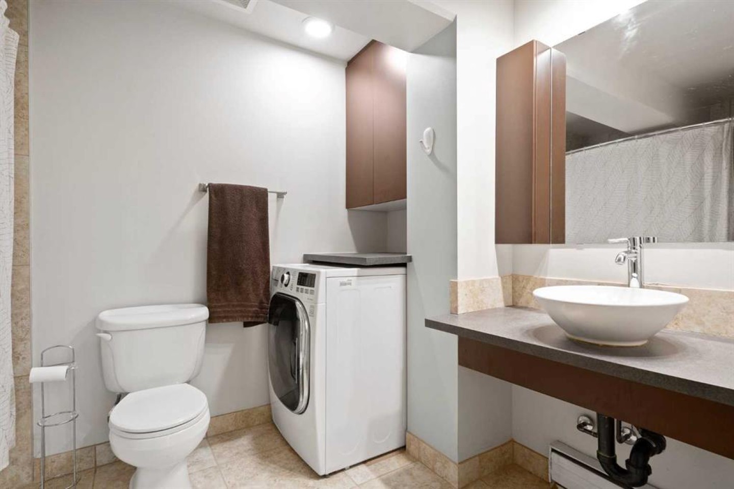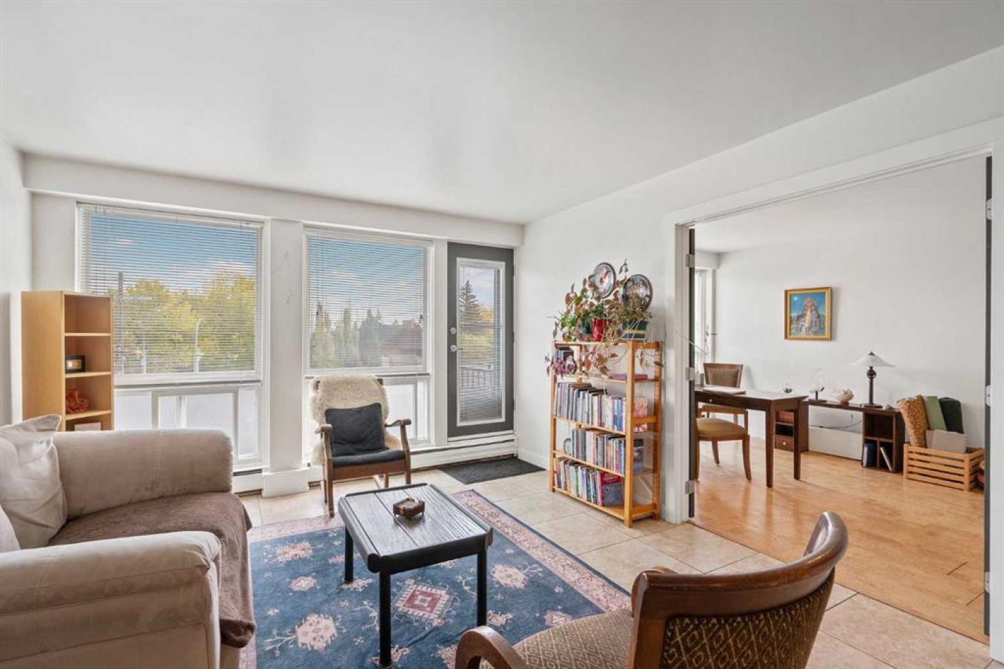 Welcome to this spacious 2-bedroom, 1-bath unit that offers over 860 sq. ft. of thoughtfully designed living space in one of Calgary’s most vibrant inner-city communities. Located on the top floor of a solid concrete building, this corner unit is filled with natural light from multiple exposures and enjoys downtown views from its northeast-facing balcony. Inside, the open-concept kitchen is both stylish and functional, featuring stainless steel appliances including a new Miele dishwasher, espresso cabinetry, modern hardware, soft-close drawers, a breakfast bar, and plenty of cabinet and counter space. The kitchen flows seamlessly into the dining area and living room, where large windows brighten the space. Tile flooring flows throughout for easy upkeep, and the bedrooms are lined with warm cork. From the living room, French doors open to the second bedroom that can be used as a home office, complete with cork flooring and a closet. The spacious primary bedroom offers a large closet and sits next to 4-piece bathroom with soaker tub and a full-size LG washer/dryer combo, adding everyday convenience. There’s also a deep in-unit storage closet, perfect for keeping your belongings organized. Additional shared storage is available in the building. This pet-friendly condo welcomes your furry friends (no size restrictions, board approval required), and nearby off-leash dog parks make it easy to get outside and explore. Covered parking is included, with the option for additional permit parking out front. Located in Bankview, a hidden gem just minutes from downtown, this home is surrounded by unique streets and plenty of parks. Local cafés, restaurants, and shops are all within walking distance—plus a Starbucks just steps from your door. You’re also conveniently close to both 17th Ave SW and Marda Loop, giving you easy access to everything the city has to offer. This condo combines thoughtful design, modern updates, offering a comfortable and vibrant space to call home in the heart of Calgary. Book your showing today.