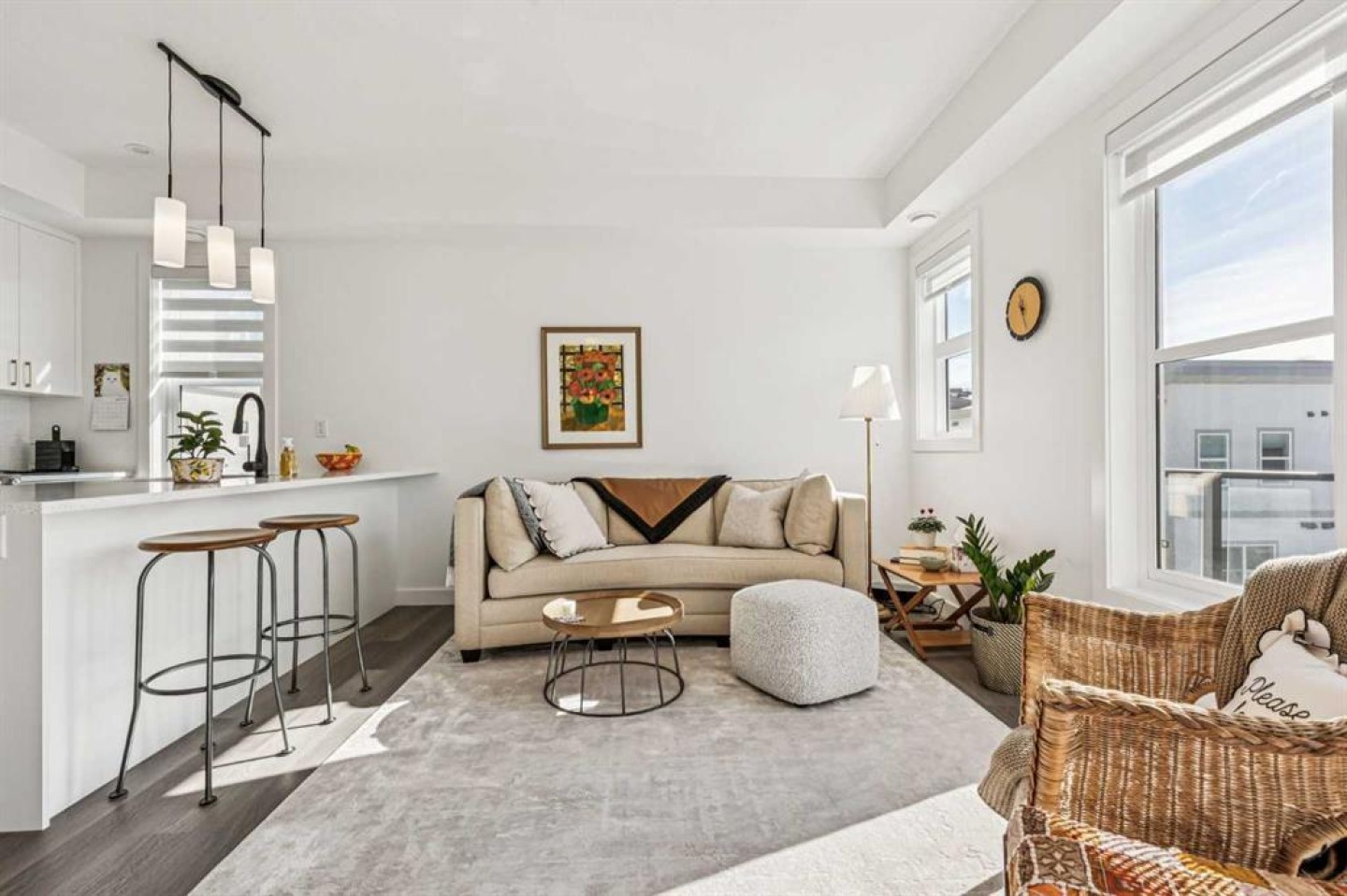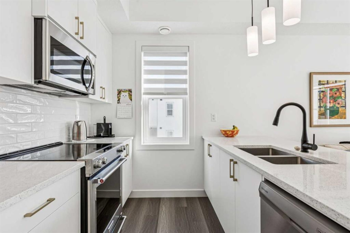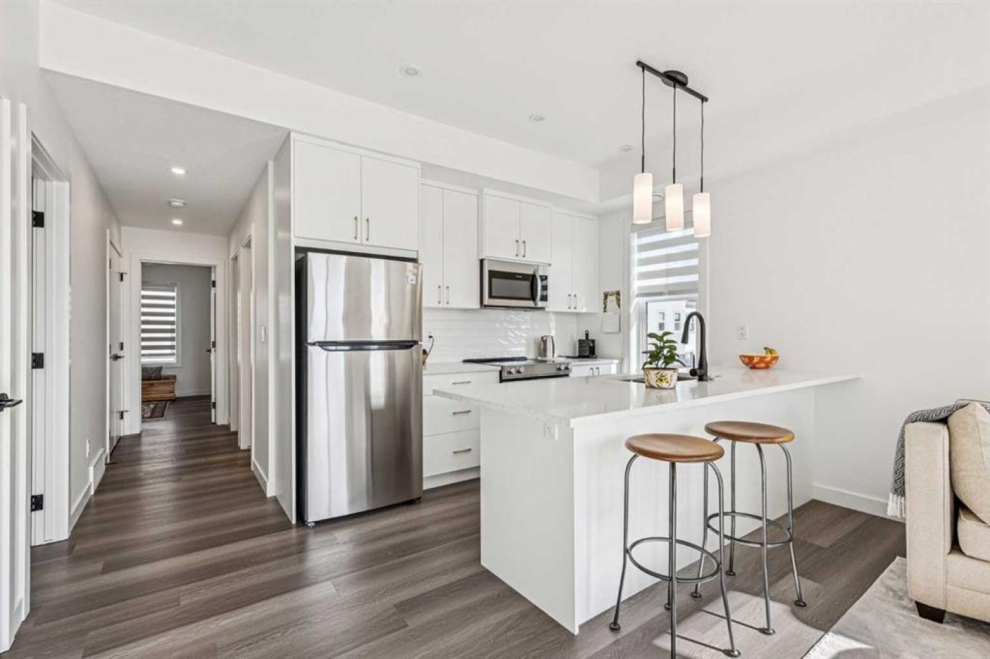 Discover Elkwood in Aspen Springs, located in one of Calgary’s most desirable southwest communities. Positioned at the end of a quiet street, this new stacked townhome enjoys some of the most open sightlines in the complex along with a sunny south-facing exposure, allowing natural light to pour in throughout the day. Thoughtful upgrades include central air conditioning and window coverings, making this home truly move-in ready. The home is also conveniently located close to guest parking, making it easy for visitors. Situated on the top floor, this modern home features 2 spacious bedrooms and 2 full bathrooms within a well-designed open-concept layout. 9-foot ceilings, expansive windows, and wide-plank luxury vinyl flooring create a bright and inviting atmosphere throughout the main living areas. The designer kitchen is both stylish and functional, featuring quartz countertops, soft-close cabinetry, a tiled backsplash, stainless steel appliances, a built-in microwave hood fan, and an upgraded convection oven. An east-facing kitchen window welcomes the morning sun, adding even more natural light to the space. The thoughtful layout offers both bar seating at the kitchen island and a dedicated dining area, making it ideal for everyday living and effortless entertaining. Convenience continues with a main floor laundry room featuring a front-load washer and dryer along with generous storage space. The lower level provides additional storage and a versatile flex room, perfect for a home office, workout space, or hobby area, plus private direct access to your attached garage—large enough to accommodate a Ford F-150 truck, a rare and valuable feature for townhome living. Ideally located just minutes from the shops and restaurants of Aspen Landing Shopping Centre, and easy C-Train access, along with nearby walking paths, schools, and beautiful green spaces, this home offers the perfect balance of style, comfort, and convenience. Whether you’re a first-time buyer, investor, or seeking a low-maintenance lifestyle, this exceptional home truly checks all the boxes.