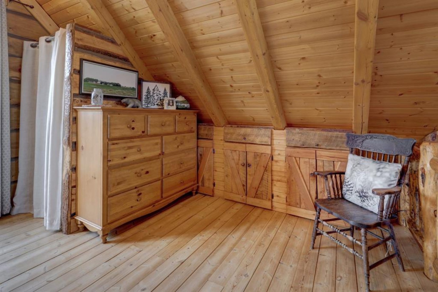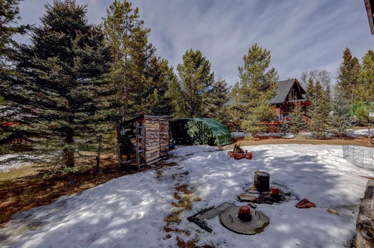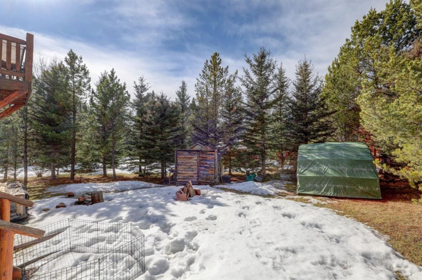 Nestled in the woods SE of Sundre (107 km from the Calgary Airport) find your new full time residence or rec property. Walk up the south steps noting gorgeous woodwork surrounding you & all of the space you will have on the 220 sq ft covered deck (& an even more private deck on the north side). Enter through the French doors to find a stunningly beautiful character home - every log in this home was hand chosen by a master craftsman. There was only one built like this! The main floor is OPEN CONCEPT & every door, railing, antler & pine floor board were chosen w/care & vision. The living space is adorned w/vaulted 2 storey ceilings & windows, allowing you to take in the view of the woods from every angle. Home is heated by a NATURAL GAS free standing FIREPLACE - highlighted w/RIVER ROCK & hand chosen log mantle/pillars & has plenty of room for a big screen TV (inc). Lots of room for seating 8 people or more - the large comfy couch facing the fireplace is also inc. Look up to see your BRAND NEW HUNTER FAN. The kitchen is fully functional inc/lg corner pantry, upgraded flat top GE SS stove, full size fridge & plenty of drawers/cabinets. The lighting has been upgraded from the original & follows the flow of the home. In your large dining space admire your vintage wood table, 4 wood chairs & extra leaves (space to seat 10 people easily). The 3 pc bath has NEW TAPS/FAUCET, newer toilet, glass door shower & full size UPGRADED ELECTROLUX WASHER/DRYER (inc). As you walk up the conversation piece staircase note how every railing & tread has been chosen for its look/functionality. The open style loft is home to 2 bedroom areas (one large enough for a California king bed) & a double bed overlooking the living space below & the views from the 2 storey east windows. There are also 2 large closets, a bank of cupboards & 3 very cool flip up drawer spaces. Your second set of FRENCH DOORS leads to your west balcony - perfect for those evening drinks & conversations. Outside you have over 6000 sq ft on your lot w/loads of flower beds, trees, shrubs & grass. There is also a firepit, clam shell tent, wood shed & storage shed (all included & compliant on the real property report). This is one of the more private back yards in Bergen Springs & also boasts so much yard on the south side w/all of the perennials have been planted already. The driveway is approximately 23 ft wide - parking for 4 or more vehicles plus room for your RV to store or use for guests to sleep. Under the cabin is a HEATED CRAWL SPACE housing 2 cistern tanks (approx 300 gallons each) to fill & use in the winter months. The ELECTRIC HOT WATER TANK is newer & there is a unit heater on a thermostat. The $610 YEARLY CONDO FEE inc garbage bins, snow removal on shared roads, shared well water from May to Oct & reserve fund contributions. Enjoy use of the community pond in summer, skating in winter & fires in either the pond gazebo or at the community hall.