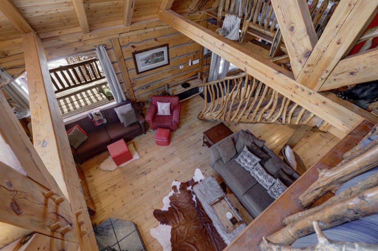 Table & wood chairs (2 green chairs excluded), double bed in loft, key shelf at south door, boot shelves at south door, mallard duck numbered print on main floor south wall, all antler coat hooks, all attached shelving, portable kitchen island, small night stands next to main bed, beige couch facing fireplace, dining table & 4 chairs on south deck, TV on mantle
