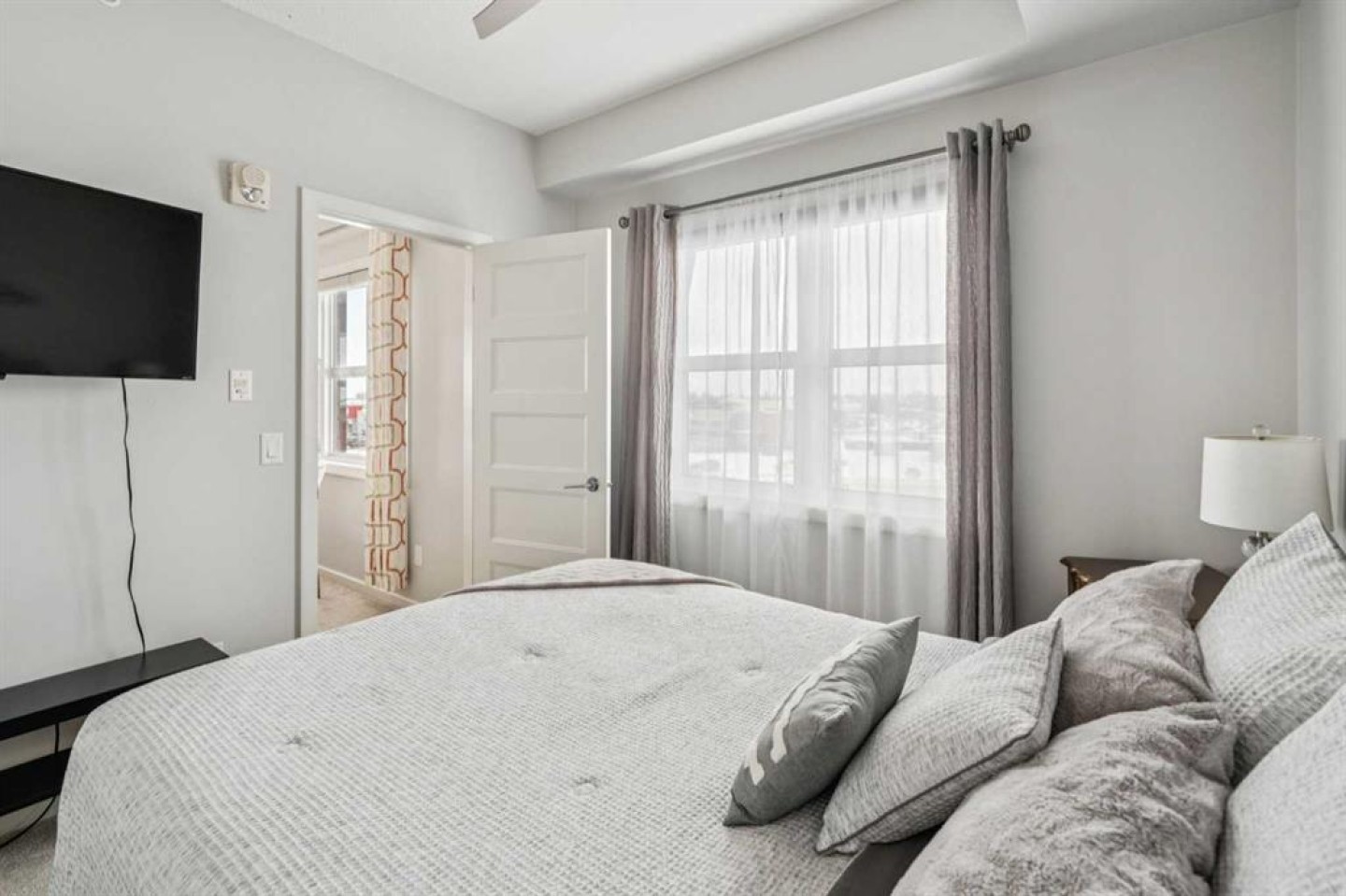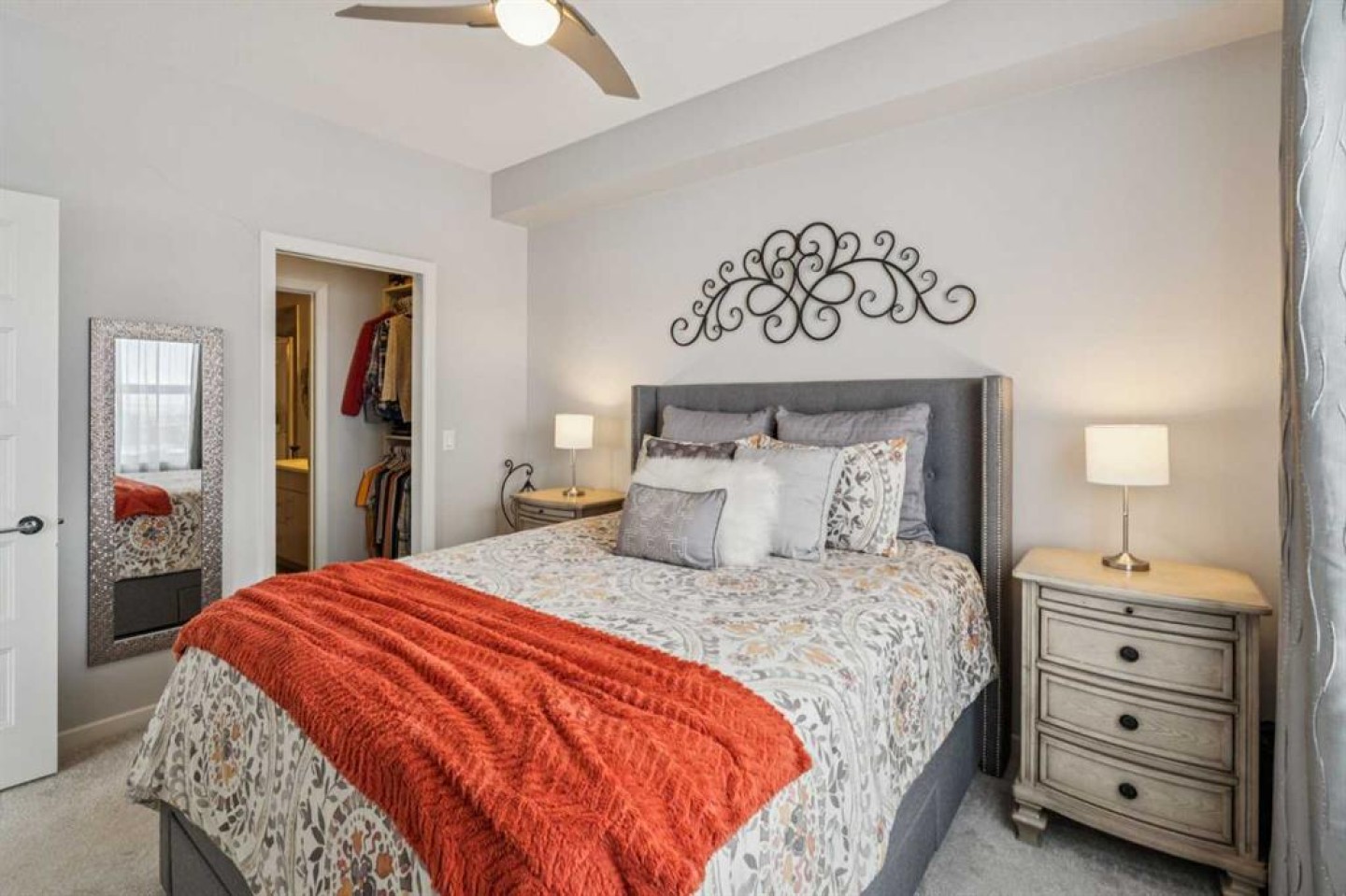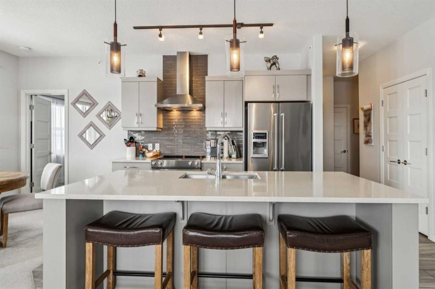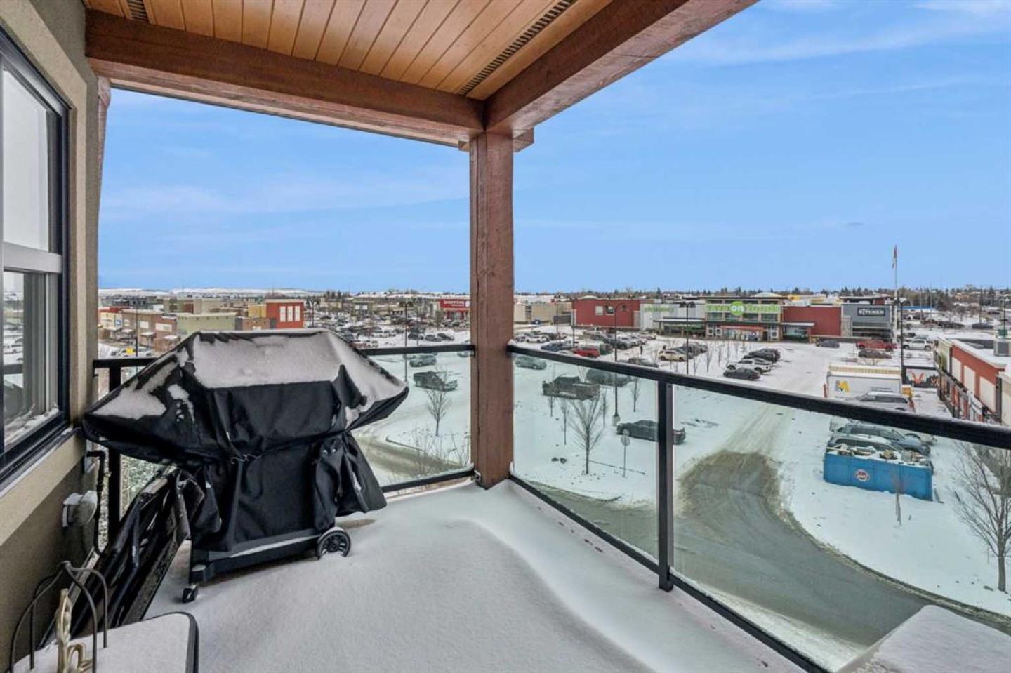 CHECK OUT OUR 24/7 VIRTUAL OPEN HOUSE. Welcome to The Chateaux, Airdrie’s premier 55+ complex, thoughtfully designed for comfortable, low-maintenance living in a vibrant community setting. This top-floor corner unit offers over 900 sq. ft. of bright, open living space with 2 bedrooms and 2 bathrooms, including a primary suite with private ensuite. The open-concept floorplan is perfect for everyday living and entertaining, featuring quartz countertops and over $50,000 in upgrades. The kitchen is a standout with a premium stainless steel appliance package, custom hood fan, and a microwave built seamlessly into the island. Additional upgrades include a stylish fireplace, air conditioning, high-quality blinds, upgraded light fixtures, and a convenient screen door for added comfort. Step outside to your covered private deck with gas BBQ hookup, the perfect spot for morning coffee or evening relaxation. This home also includes a titled underground parking stall with a storage cage above, providing both convenience and security. Residents of The Chateaux enjoy exceptional amenities, including a beautifully landscaped courtyard, a welcoming amenity/social room available for private bookings, and a secure underground workshop for woodworking enthusiasts. The building also features secure underground access, elevator service, bike storage, and a welcoming lobby, all within a well-maintained complex with in-floor heating for year-round efficiency and comfort. Ideally located within walking distance to groceries, shopping, restaurants, medical services, and banking, this home also offers easy access to Deerfoot Trail, especially with the convenient new 40th Ave exit. Enjoy nearby access to the Genesis Place recreation complex, East Lake walking/biking paths, and a dog park nearby in Kings Heights too. This pet-friendly community (two pets permitted, with size restrictions) offers the perfect balance of comfort, convenience, and community for those looking to enjoy an active, maintenance-free lifestyle. Book your viewing today!