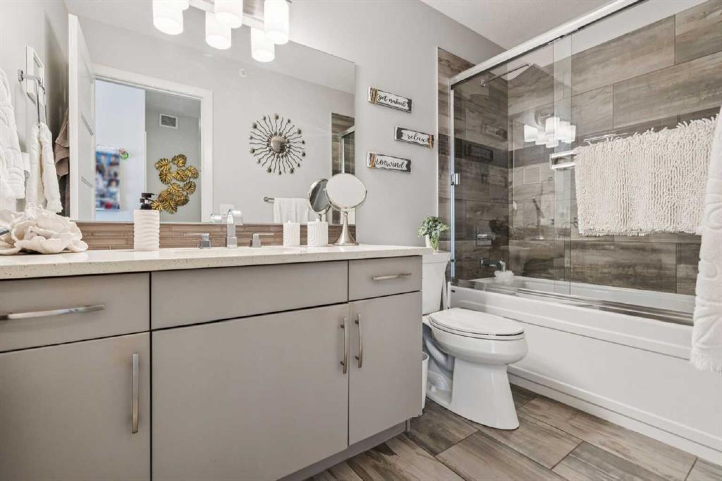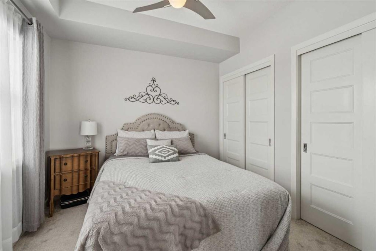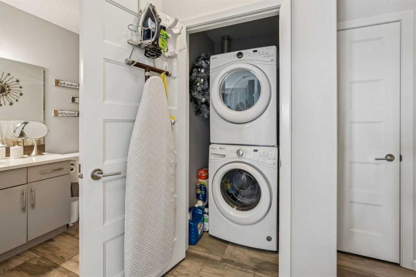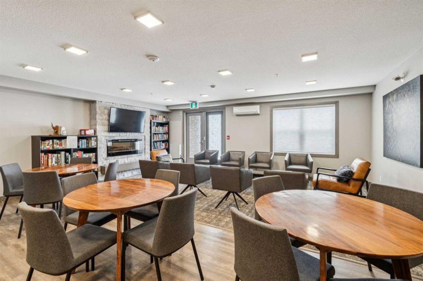 CHECK OUT OUR 24/7 VIRTUAL OPEN HOUSE. Welcome to The Chateaux, Airdrie’s premier 55+ complex, thoughtfully designed for comfortable, low-maintenance living in a vibrant community setting. This top-floor corner unit offers over 900 sq. ft. of bright, open living space with 2 bedrooms and 2 bathrooms, including a primary suite with private ensuite. The open-concept floorplan is perfect for everyday living and entertaining, featuring quartz countertops and over $50,000 in upgrades. The kitchen is a standout with a premium stainless steel appliance package, custom hood fan, and a microwave built seamlessly into the island. Additional upgrades include a stylish fireplace, air conditioning, high-quality blinds, upgraded light fixtures, and a convenient screen door for added comfort. Step outside to your covered private deck with gas BBQ hookup, the perfect spot for morning coffee or evening relaxation. This home also includes a titled underground parking stall with a storage cage above, providing both convenience and security. Residents of The Chateaux enjoy exceptional amenities, including a beautifully landscaped courtyard, a welcoming amenity/social room available for private bookings, and a secure underground workshop for woodworking enthusiasts. The building also features secure underground access, elevator service, bike storage, and a welcoming lobby, all within a well-maintained complex with in-floor heating for year-round efficiency and comfort. Ideally located within walking distance to groceries, shopping, restaurants, medical services, and banking, this home also offers easy access to Deerfoot Trail, especially with the convenient new 40th Ave exit. Enjoy nearby access to the Genesis Place recreation complex, East Lake walking/biking paths, and a dog park nearby in Kings Heights too. This pet-friendly community (two pets permitted, with size restrictions) offers the perfect balance of comfort, convenience, and community for those looking to enjoy an active, maintenance-free lifestyle. Book your viewing today!